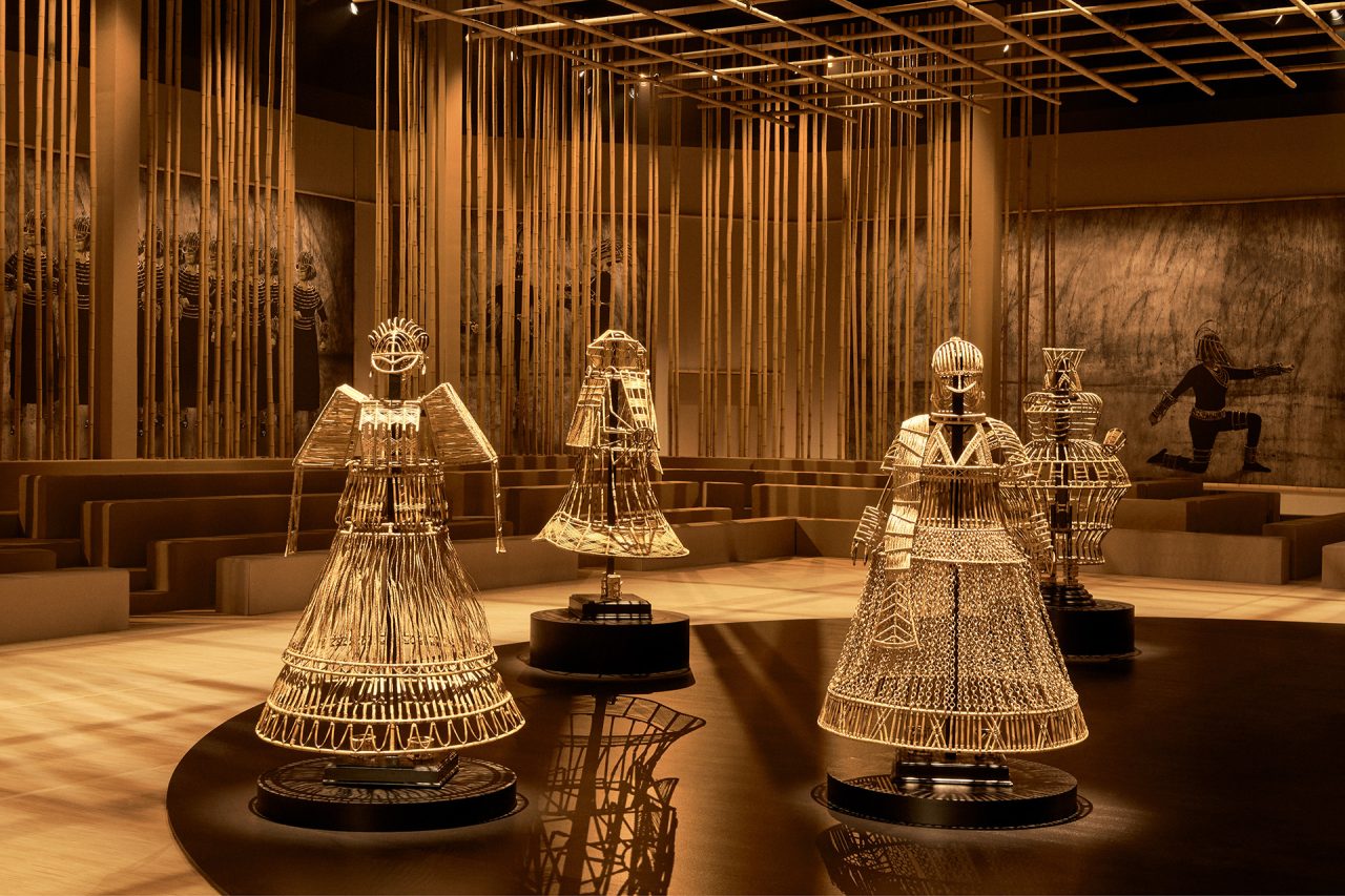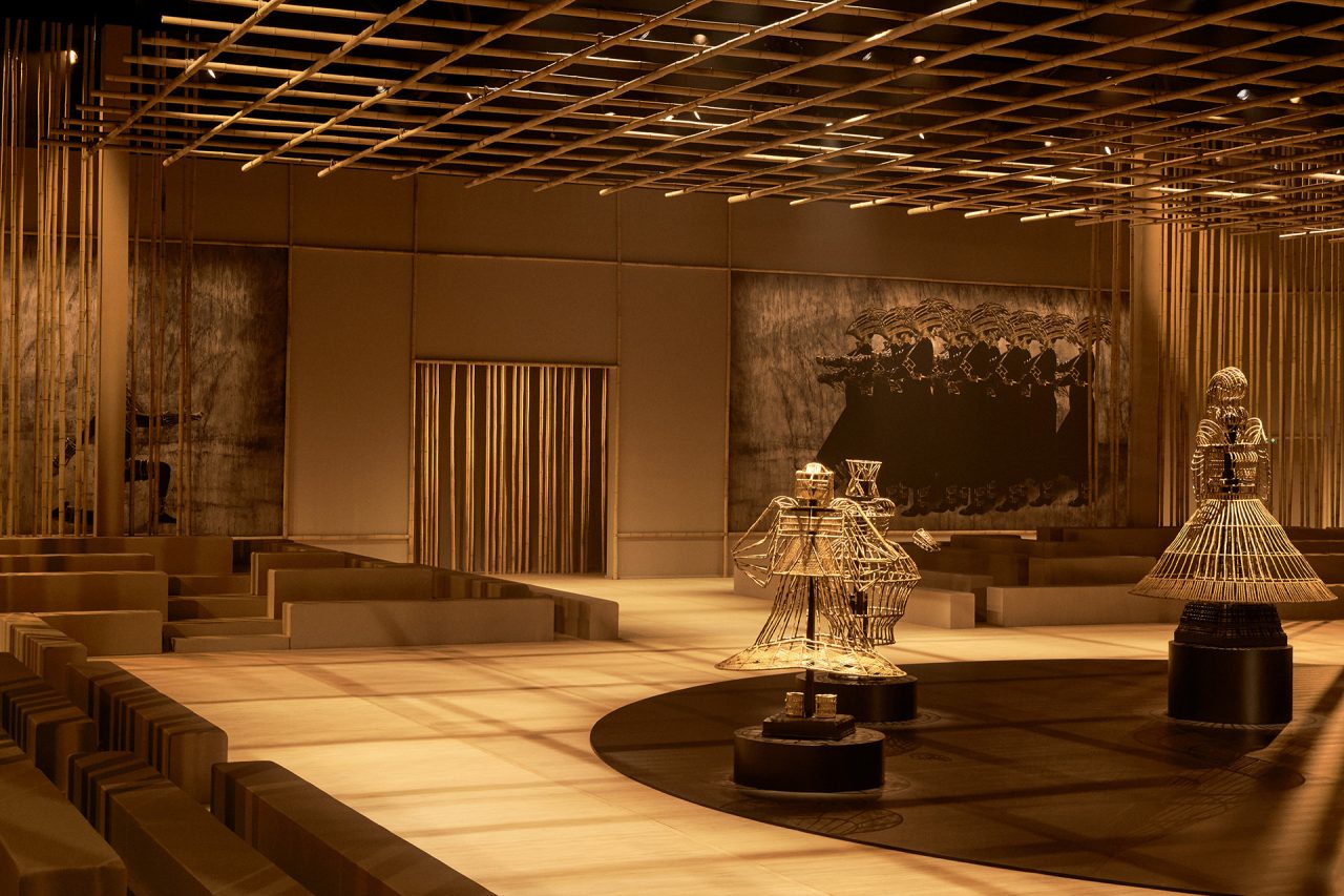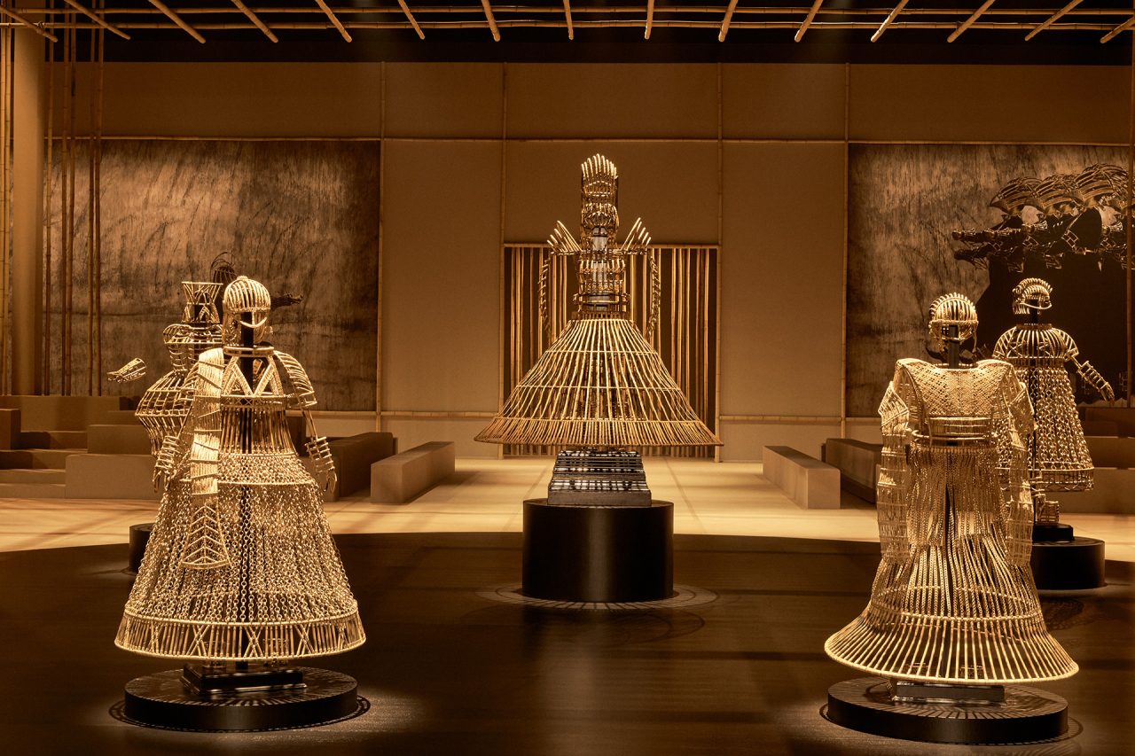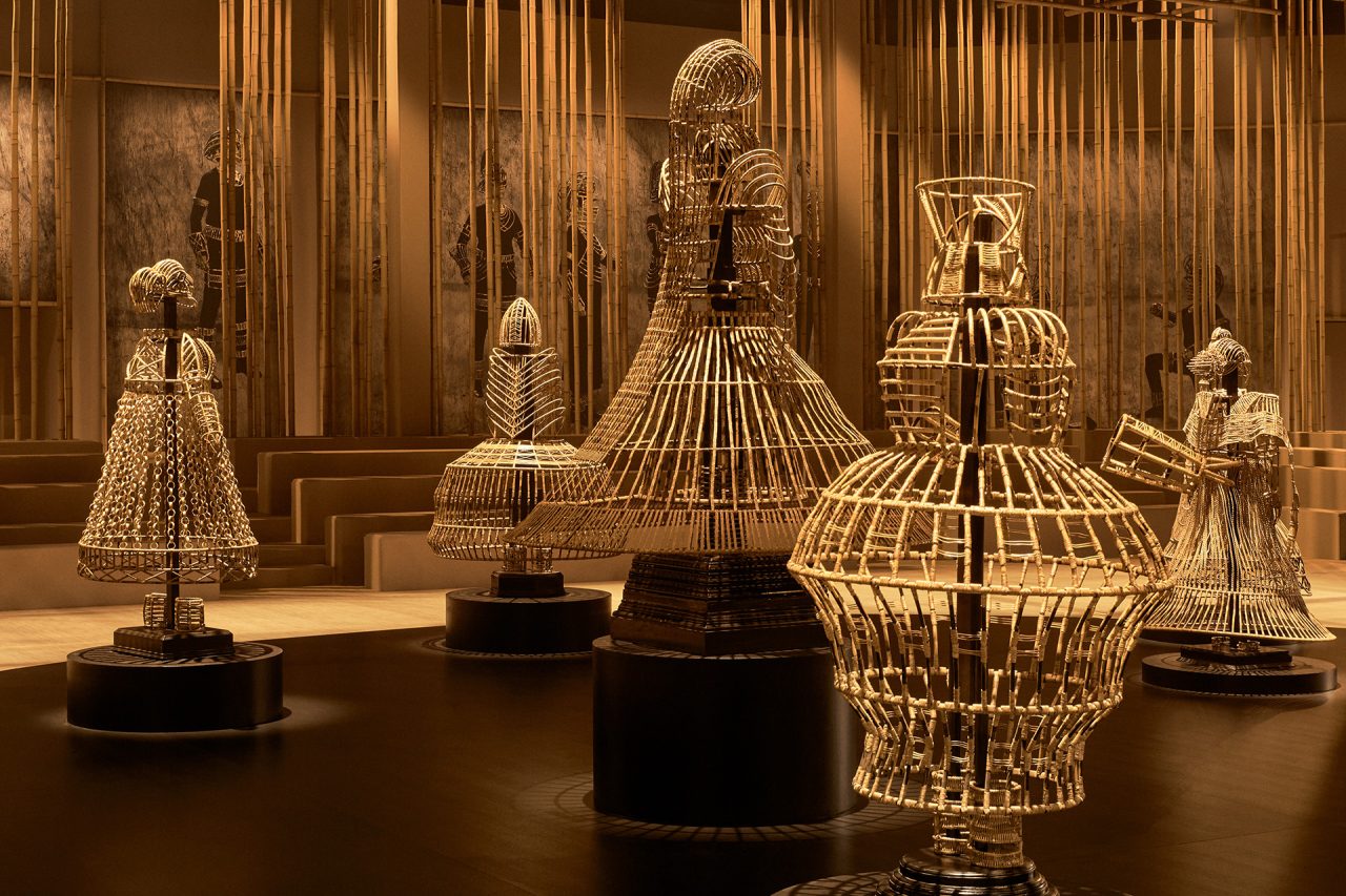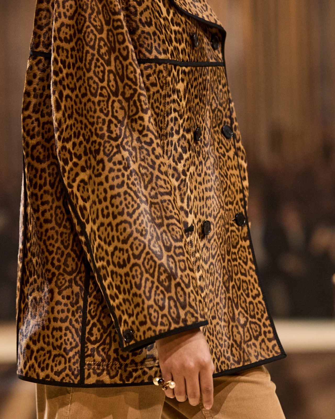 2016年の就任以来、現代を生きる女性たちに力強いメッセージを送り続ける Maria Grazia Chiuri。今回のコレクションでもその信条は変わらない。会場でまず来場者を迎えるのは、インド人アーティスト Shakuntala Kulkarni (シャクンタラ・クルカルニ) のインスタレーション作品だ。自身がデザインした籐製の甲冑を身に着けた Kulkarni の写真は、各々の「戦い」に向かう女性たちの決意を象徴するかのようだ。女性がファッションを通して自分自身を表現し始めた60年代に誕生したコレクションから着想を得ただけあって、ブラックのタートルネック、ミニスカート、レオパード柄など当時の流行をたっぷりと取り入れたランウェイとなった。