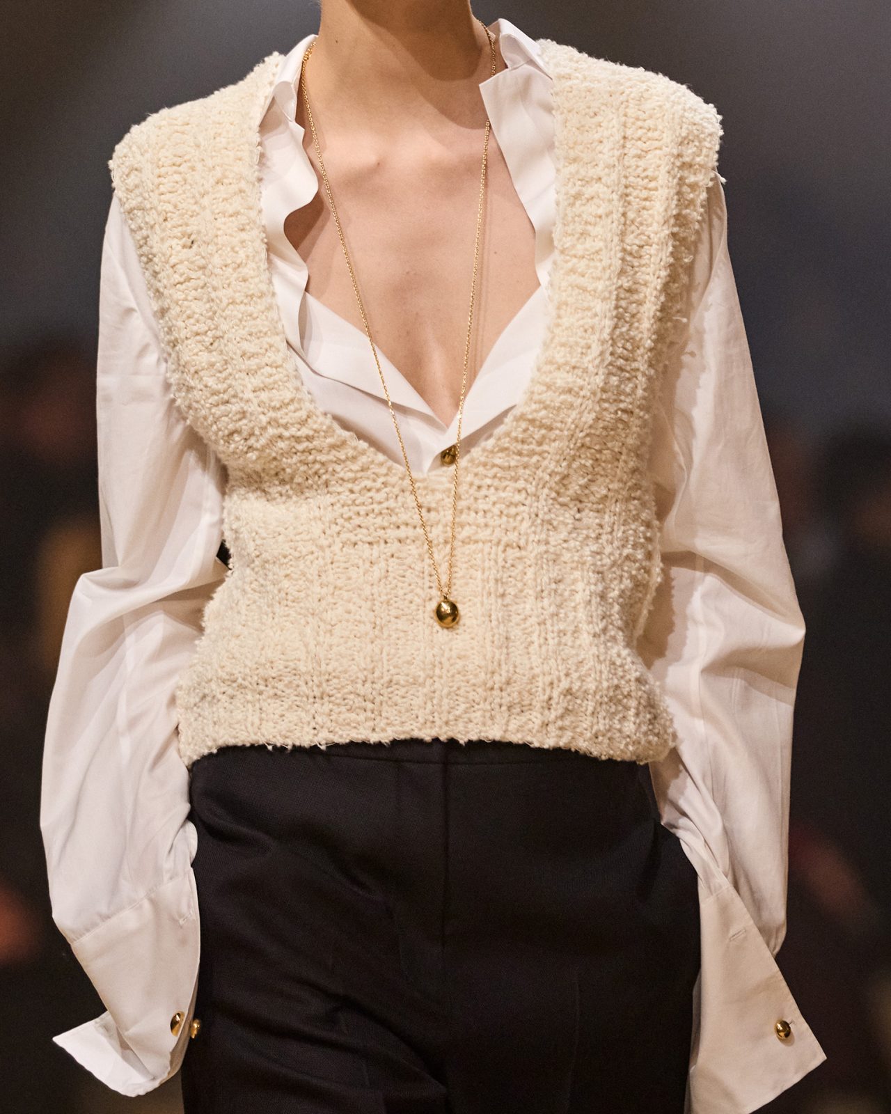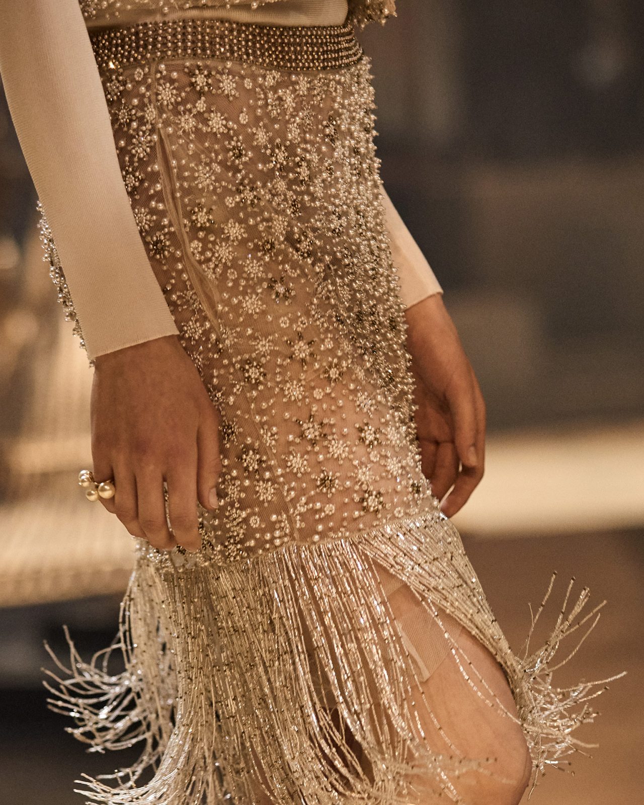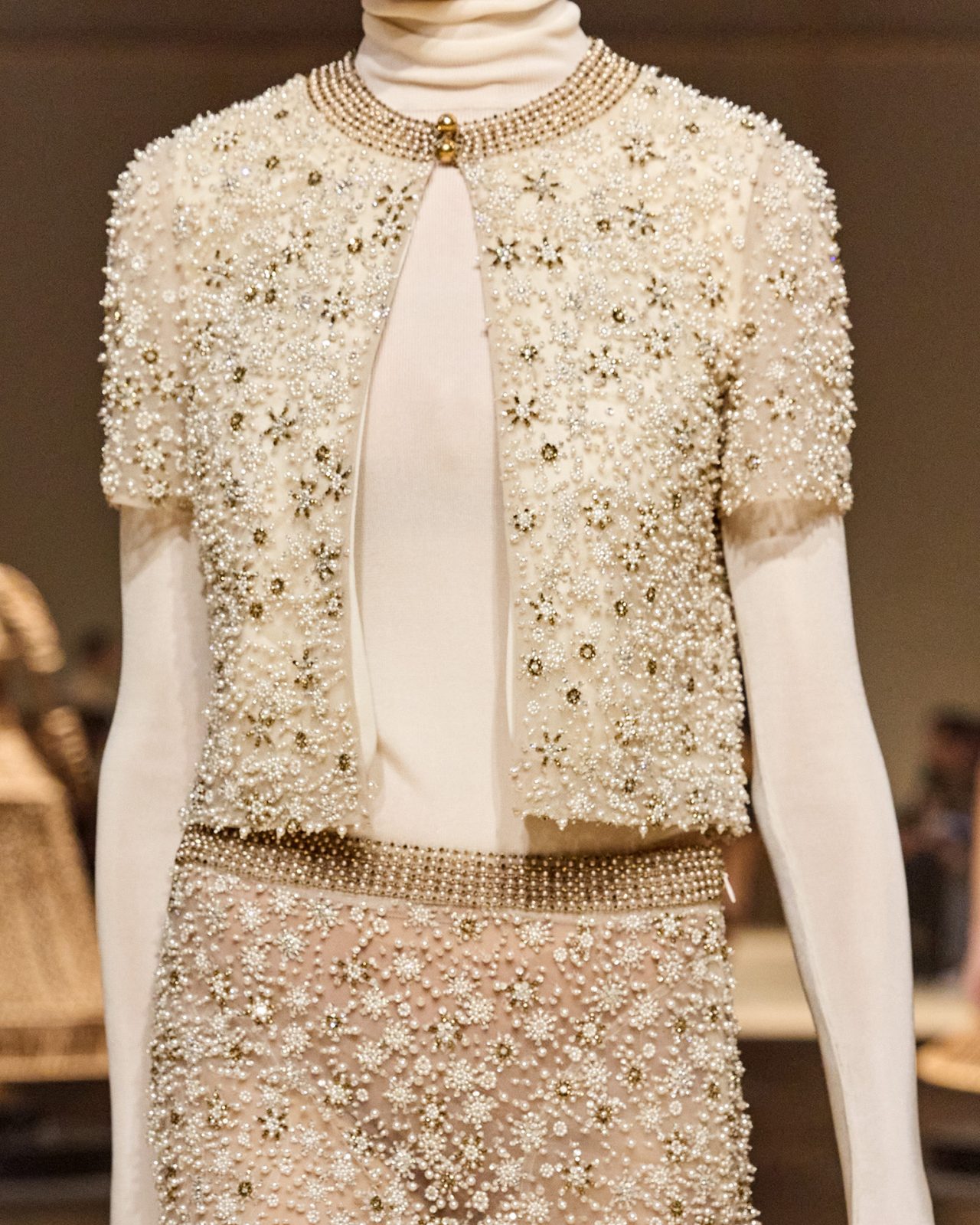 ショーの後半にさしかかると音楽がささやくようなバラードに変化し、ビーズの刺繍があしらわれたアイテムが次々に登場。ひとつひとつのシルエットやカラーはシンプルながら、輝くビーズによって思わず目を奪われてしまうルックとなっている。この刺繍はインドのチャーナキヤ工房の職人により手作業で施されたもの。細部にまでこだわりが凝縮され、Dior のサヴォワールフェールが光る。