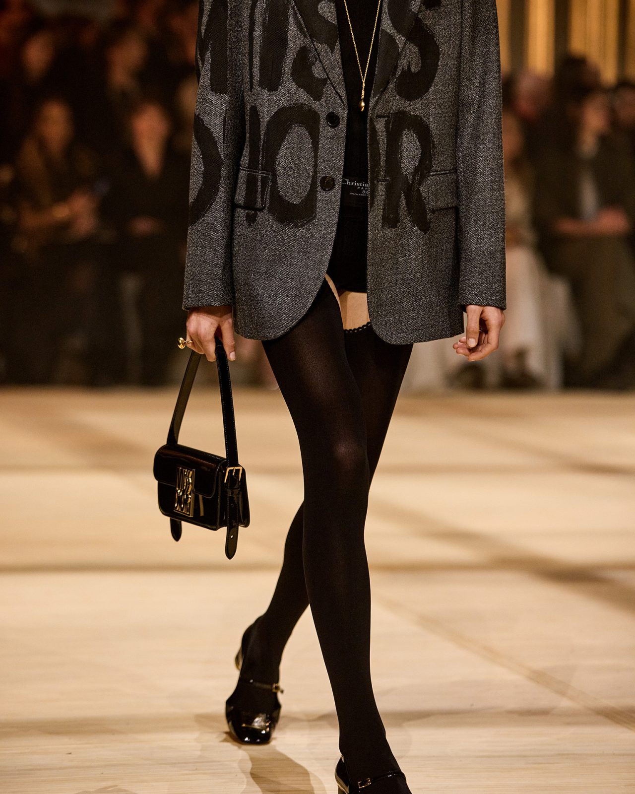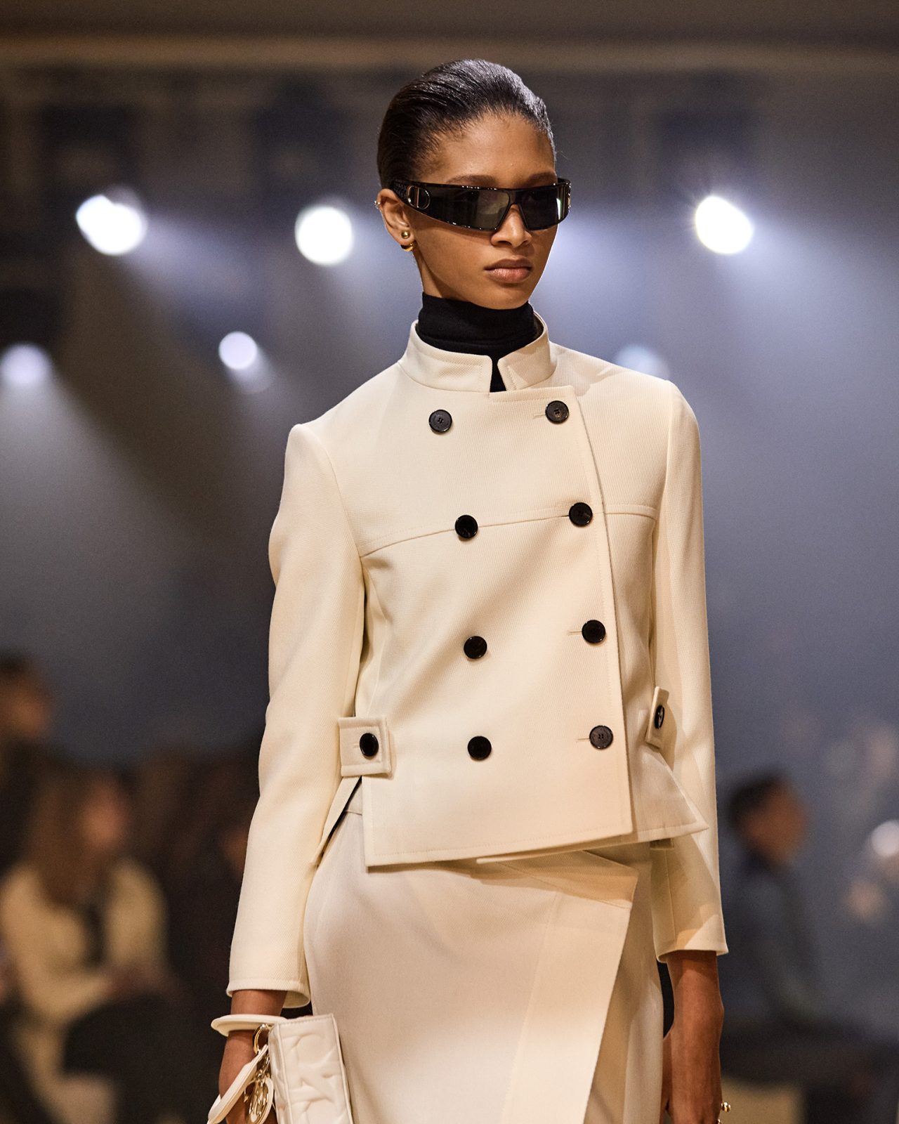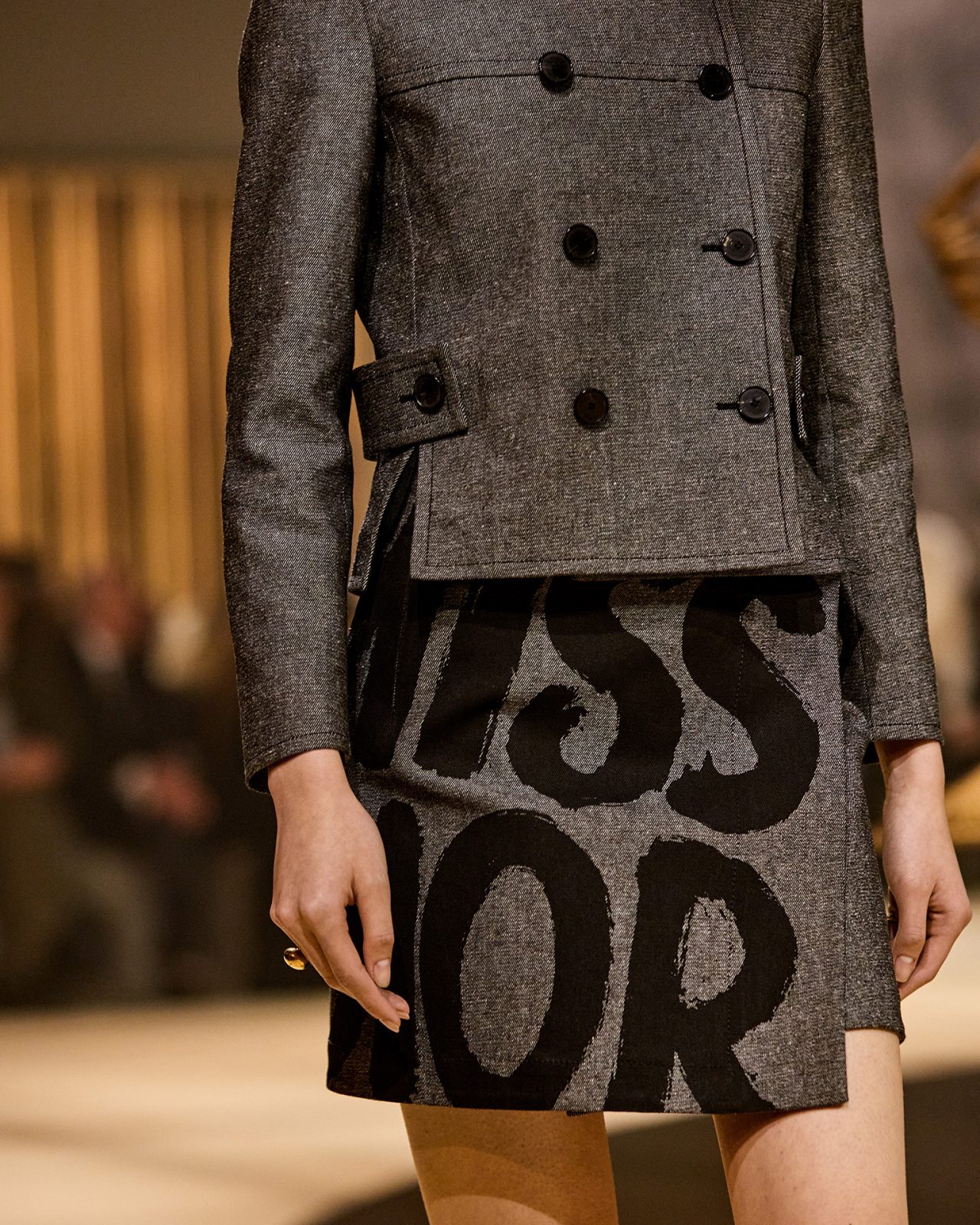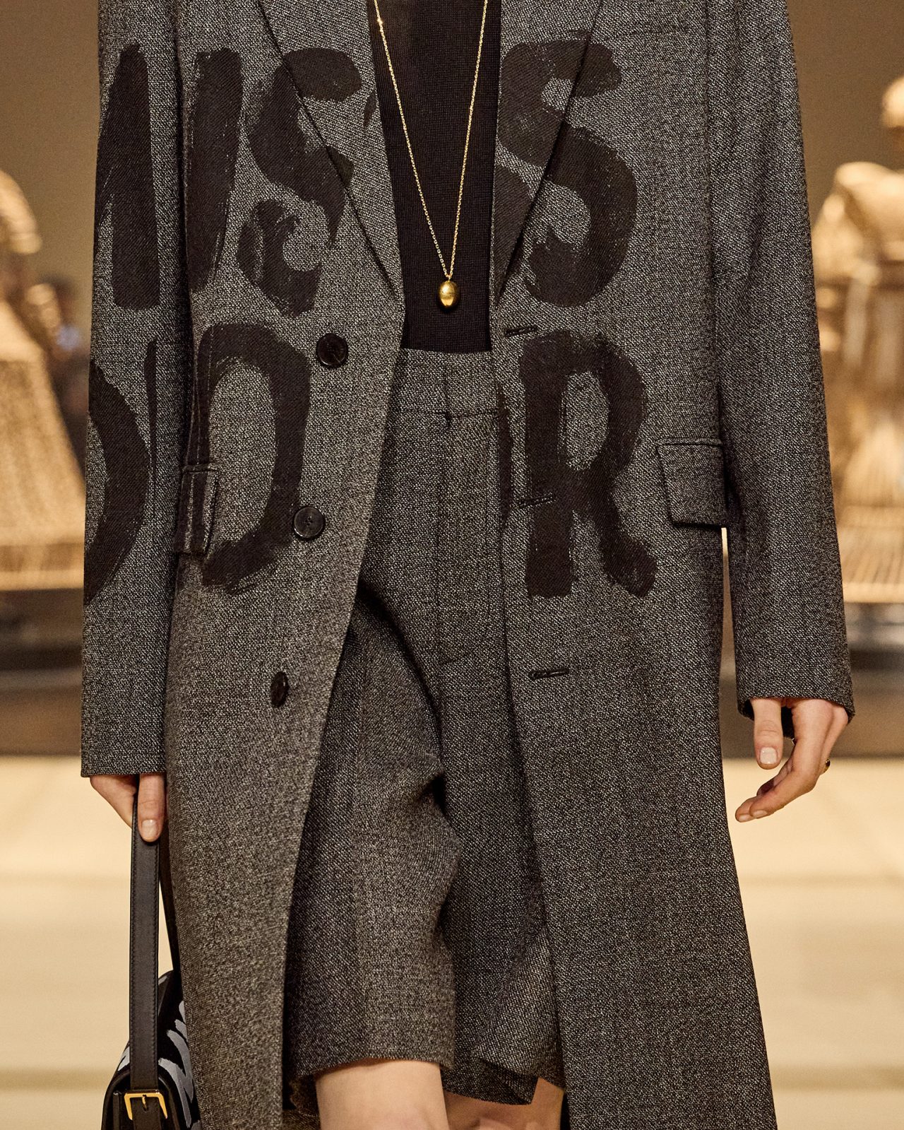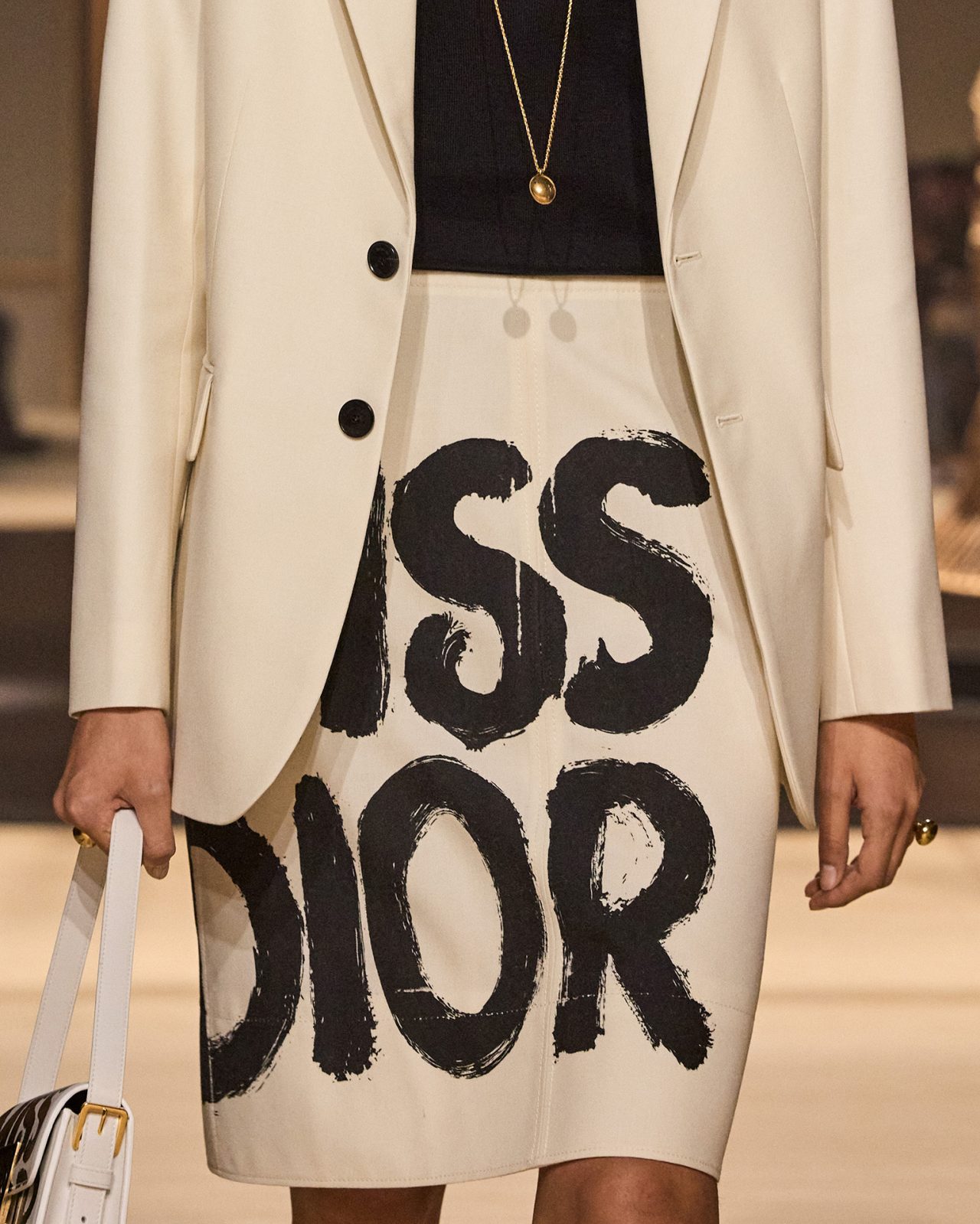 闘志をかき立てるように響き渡る打楽器の音色とともにショーは幕を開けた。冒頭にはベージュのギャバジン素材のトレンチコートやパンツスーツなどが登場。マスキュリンなアイテムを、流れるような質感とゆったりとしたシルエットでモダンに再解釈した。さらに本コレクションでひときわアイコニックだったのは、大胆な Miss Dior ロゴが入ったアイテム。手書き調の大きなロゴは街中のグラフィティペイントを思わせ、どこか挑戦的な雰囲気を放っている。