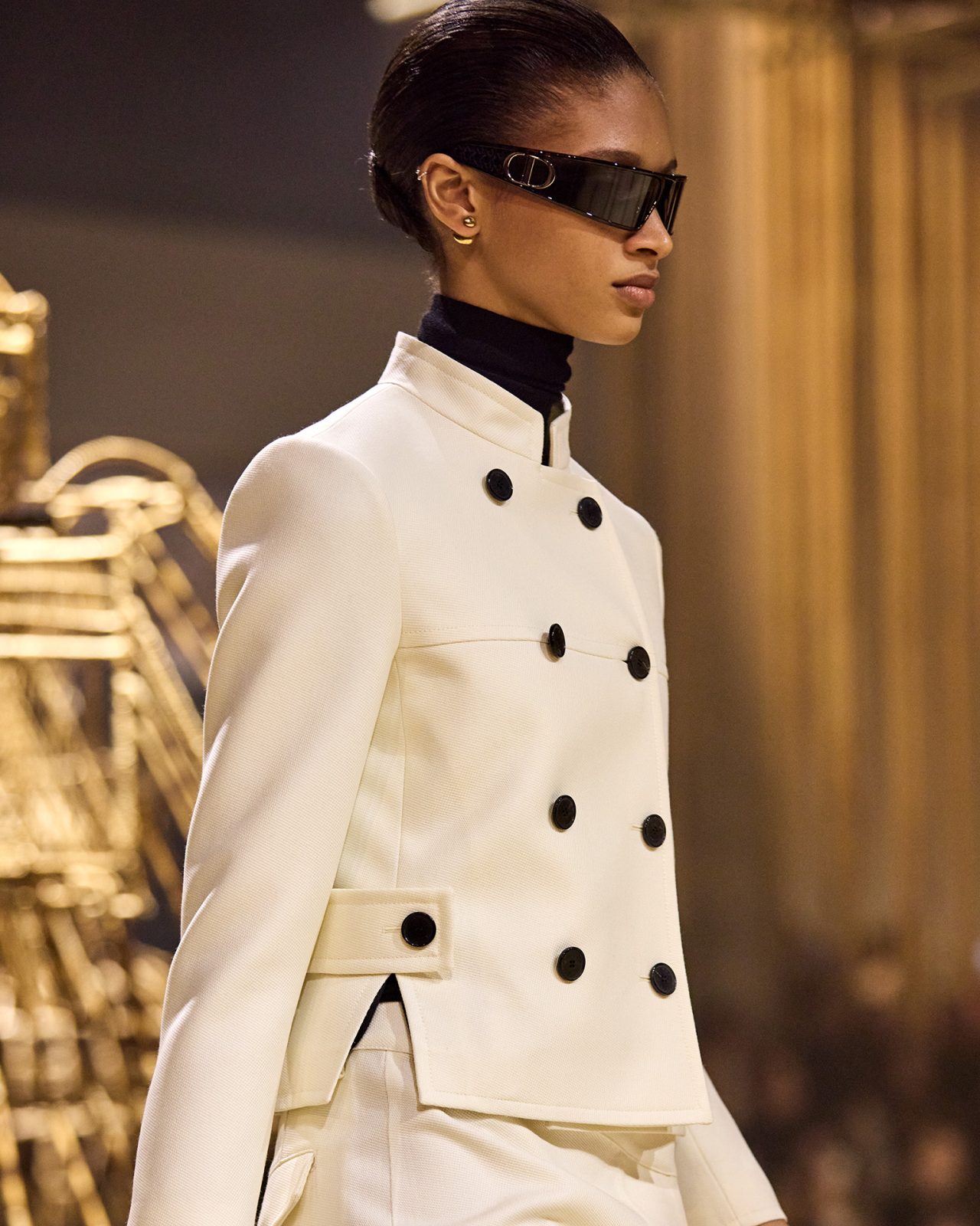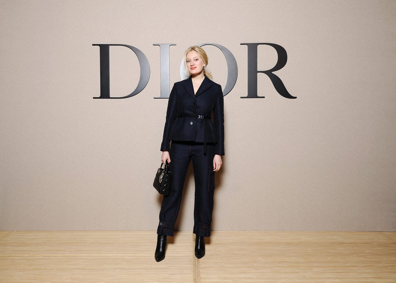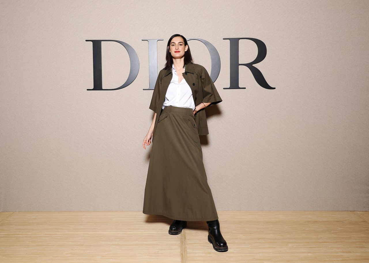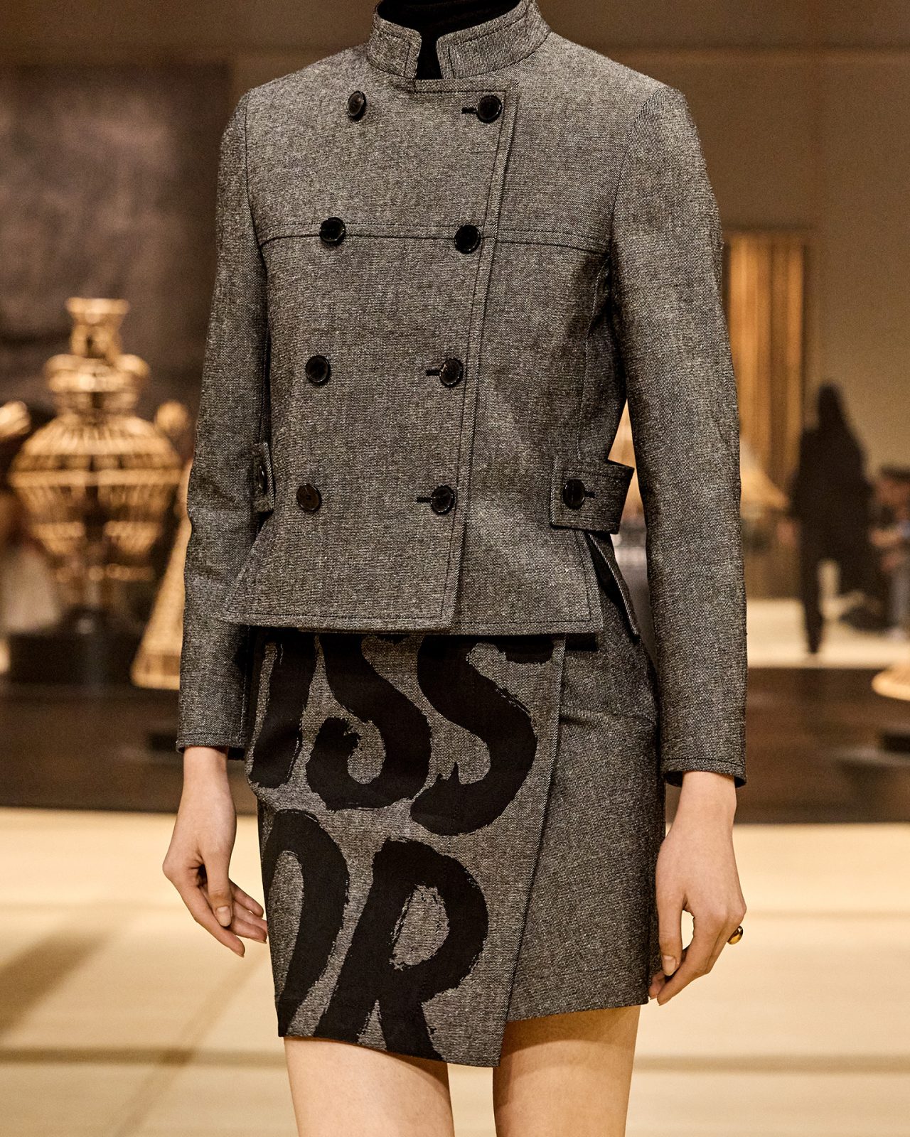 闘志をかき立てるように響き渡る打楽器の音色とともにショーは幕を開けた。冒頭にはベージュのギャバジン素材のトレンチコートやパンツスーツなどが登場。マスキュリンなアイテムを、流れるような質感とゆったりとしたシルエットでモダンに再解釈した。さらに本コレクションでひときわアイコニックだったのは、大胆な Miss Dior ロゴが入ったアイテム。手書き調の大きなロゴは街中のグラフィティペイントを思わせ、どこか挑戦的な雰囲気を放っている。
