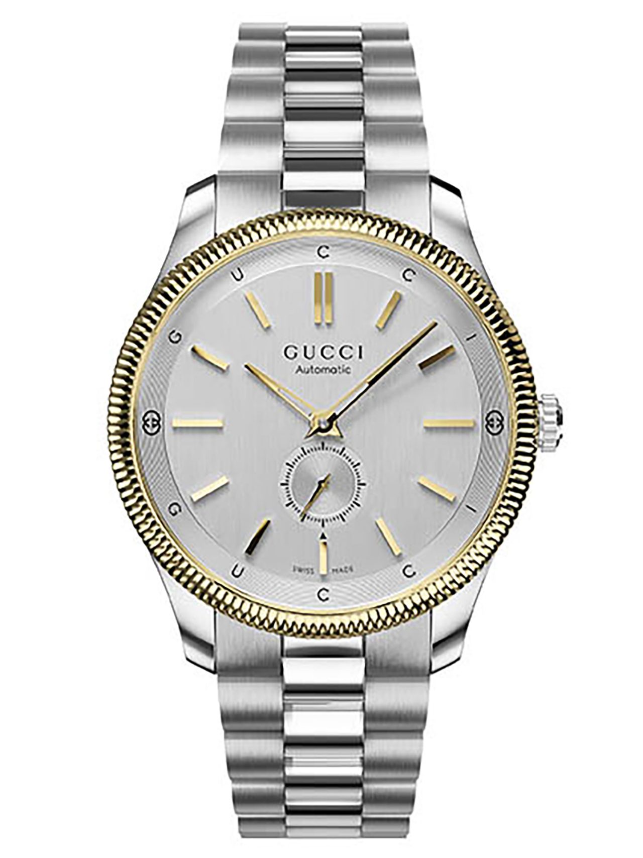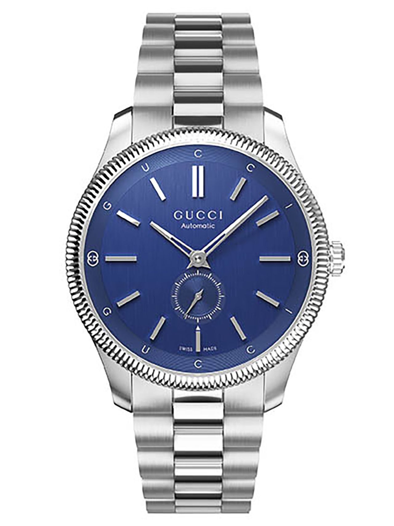 数ある GUCCI のウォッチの中でも、あらゆるシチュエーションになじむ洗練されたデザインが魅力の 「G-タイムレス」。今回、このウォッチがコンテンポラリーな進化を遂げた。文字盤はシンプルながら円周に GUCCI の文字とインターロッキング G モチーフがあしらわれ、さらにベゼルに刻まれたリッジが華やかさを加える。このコレクションではサイズが2種展開され、40 mm ケースのモデルはスチール × ブラック、スチール × ブルー、ゴールド × シルバーの3色を展開。どれもスイス製オートマティックムーブメントを搭載しているため電池交換の必要がなく、透明なケースバックから歯車のムーブメントが見えるデザインを採用している。