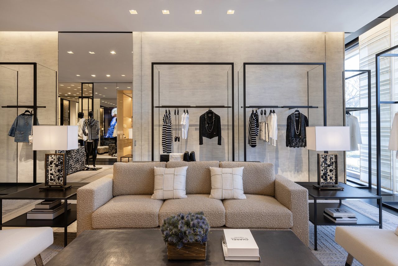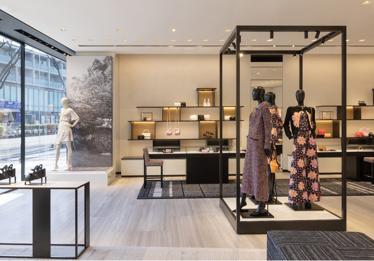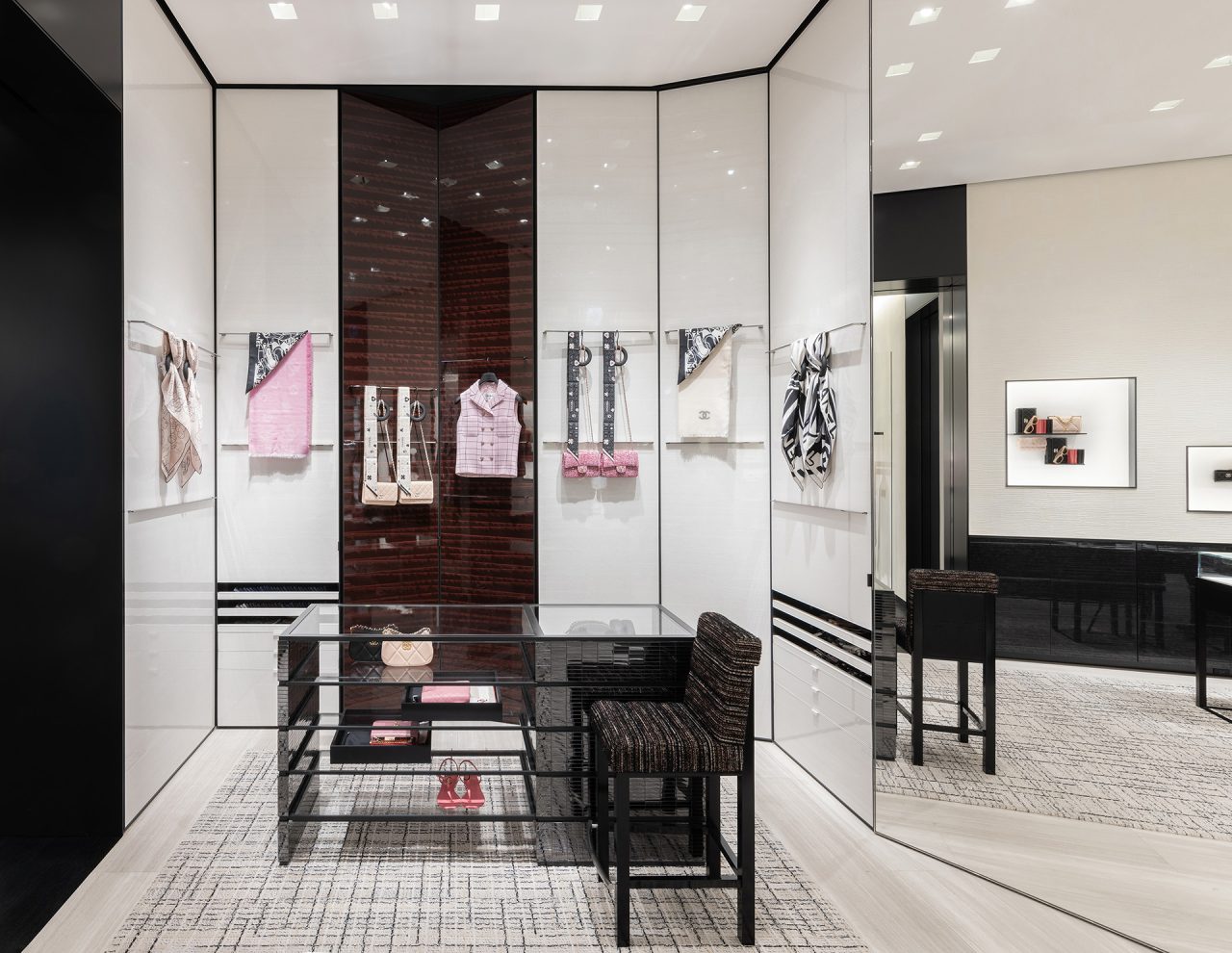 2階に上がると、ゆったりとしたフィッティングルームを備えたプレタポルテ専用のサロンに迎えられる。ツイードのソファやカスタムメイドのカーペットをしつらえたこの居心地のよい空間は、ブラック、ホワイト、ベージュを基調としており、創業者 Gabrielle Chanel (ガブリエル・シャネル) がパリに所有していた美しいアパルトマンを思い起こさせる。メゾンの美学と親密さを見事に両立したこのブティックに、ぜひ足を運んでみては。