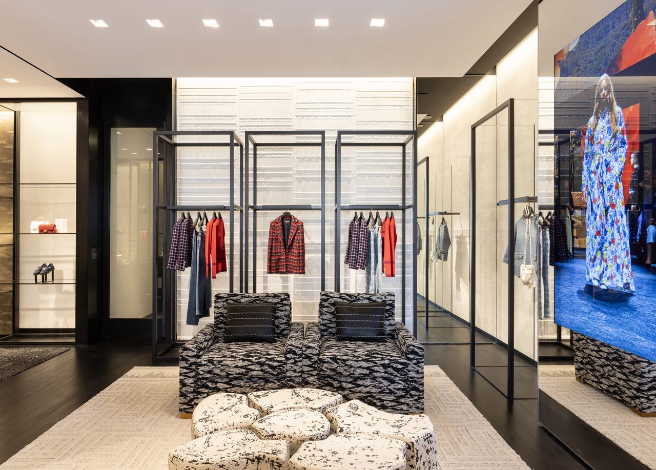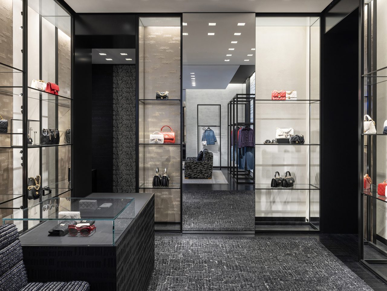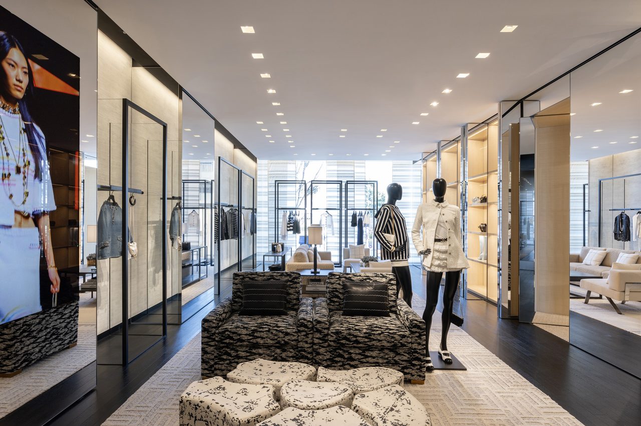 2階に上がると、ゆったりとしたフィッティングルームを備えたプレタポルテ専用のサロンに迎えられる。ツイードのソファやカスタムメイドのカーペットをしつらえたこの居心地のよい空間は、ブラック、ホワイト、ベージュを基調としており、創業者 Gabrielle Chanel (ガブリエル・シャネル) がパリに所有していた美しいアパルトマンを思い起こさせる。メゾンの美学と親密さを見事に両立したこのブティックに、ぜひ足を運んでみては。