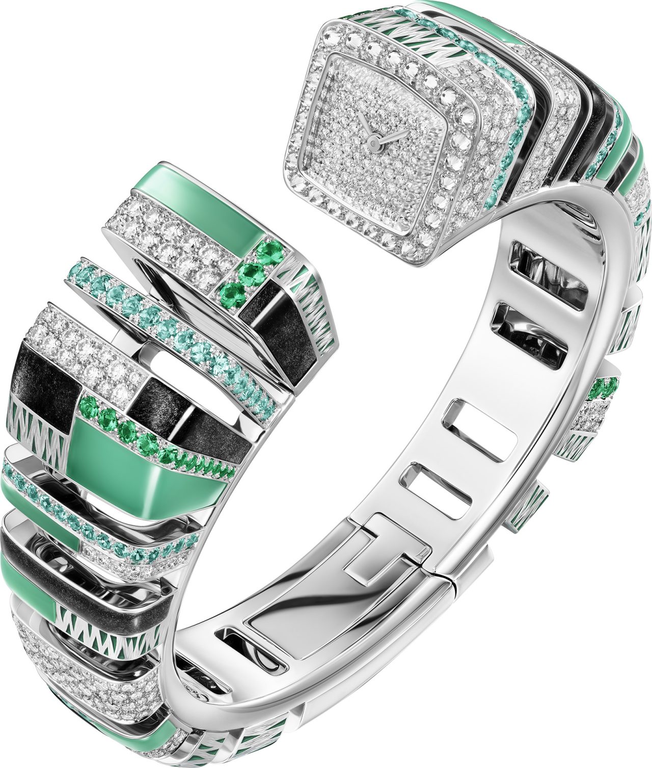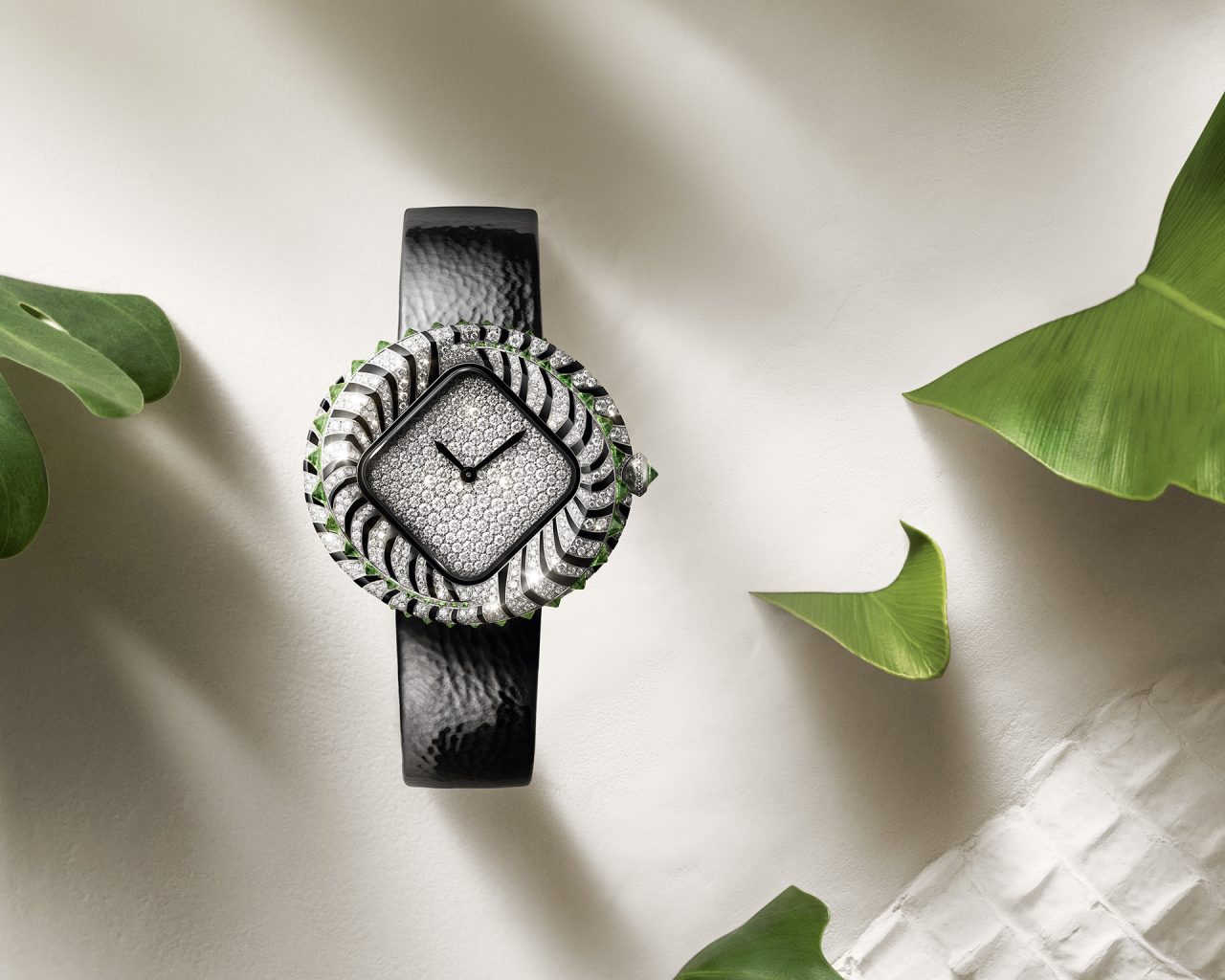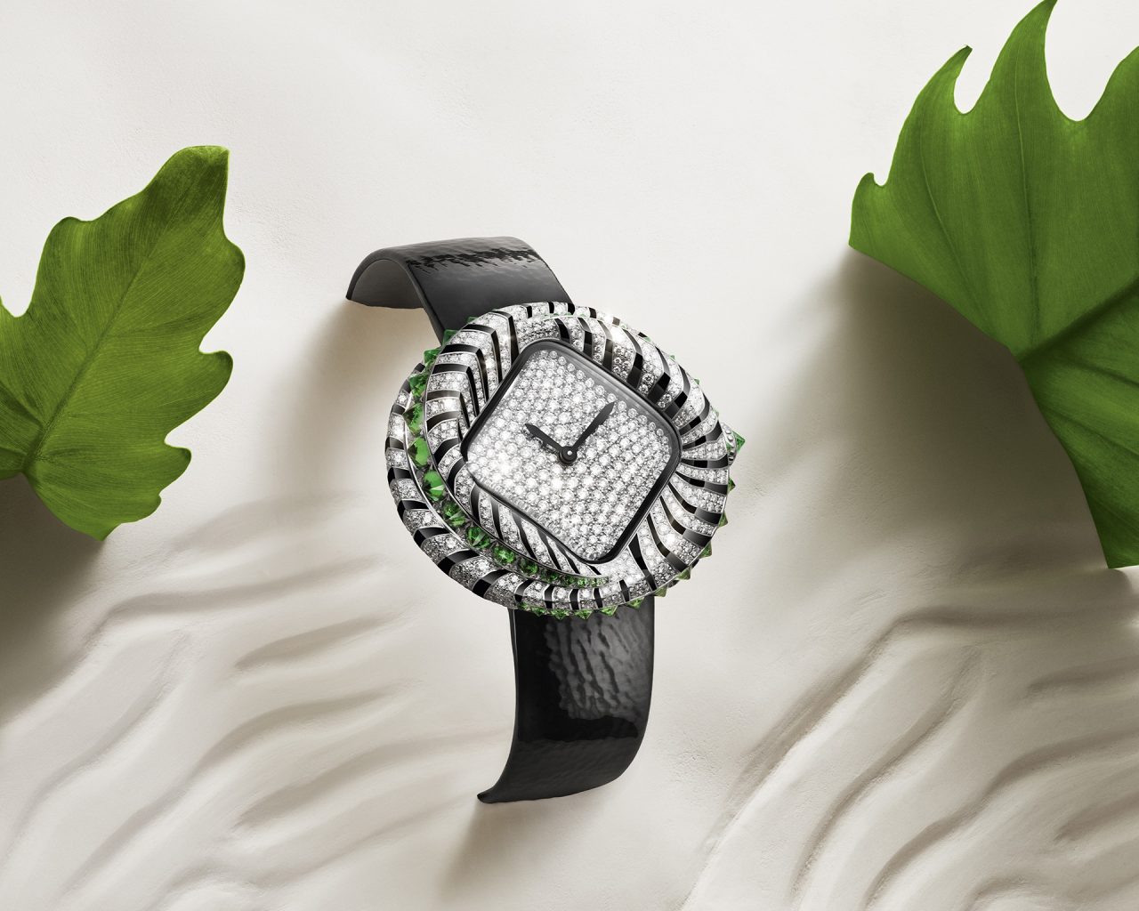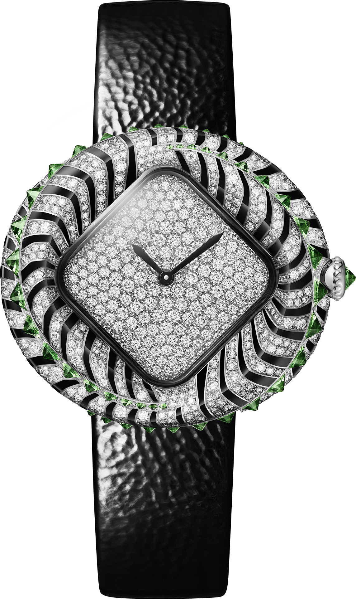「アニマル ジュエリー ウォッチ」にはシマウマとワニが融合した空想上の動物をモチーフとして取り入れた。カラーストーンの一つ一つに施された繊細な彫刻作業にメゾンのサヴォアフェールが光る。