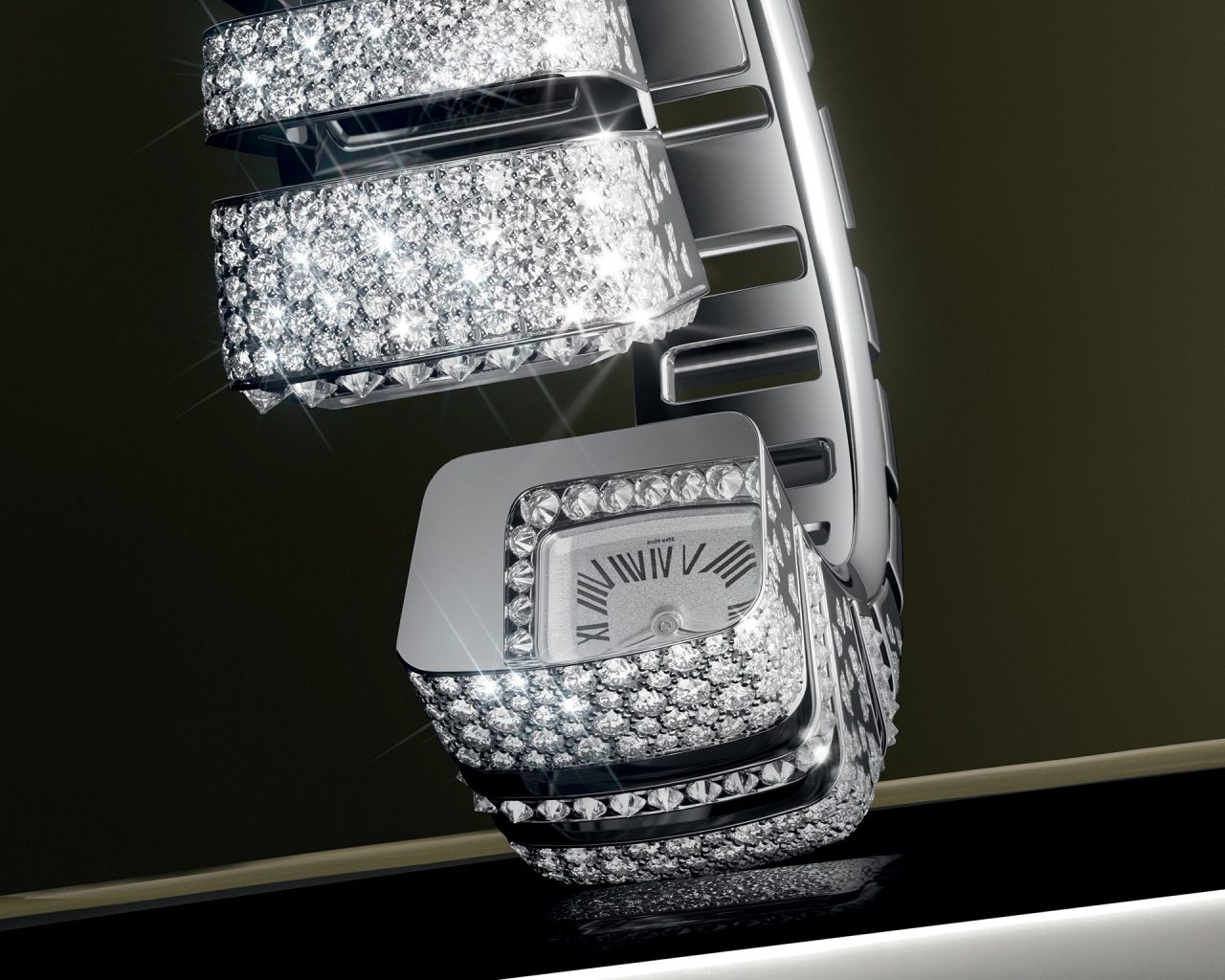 「リフレクション ドゥ カルティエ」ウォッチは繊細な文字盤と鏡が向かい合い、まるで時が逆さまになったかのように見えるデザイン。斬新なオープンブレスレットのフォルムにクリスタルが散りばめられ、メゾンのウォッチとジュエリーを結ぶアイテムとなっている。