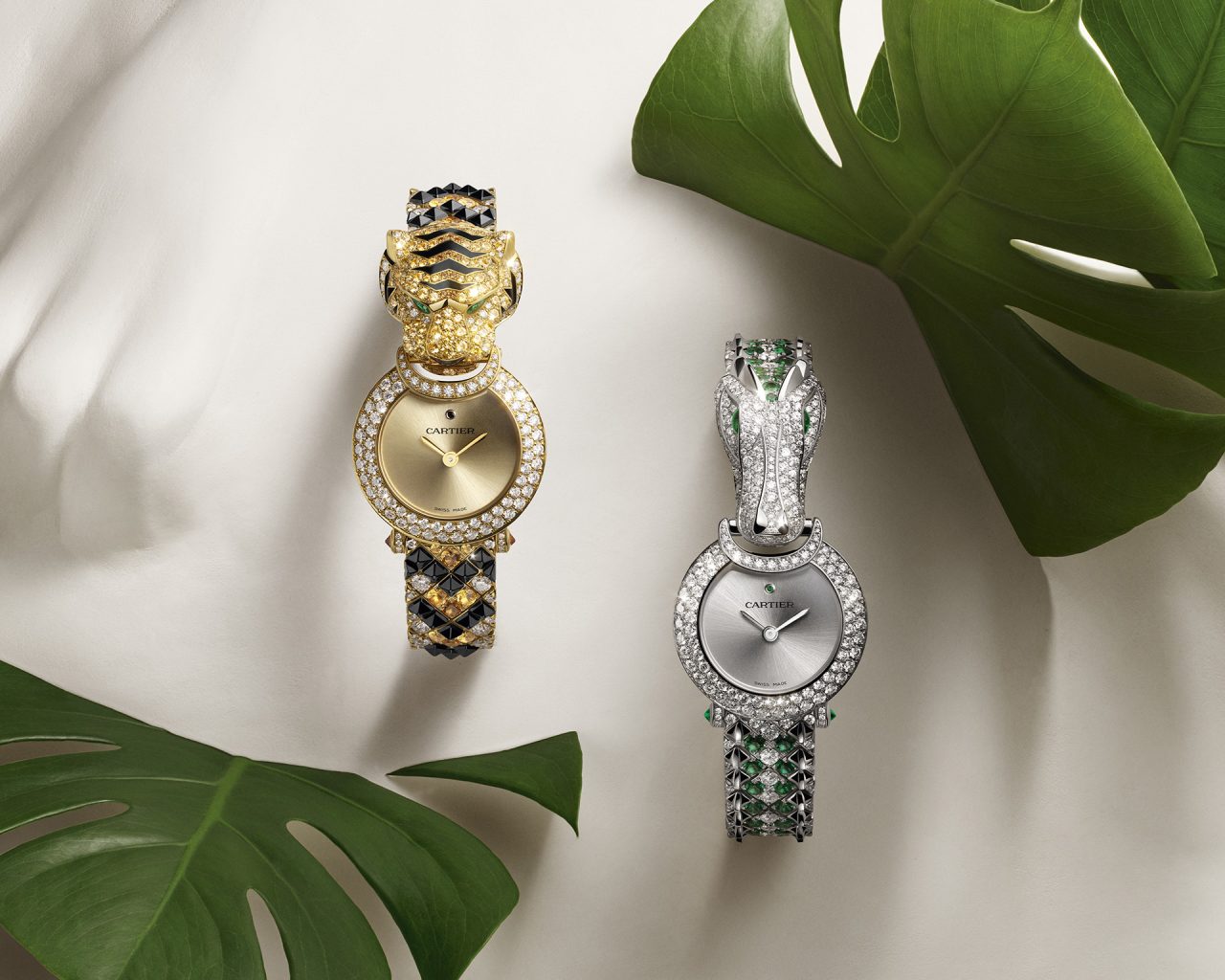 「タイガー ジュエリー ウォッチ」(左)、「クロコダイル ジュエリー ウォッチ」(右) | © Cartier © MAUD REMY LONVIS