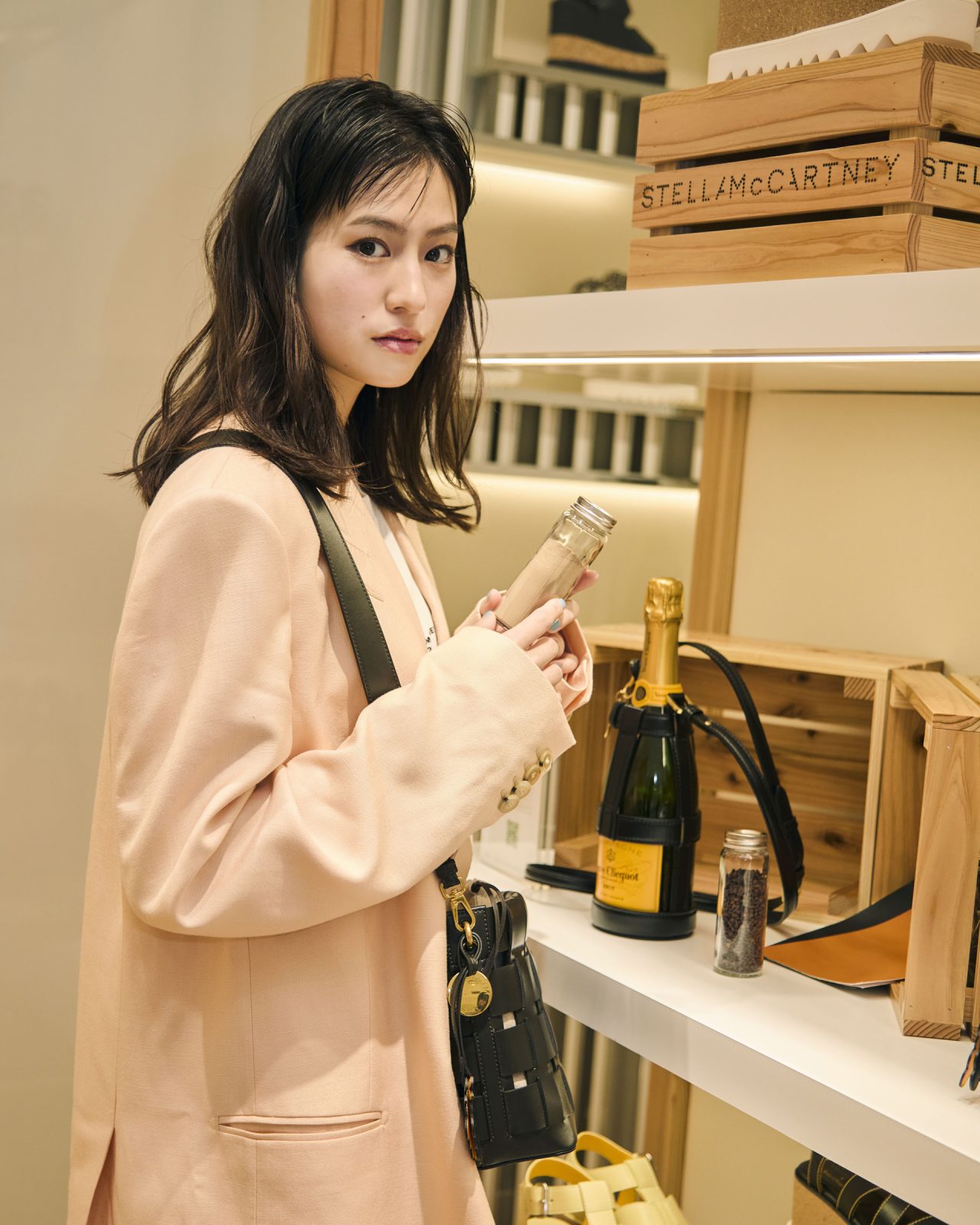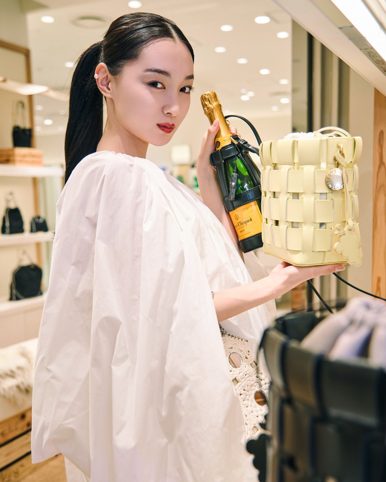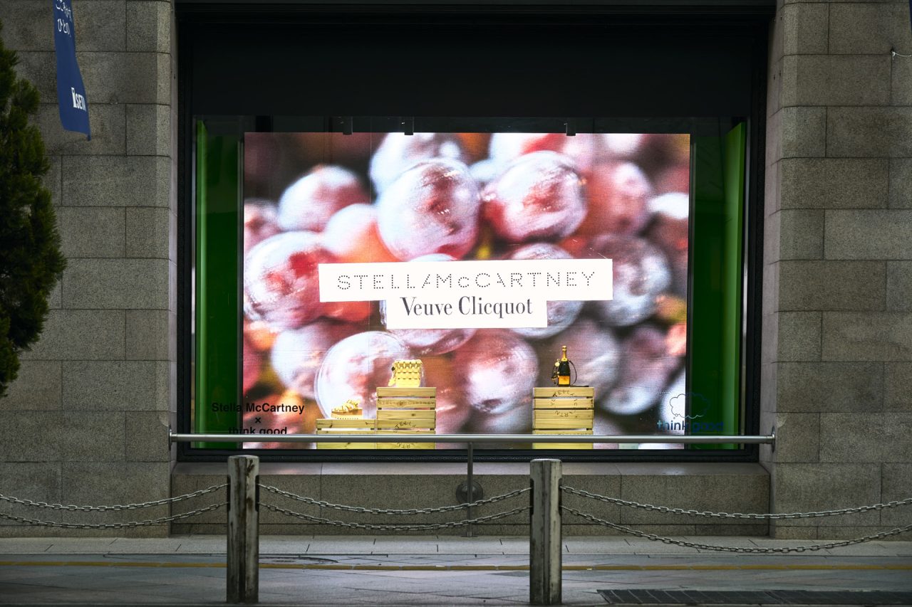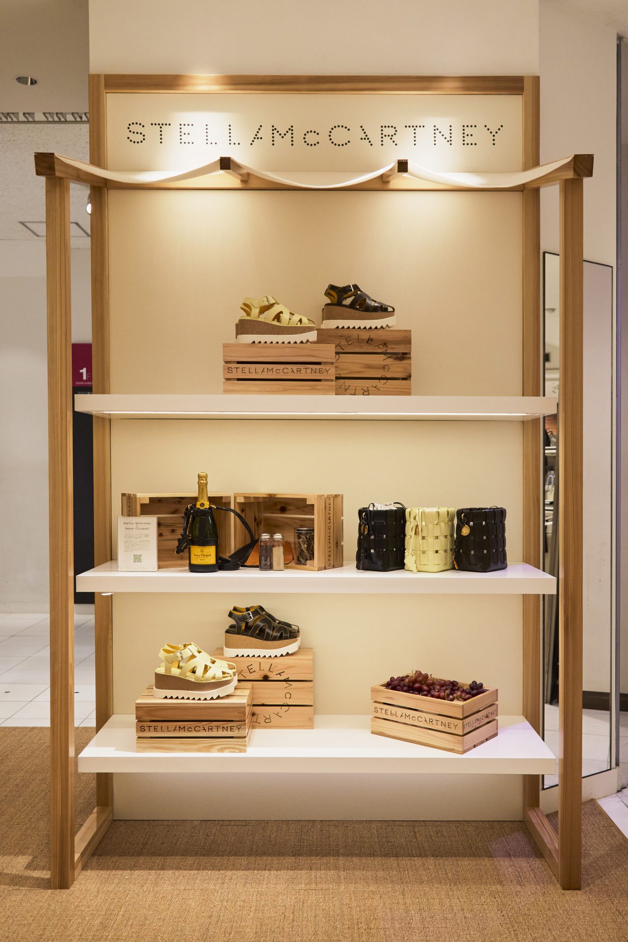 1階プロモーションスペースでは、フランスのシャンパーニュ・メゾン Veuve Clicquot (ヴーヴ・クリコ) とのコラボレーションアイテムを先行発売。シャンパンを製造する過程で排出される廃棄ブドウを原料とした素材 VEGEA® (べジア) を使用したヴィーガンレザーが用いられたコレクションで、ハンドバッグ、シューズ、アクセサリーがラインナップする。そのほか、植物由来でプラスチックを使用していない世界初の完全循環型素材 MIRUM®︎ (ミラム) や、北イタリアの廃棄リンゴから作る APPEAL™ (アピール) といったサステナブル素材を用いたアイテムも登場する。