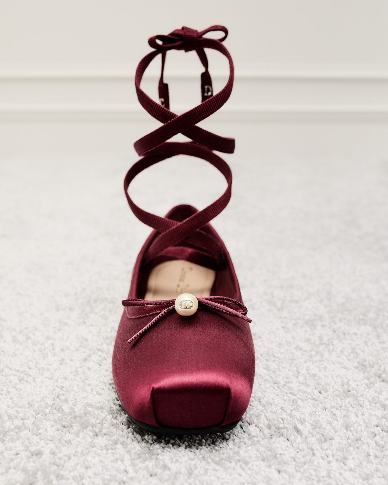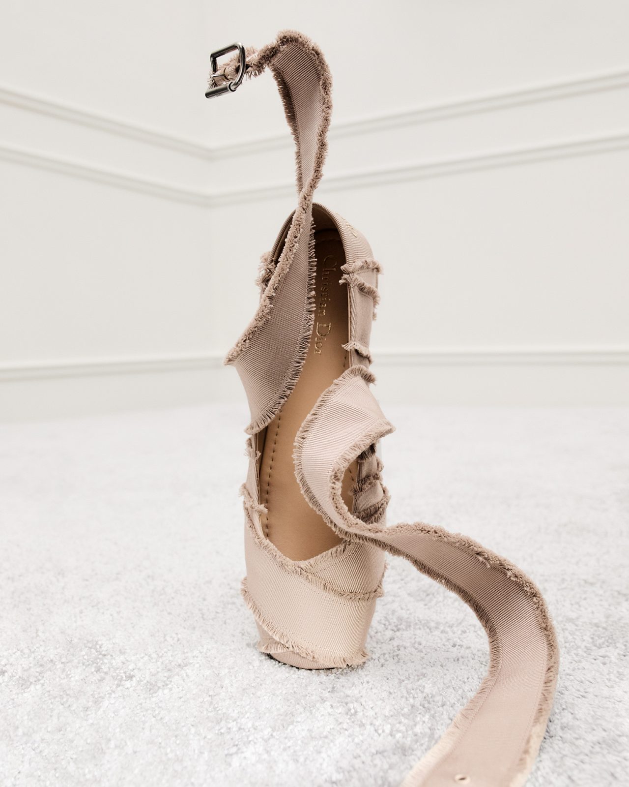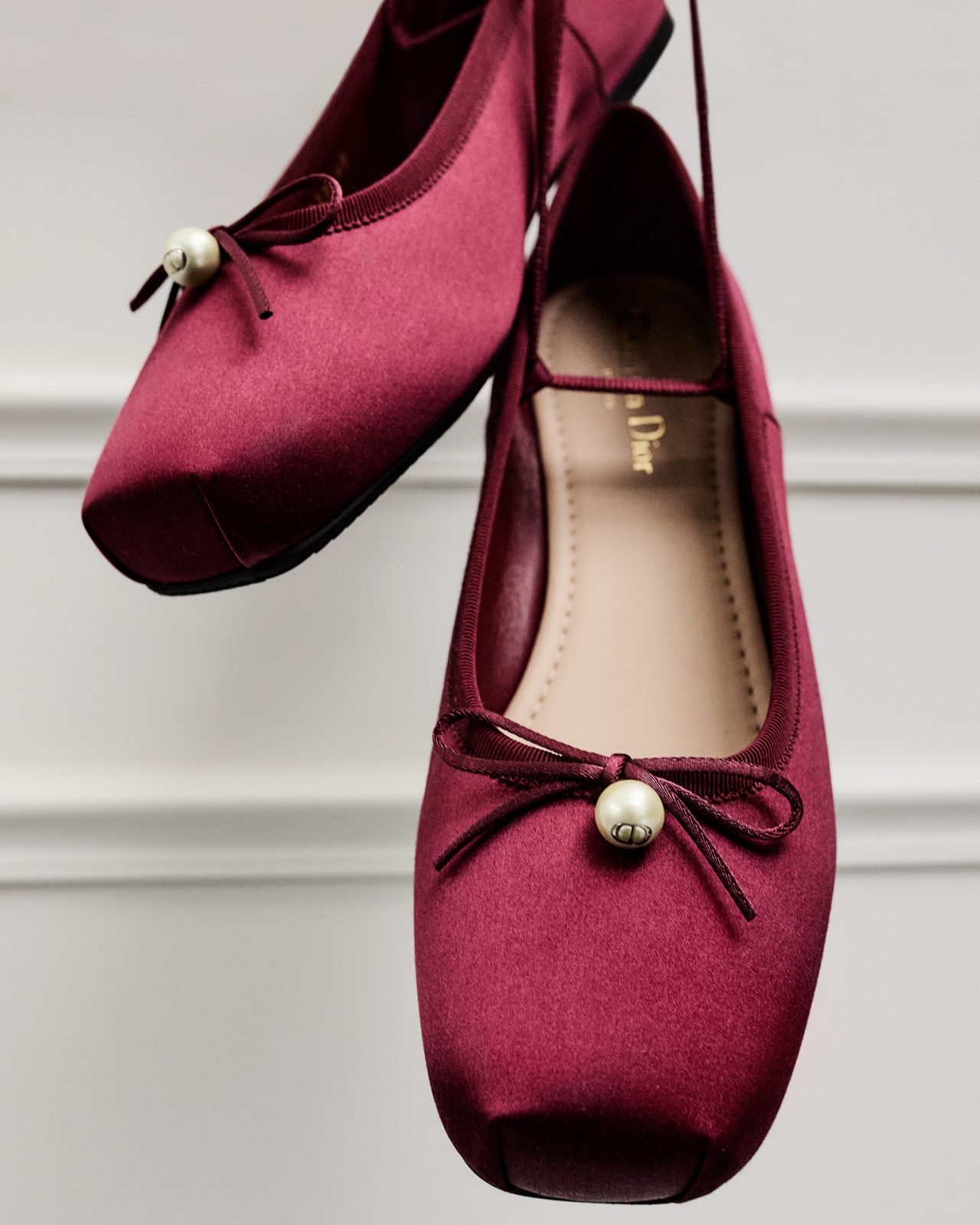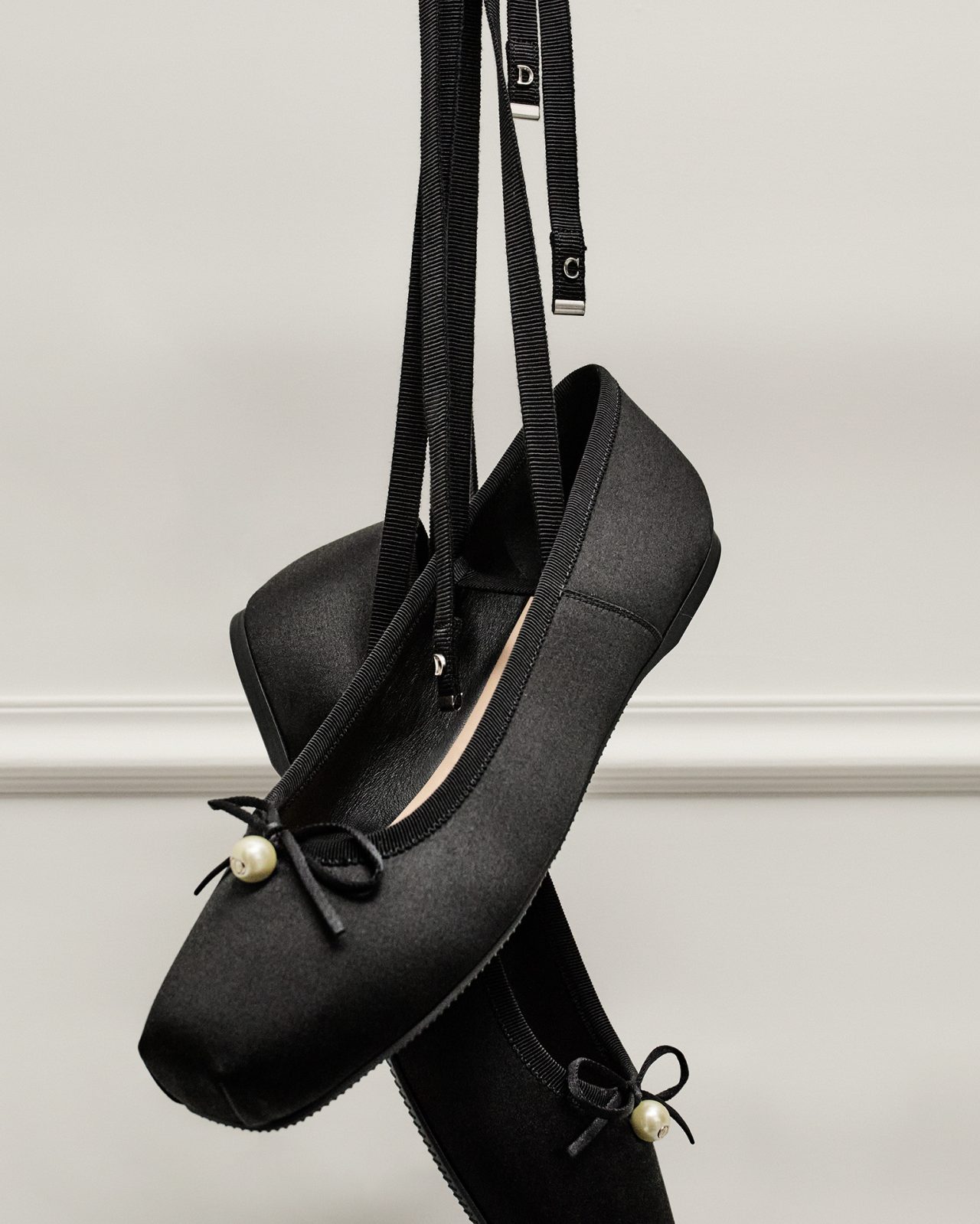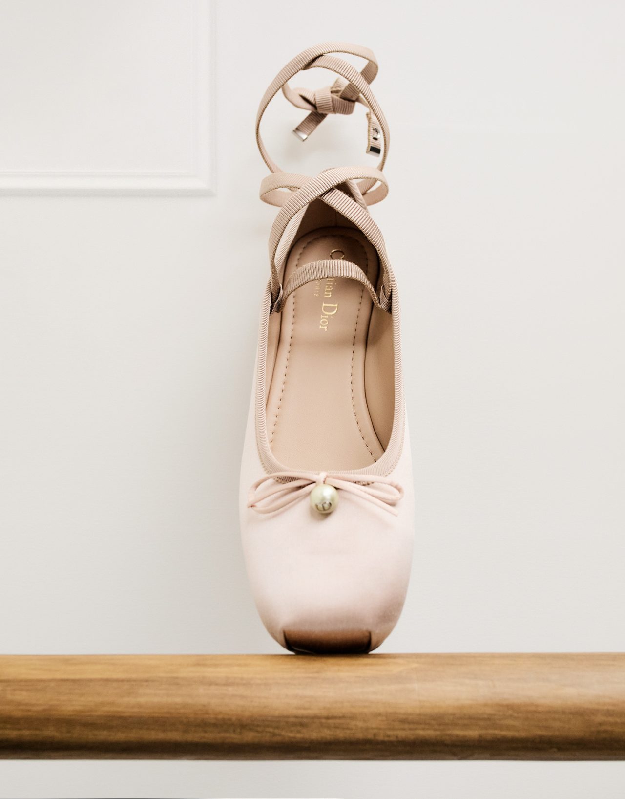 クラシックバレエは Maria Grazia Chiuri (マリア・グラツィア・キウリ)、そして創設者 Chirstian Dior (クリスチャン・ディオール) が情熱を注いできた芸術表現のひとつ。2024年春夏コレクションで発表されたバレリーナシューズ2型は、バレエの多面的な美しさを讃えたものである。サテン素材の「D-ジョイ」にはレジンパールと繊細なリボンが施され、取り外し可能なシューレースに「CD」の文字があしらわれた。「ディオール ソンジュ」はフレイド仕上げのグログランリボンを使用しており、メゾンの卓越した技術とともに、きらびやかなだけではないバレエの美しさが感じられる。