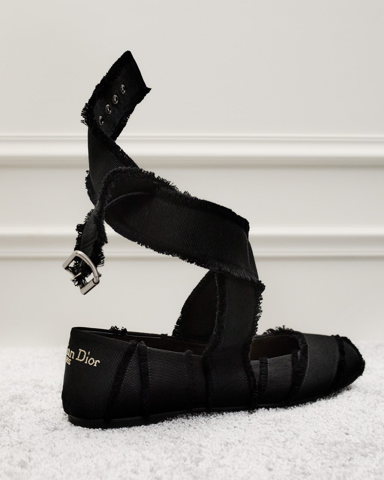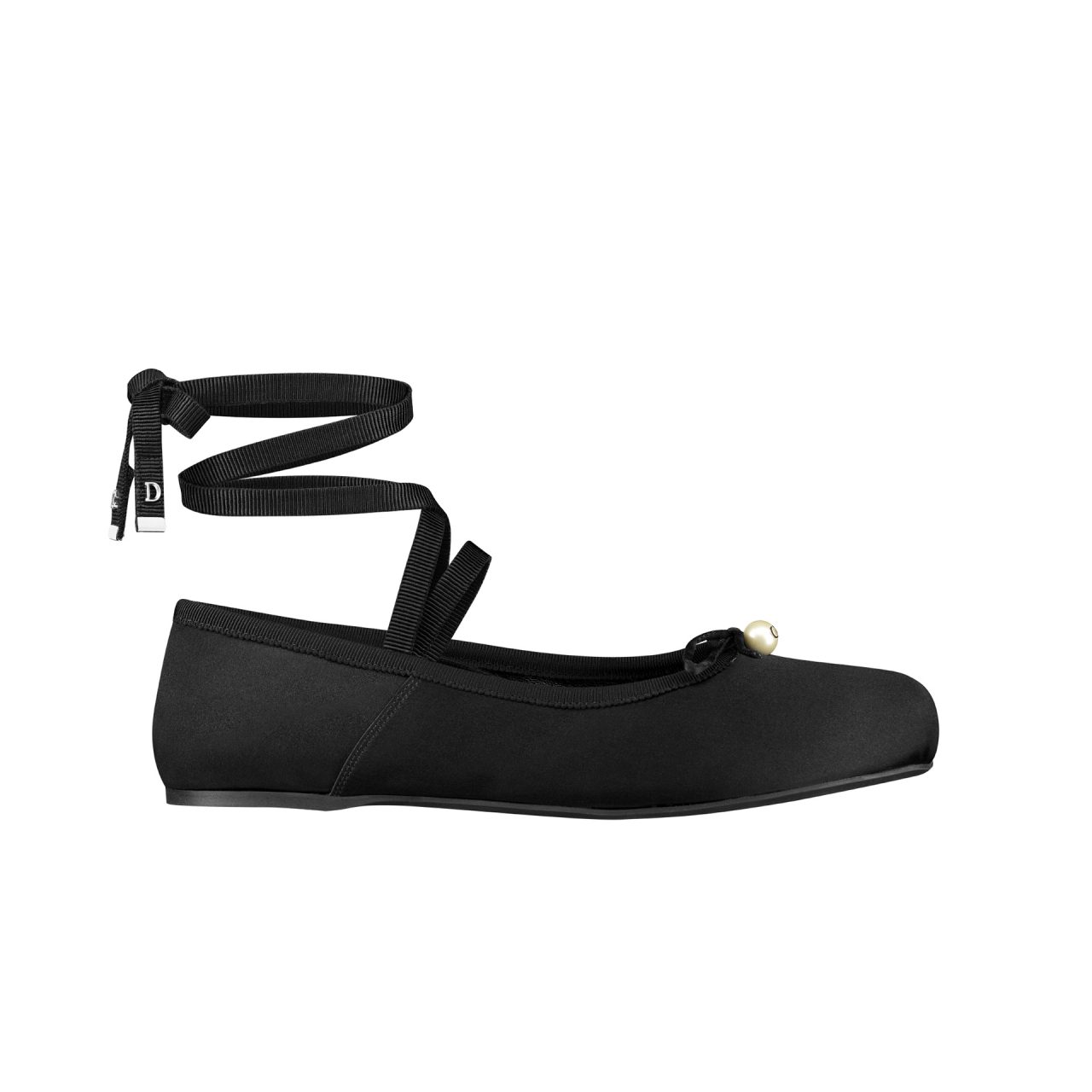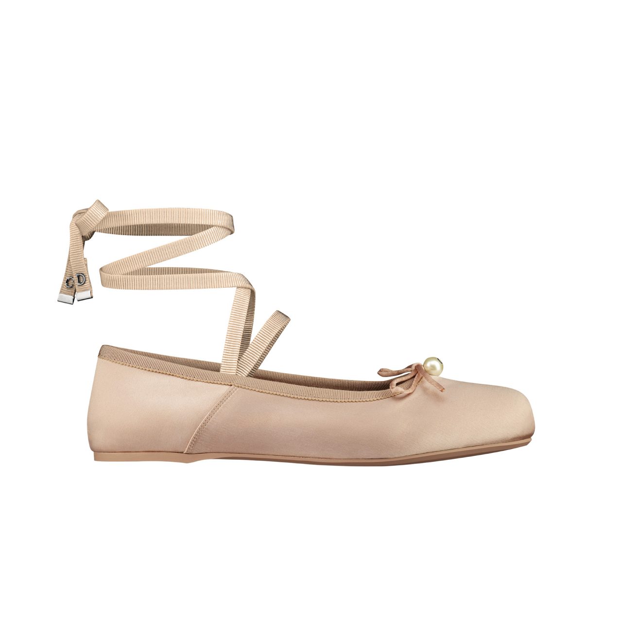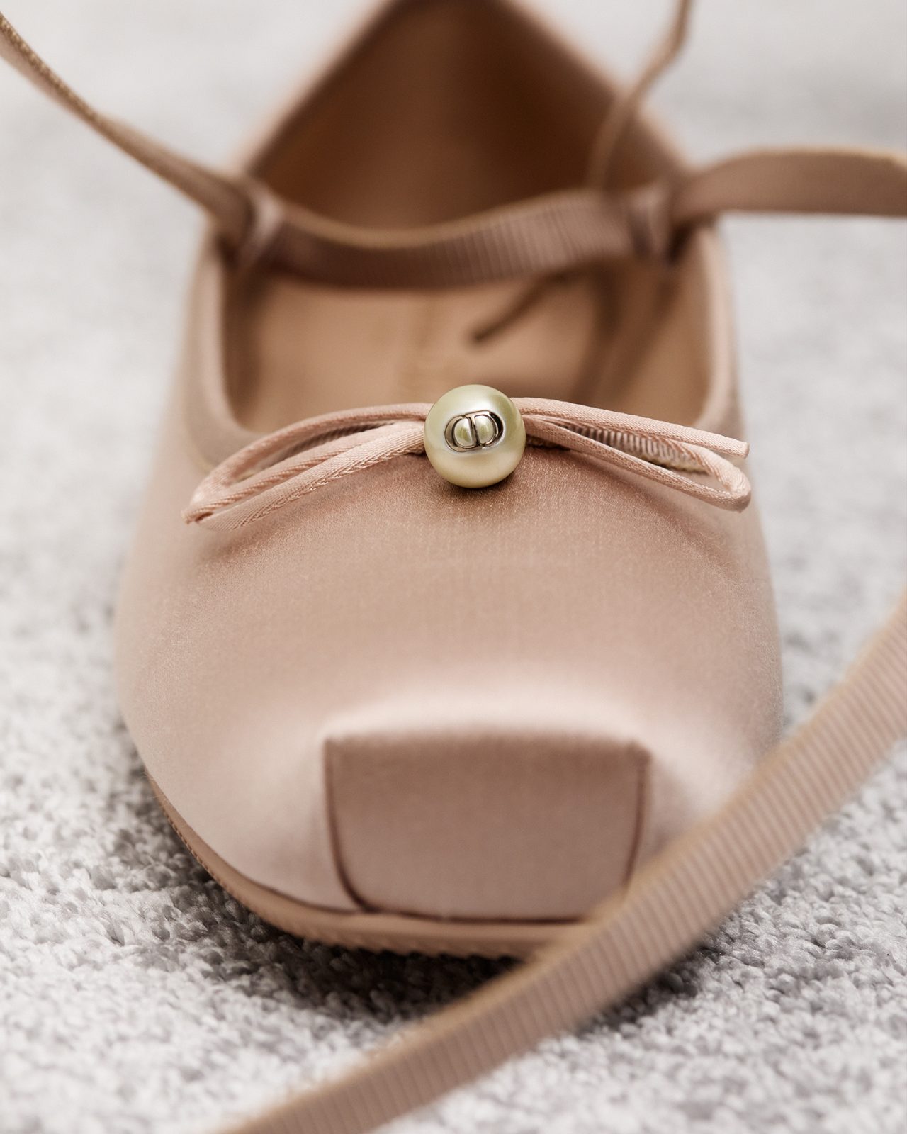 クラシックバレエは Maria Grazia Chiuri (マリア・グラツィア・キウリ)、そして創設者 Chirstian Dior (クリスチャン・ディオール) が情熱を注いできた芸術表現のひとつ。2024年春夏コレクションで発表されたバレリーナシューズ2型は、バレエの多面的な美しさを讃えたものである。サテン素材の「D-ジョイ」にはレジンパールと繊細なリボンが施され、取り外し可能なシューレースに「CD」の文字があしらわれた。「ディオール ソンジュ」はフレイド仕上げのグログランリボンを使用しており、メゾンの卓越した技術とともに、きらびやかなだけではないバレエの美しさが感じられる。