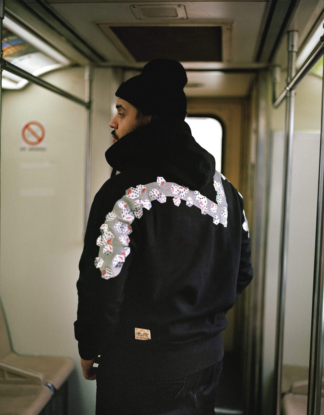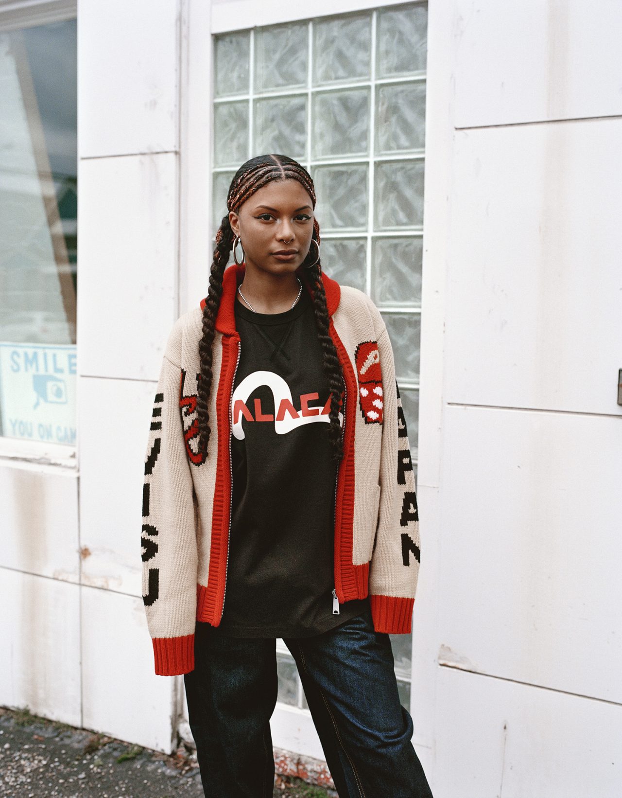 イギリス・ロンドンのスケートボードクルーたちによって2009年よりスタートしたブランド PALACE SKATEBOARDS は今回、第4回目となる EVISU とのコラボレーションアイテムをローンチ。ショート丈、ロング丈のデニムパンツや、ジップアップパーカー、Tシャツをはじめトートバッグ、キャップといったアクセサリーに加え、今回のメインモチーフであるダイスをフィーチャーしたスペシャルなダイスセットも登場する。バギーな5ポケットジーンズと2ポケットジャケットには、ダイスの刺繍が EVISU のロゴにのせてほどこされた。また、ラムウール100%のカーディガンは、大胆なダイスと「EVISU」「JAPAN」の腕章がアイコニックなデザイン。さらにTシャツのフロントには、両ブランドのロゴを組み合わせ、コラボレーションを祝福した。