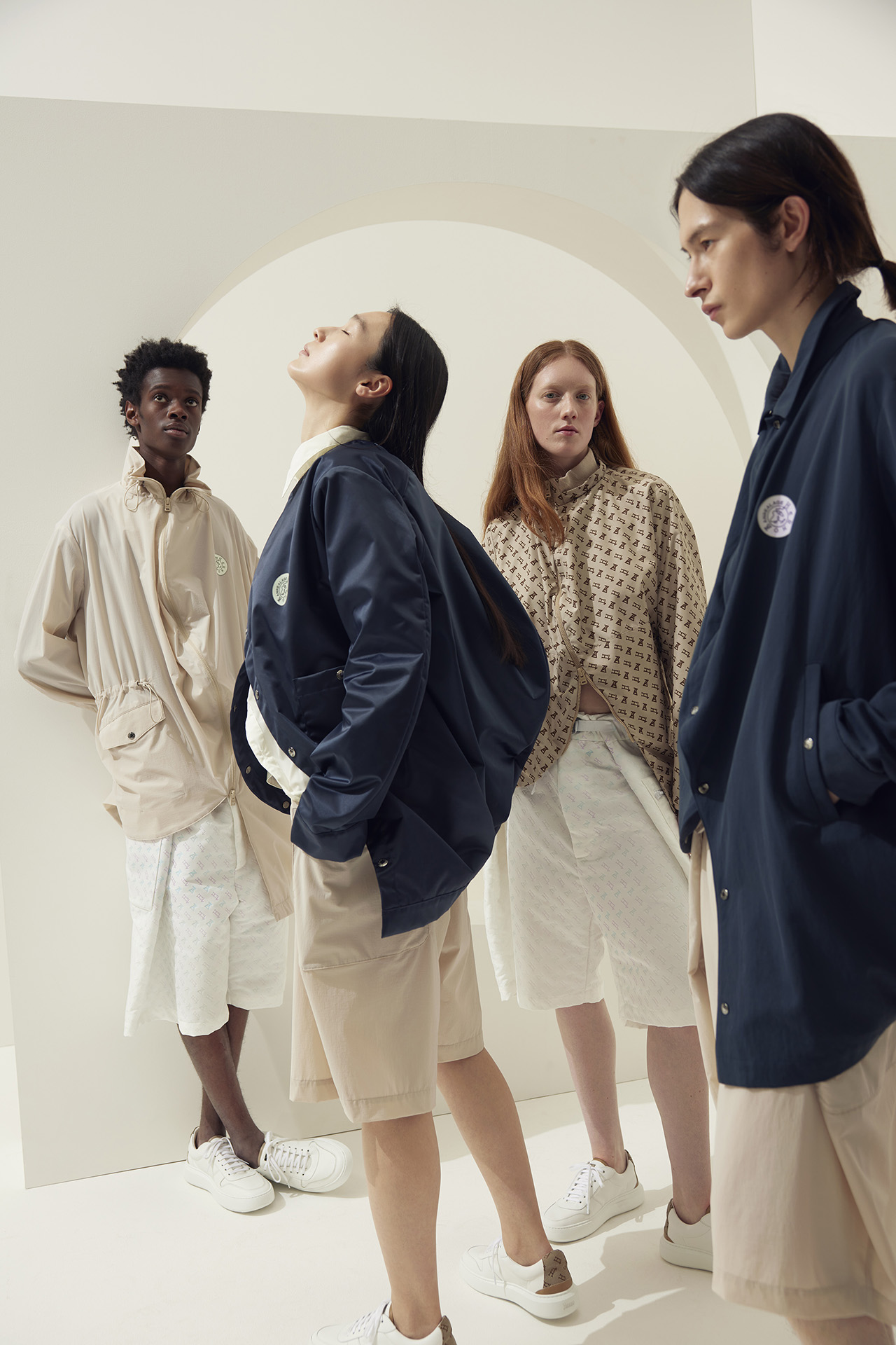 本コラボレーションではリサイクルナイロンで仕立てたシャツやリサイクルヤーンを使用したパーカーが登場し、モダンなデザイン性を実現しつつ環境負荷の低減に成功。あらゆる体型に対応するジェンダーレスな服を2サイズだけ作るという選択も、製造過程でのロスを減らすことに貢献している。またこのコレクションでは ANREALAGE のシグネチャーであるフォトクロミックテクノロジーも採用しており、太陽光が当たることで色が変化する汎用性の高いアイテムがお目見えした。