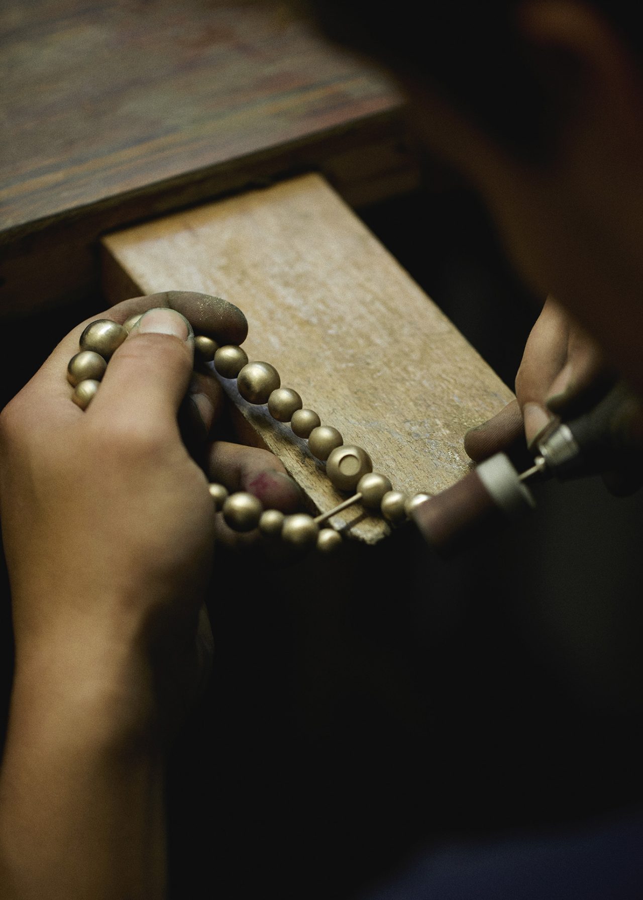 ドローイングから彫刻、パフォーマンスに至るまで多彩な創作活動を行ってきた Othoniel だが、特に目を引くのは丸いビーズを連ねたオブジェの数々である。六本木ヒルズの毛利庭園にあるパブリックアート作品「Kin no Kokoro」(2013年)を見たことのある人も多いのではないだろうか。今回のコラボレーションではブロンズとゴールドからできたビーズを用いて、ローズをかたどったフラワーアートを制作した。優美な双曲線を描く花の中心にボトルがたたずむデザインとなっており、まるで金色のバラからフレグランスが生まれてきたかのように見える。花々の幻想的な美しさに対する敬意が感じられるこの特別なエディションは、世界で100個のみの限定発売となっている。