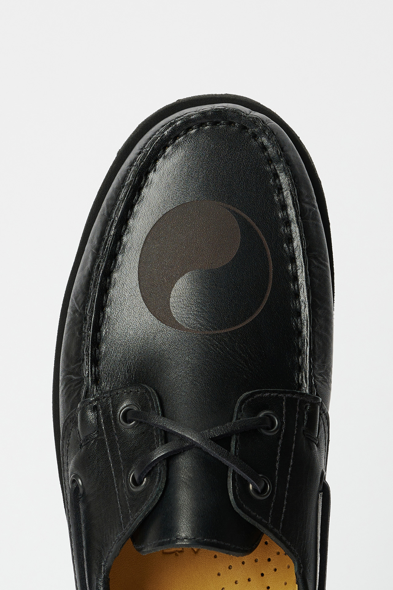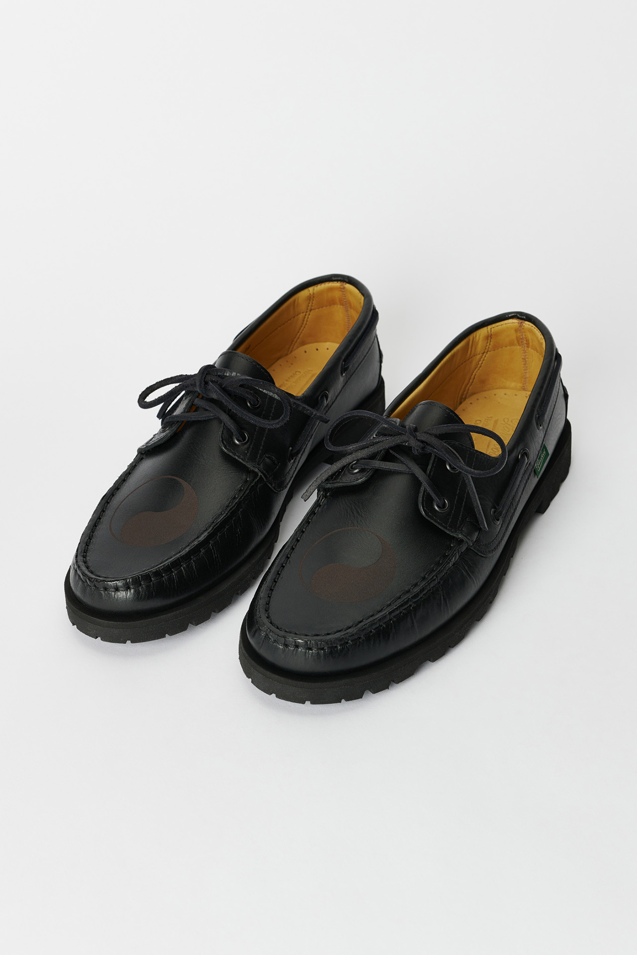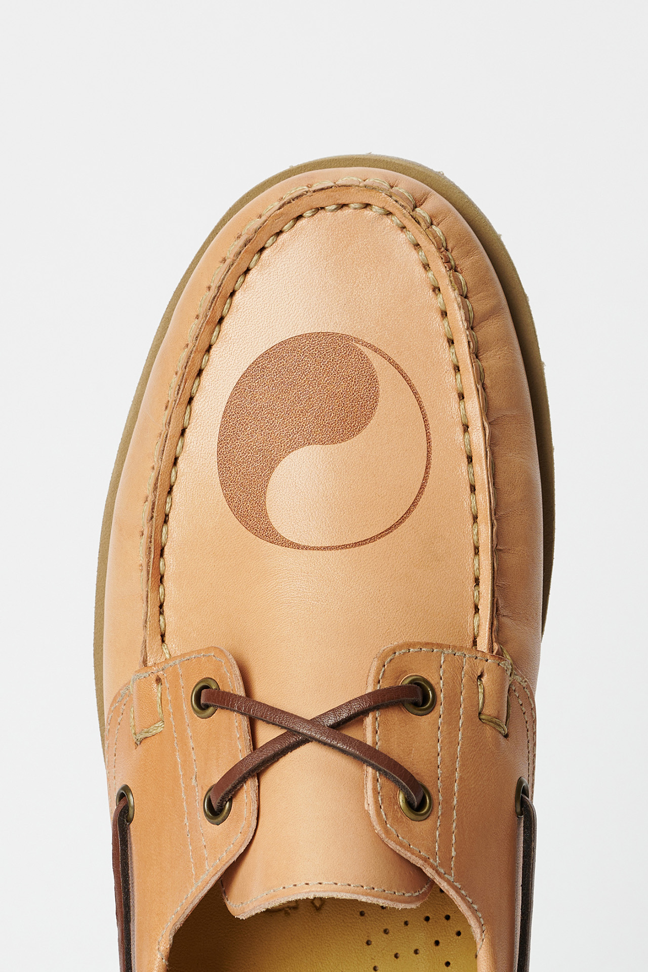 登場したのは Paraboot の手縫いデッキシューズ「MALO (マロ)」の新作だ。クラシックなシルエットに陰と陽の調和を表す「太陰太極図」をかたどった WORKSHOP のロゴが映えるデザインで、ブラックとナチュラルレザーの2色を展開。軽量かつ滑り止め効果の高いラグソールを採用したことで、歩きやすさも抜群の一足となっている。