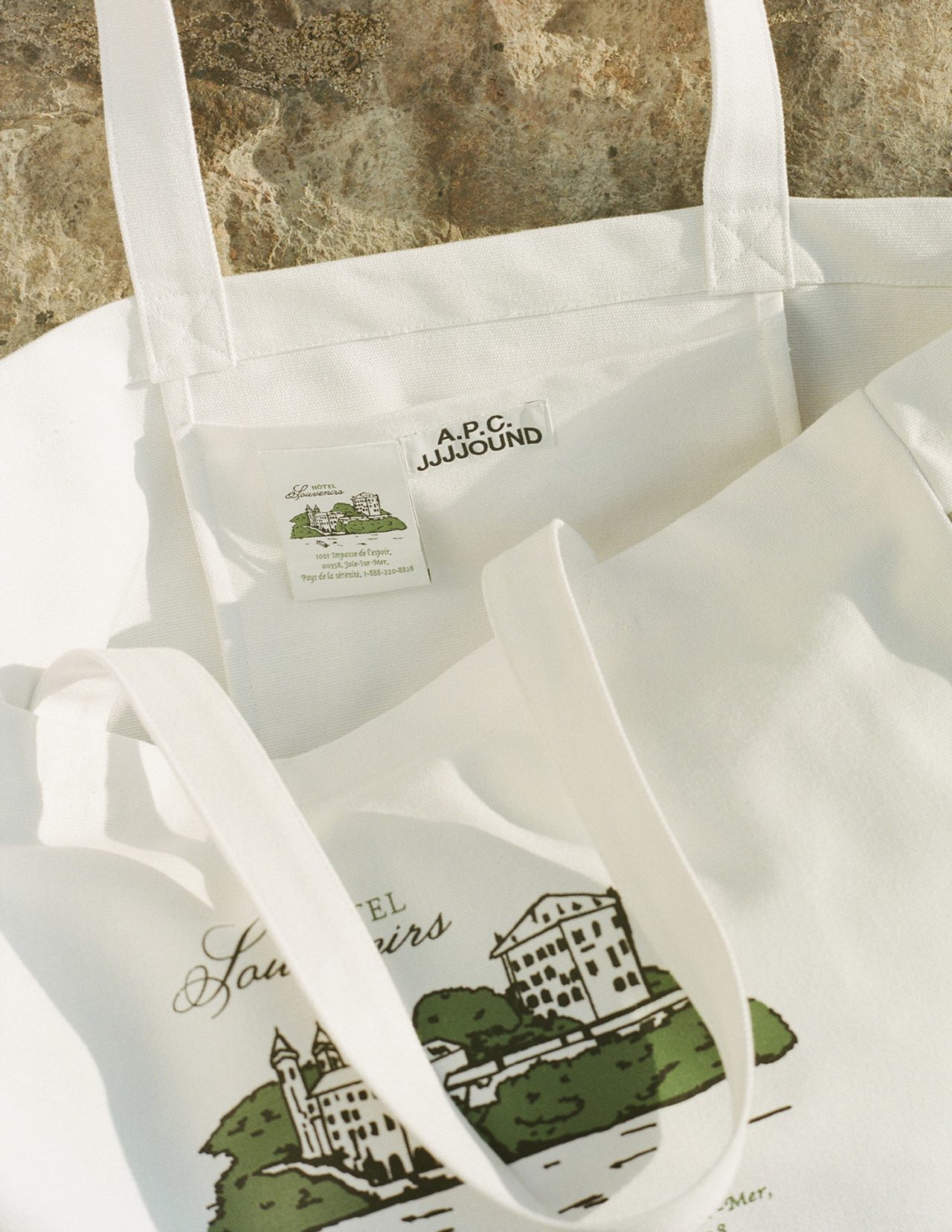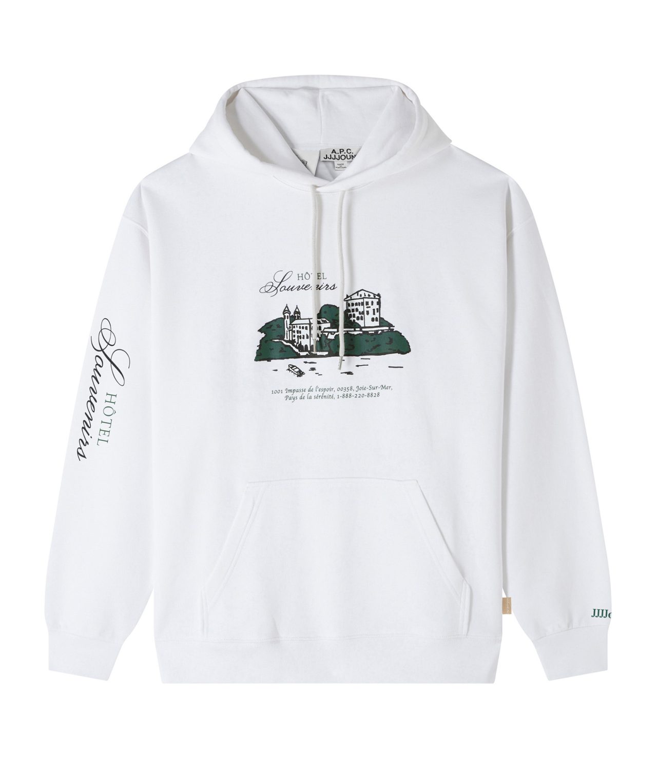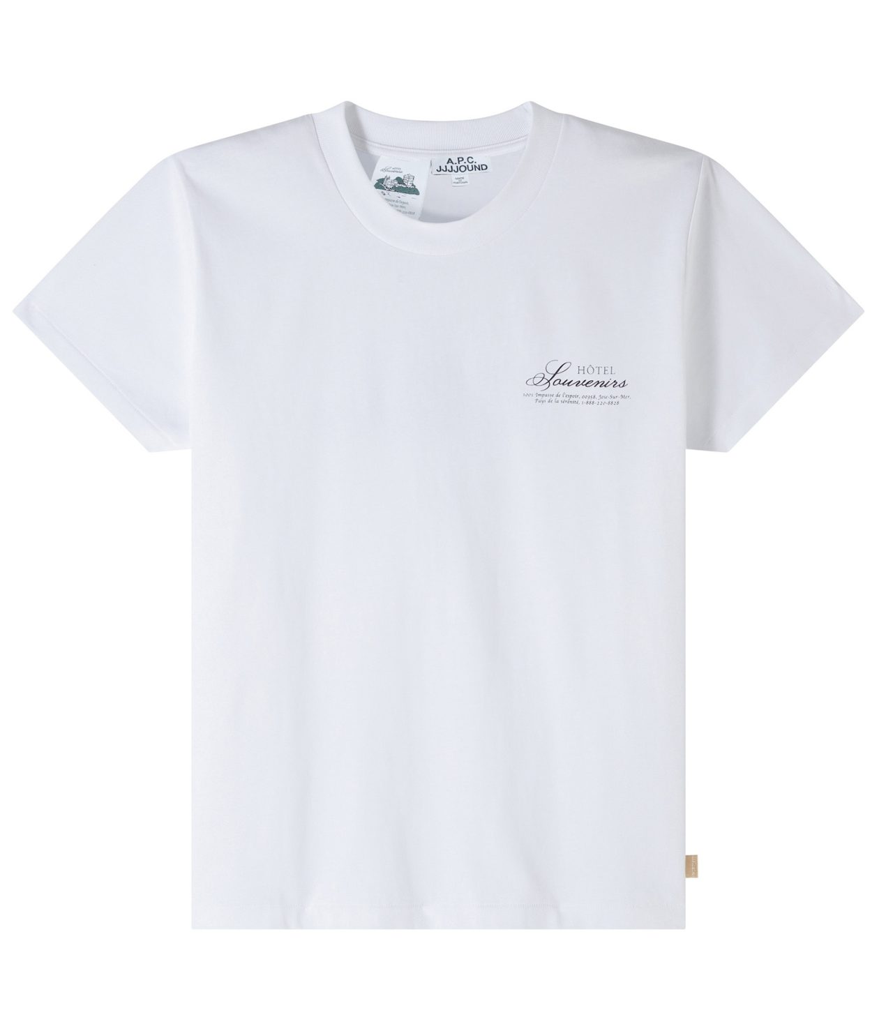 ラインナップは A.P.C. JJJJound の控えめなロゴが施されたダークネイビーのシャツ、スイムショーツ、スカーフと、「l’Hôtel Souvenirs」の文字がプリントされたスウェットシャツ、T シャツ、キャップ、トートバック。グローバルローンチに先駆け、伊勢丹新宿店にて先行販売も行われている。