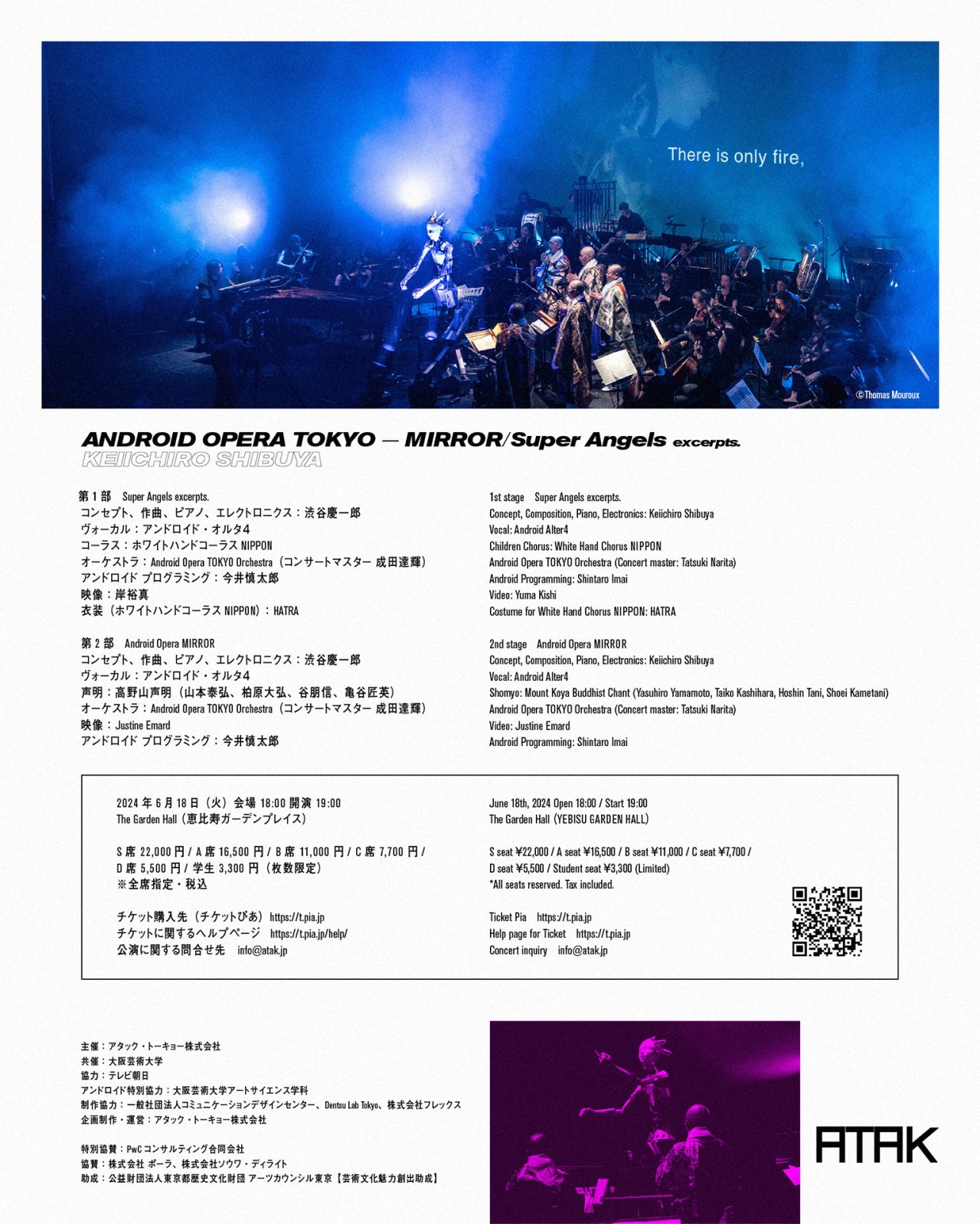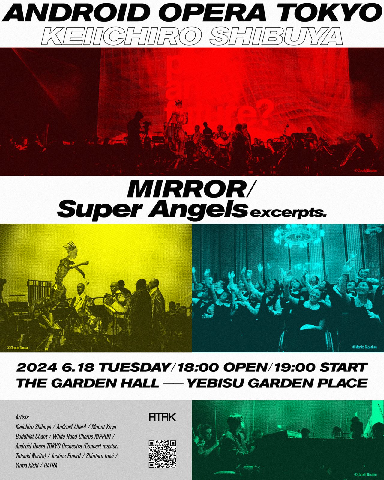 2012年に発表した初音ミク主演による人間不在のボーカロイド・オペラをはじめ、電子音楽、ピアノ、オペラ、サウンド・インスタレーションなど、多岐に渡って世界で活躍する音楽家・渋谷慶一郎。主に東京・パリを拠点に活動する彼が今回、日本では6年ぶりにアンドロイド・オペラ単独公演を開催する。本作「MIRROR」の前半、第一部では、2021年に新国立競技場にて初演された子どもたちとアンドロイドが創る新たなオペラ「Super Angels」の抜粋を披露。視覚や聴覚に障害を抱えるなど、多様なこどもたちからなる「ホワイトハンドコーラス NIPPON」による児童合唱が参加し、渋谷によるピアノとオーケストラの演奏に加え、HATRA (ハトラ) が子どもたちの衣装を担当するなど、多角的なアプローチに挑戦している。