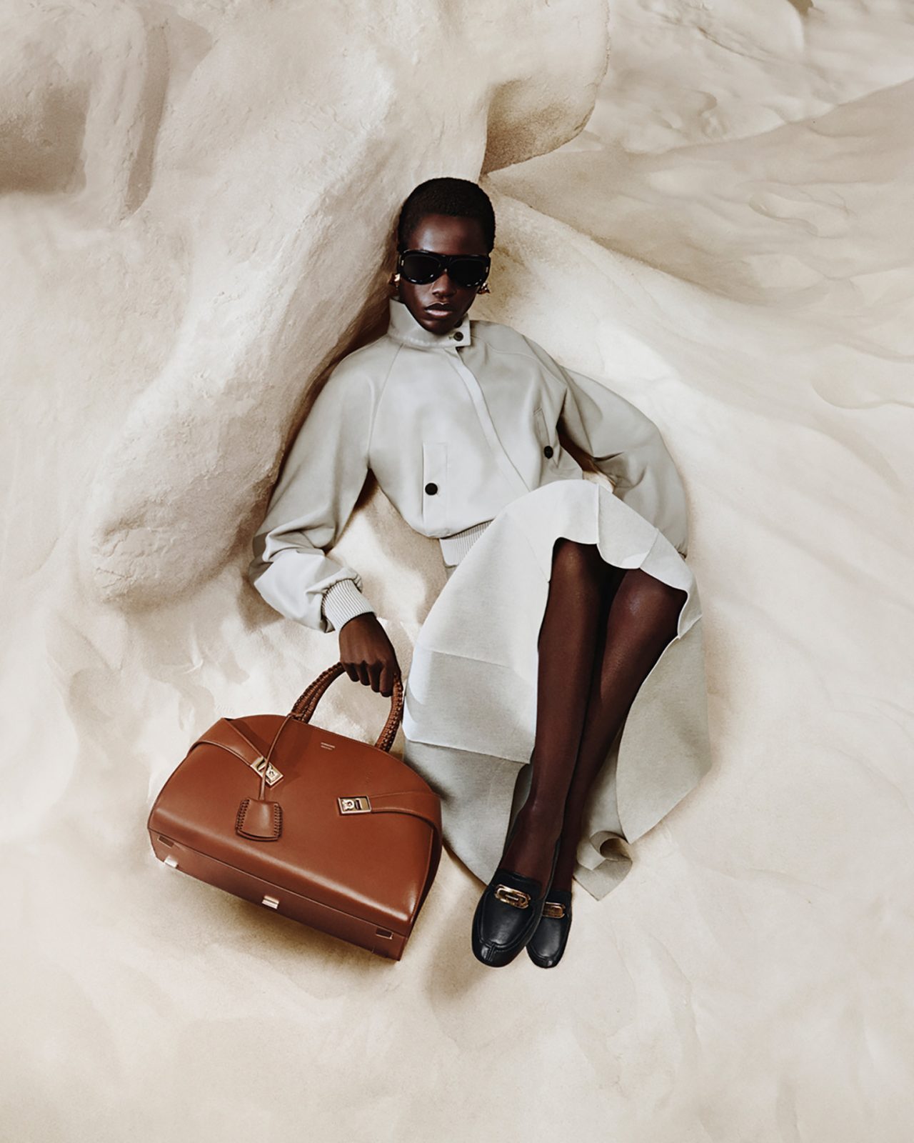 アイコニックなバレリーナシューズも新しいプロポーションでお目見えした。細長いラストとトウがさらなるエレガンスを表現し、大きなオーナメントはミニマルながらも遊び心あるタッチを添える。さらに職人技とクリエイティビティの融合である「Hug (ハグ)」バッグには、アーティスティックな編み込みレザーのハンドルを備えたモデルなどが加わった。