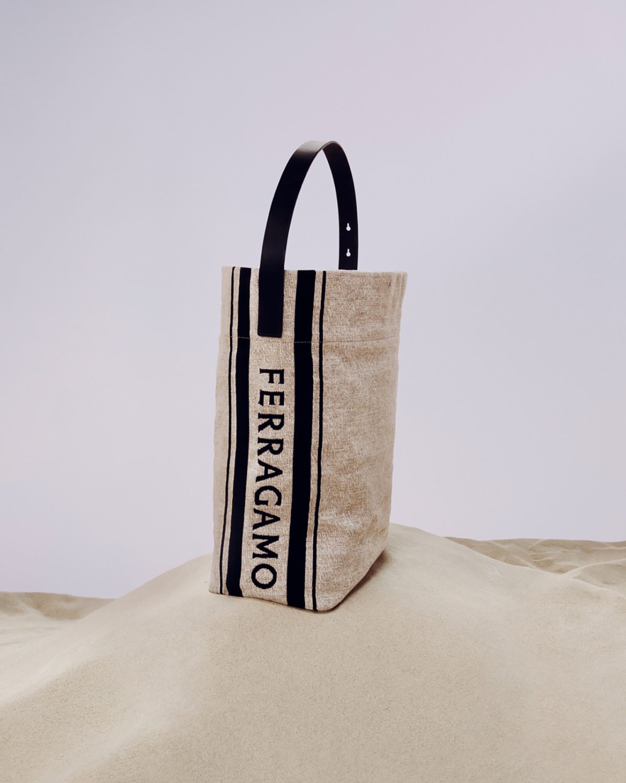 今回のコレクションでは創業者 Salvatore (サルヴァトーレ) の時代に取り入れたラフィア素材が再び登場。1920年代後半に未来派の画家 Lucio Venna (ルチオ・ヴェンナ) が FERRAGAMO のために製作したアートワークとともに、トートバッグやミュールに採用した。