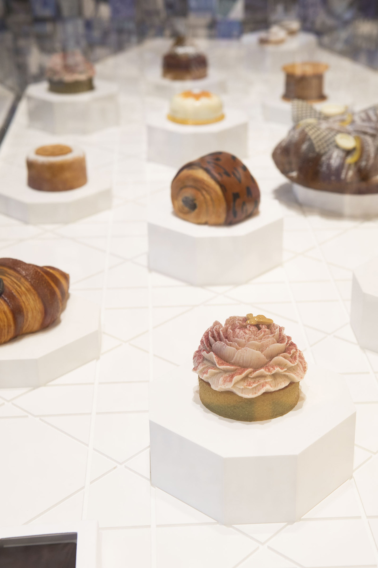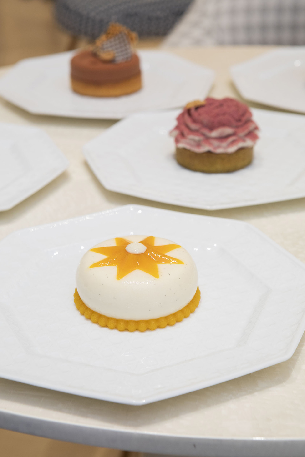テーブルに並べられたのは、メゾンのレガシーからインスピレーションを得て Anne-Sophie Pic が制作したケーキ「ル グランヴィル」と「ローズ デ ヴァン」。アンテトルメとして手がけられた「ル グランヴィル」は、ノルマンディークリームやリンゴのコンポート、ポモー、そば茶を使用したシンプルな味わいが特徴で、メゾンが大切にする「トワル ドゥ ジュイ」が配されている。ラッキースターとして知られる「ローズ デ ヴァン」は、夏にはアプリコットと桃が、冬には洋梨、サフラン、バニラ、オレンジの花が添えられ、四季折々の表情を見せる。また、ブティックに併設されたカフェの内装はホワイトを基調とし、カウンター席とテーブル席を用意。インテリアにも Dior の要素をあちこちに散りばめ、こだわりの空間をつくりあげた。関西国際空港を訪れた際は、「カフェ ディオール バイ アンヌ=ソフィ-・ピック」で、Dior と Anne-Sophie Pic の美学のマリアージュを堪能してみては。