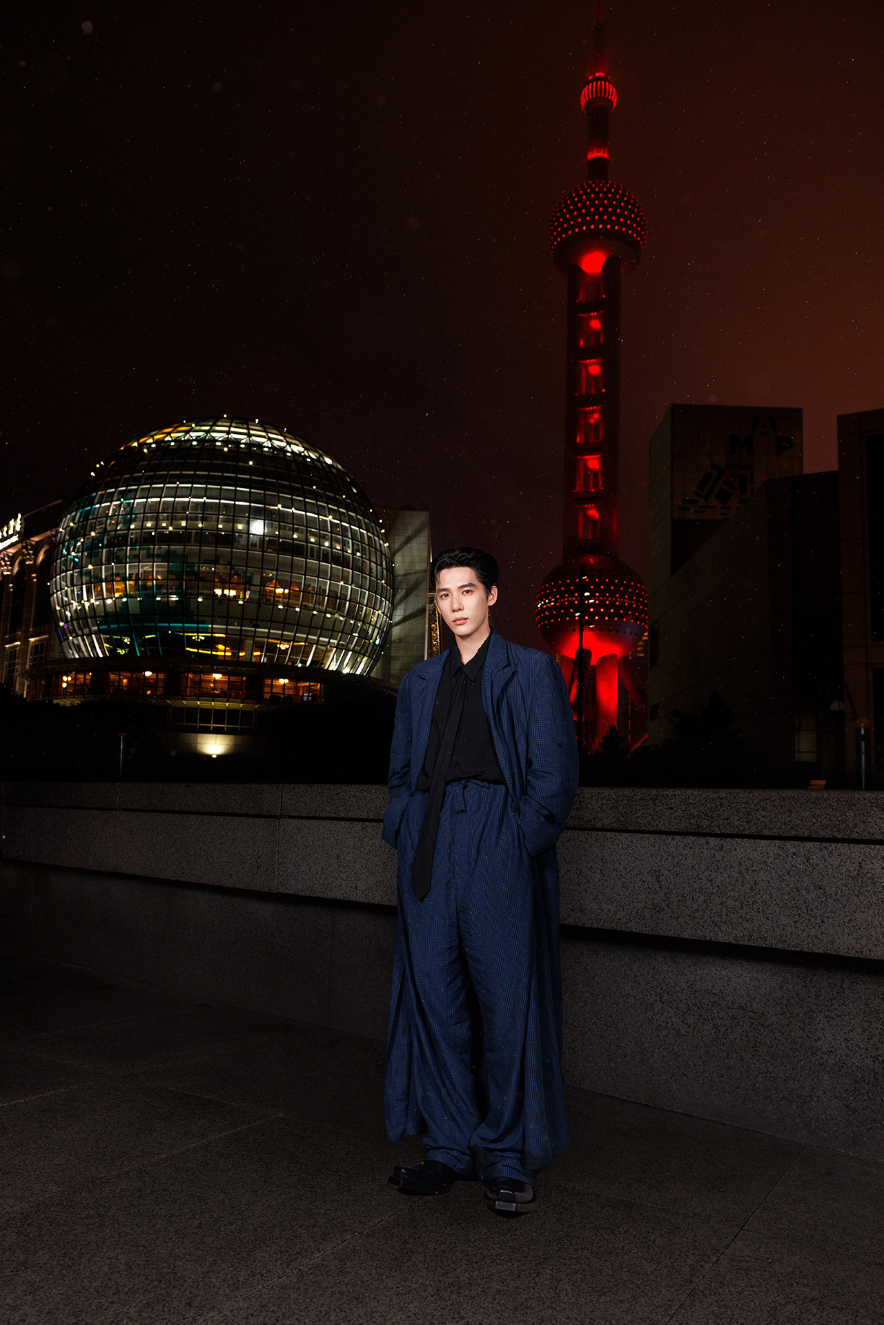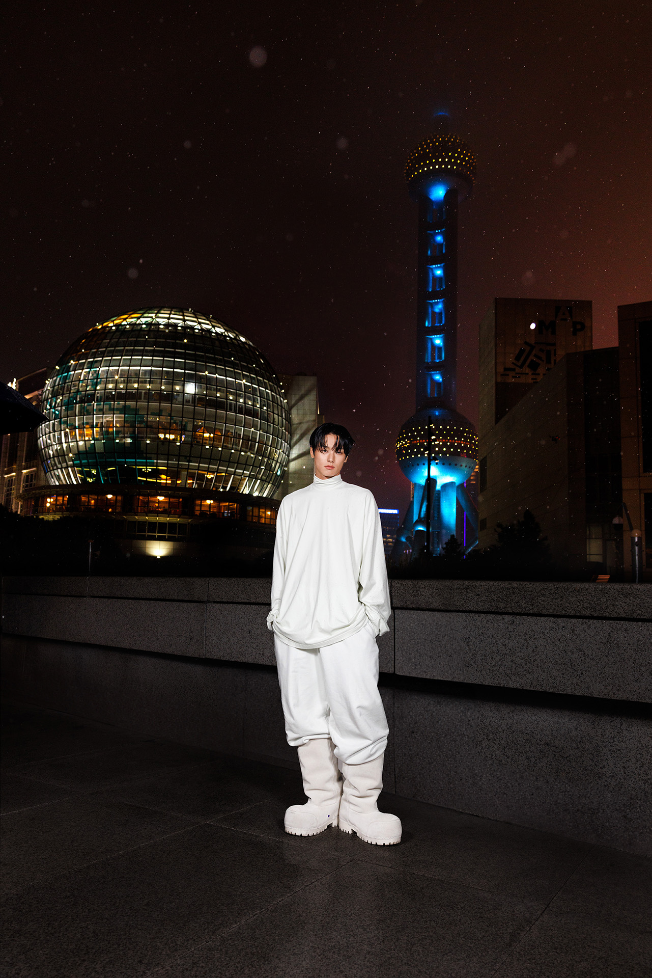 上海の象徴的なスカイラインが見える屋外で、高層ビルの煌めきに照らされながら BALENCIAGA 25年スプリングコレクションのショーはスタートした。最新コレクションのインスピレーション源となったのは、上海の高層ビル群。ファーストルックとして披露された超細長でロングシルエットのコートや、縦の長さを強調するかのような厚底のブーツ、ロングブーツで、中国経済の中心地 PUDONG (プートン) に立ち並ぶビルの垂直性を表現。また、アイコニックなボリュームとシェイプ、洗練されたカラーリングのワードローブに Alipay や Under Armor のロゴが配されたエクスクルーシブアイテムたちがランウェイでお目見え。Alipay とのコラボTシャツと Under Armor とコラボした計8点のアイテムは、ショーの直後から数量限定で発売されている。
