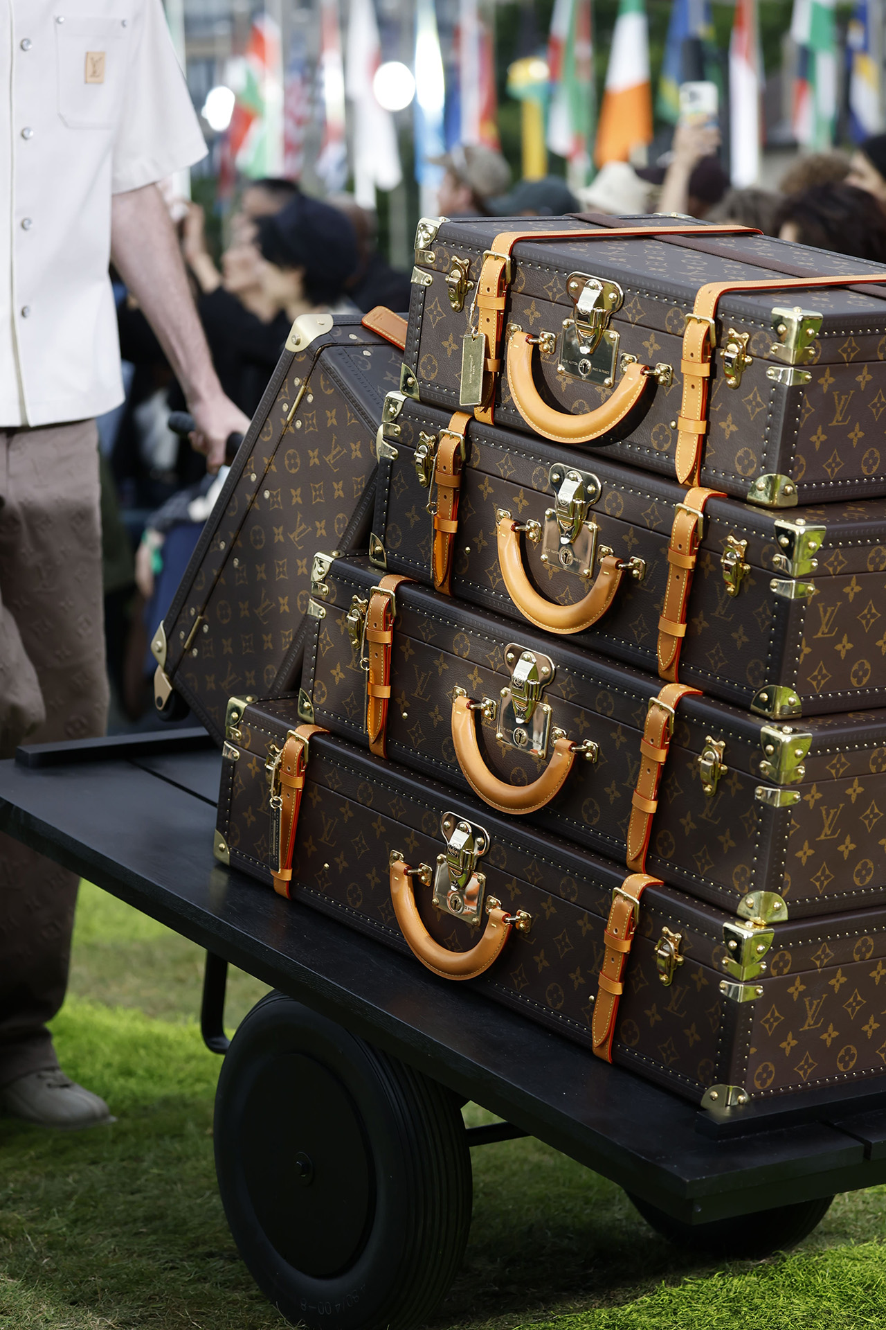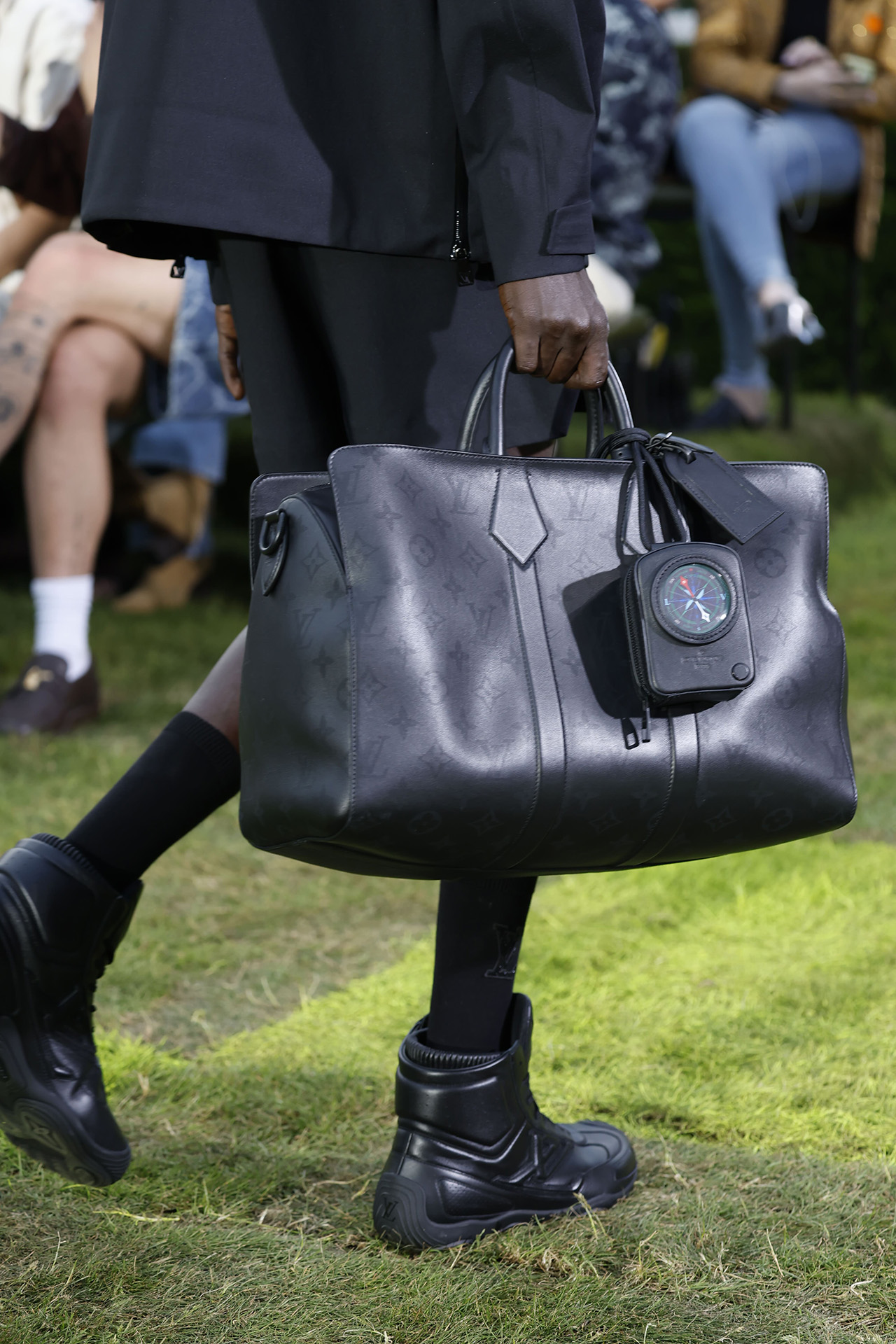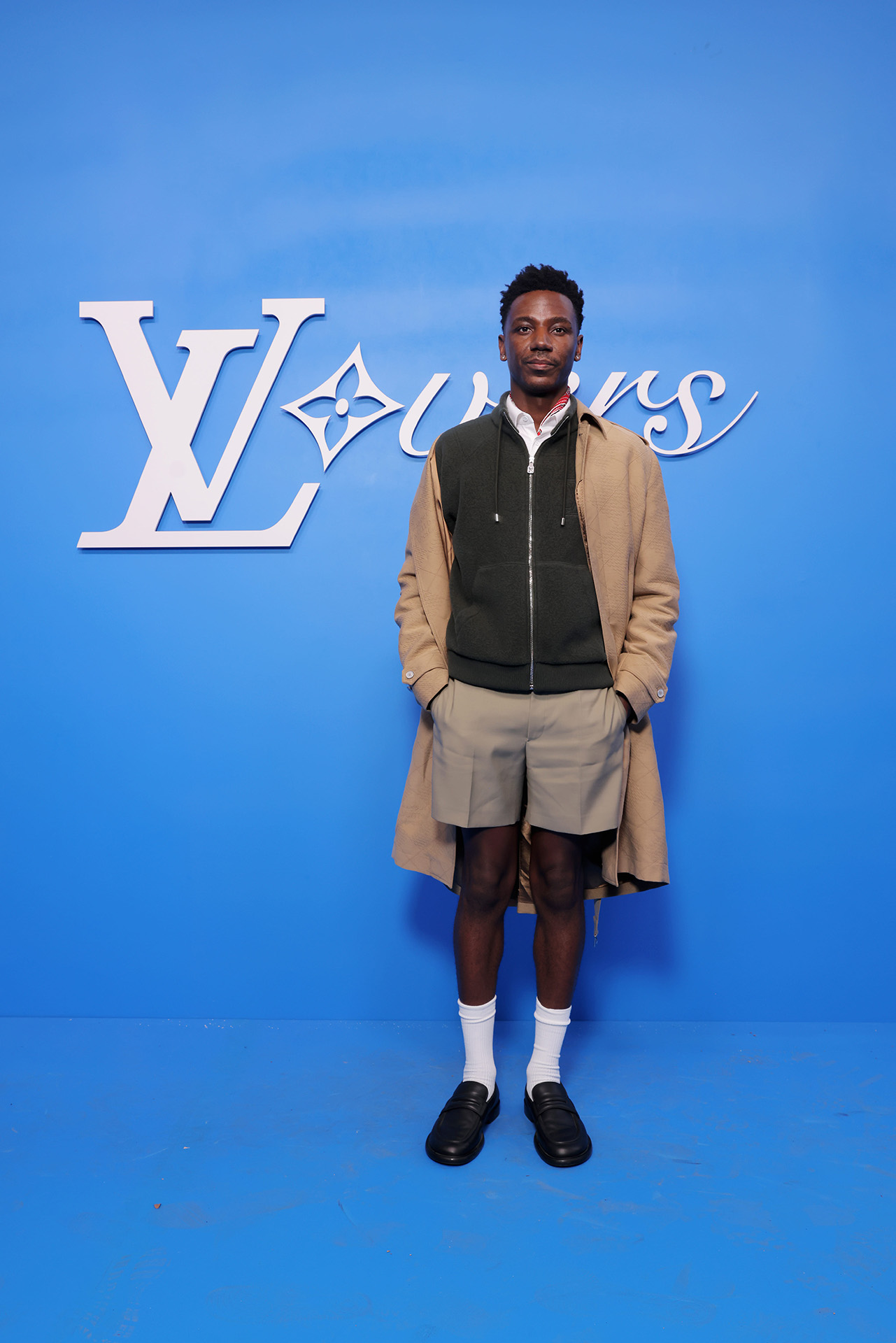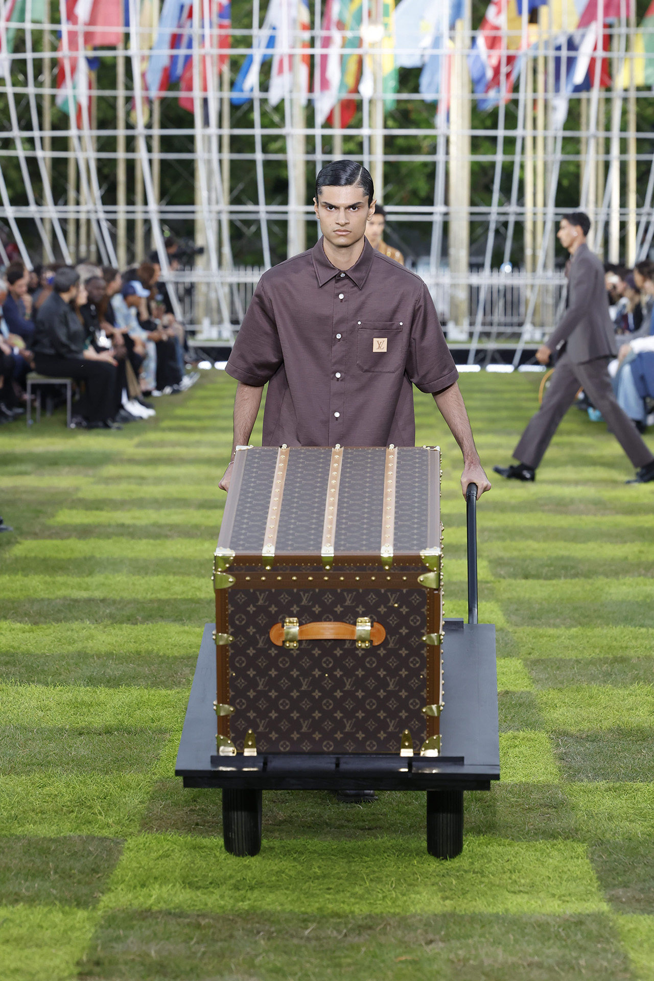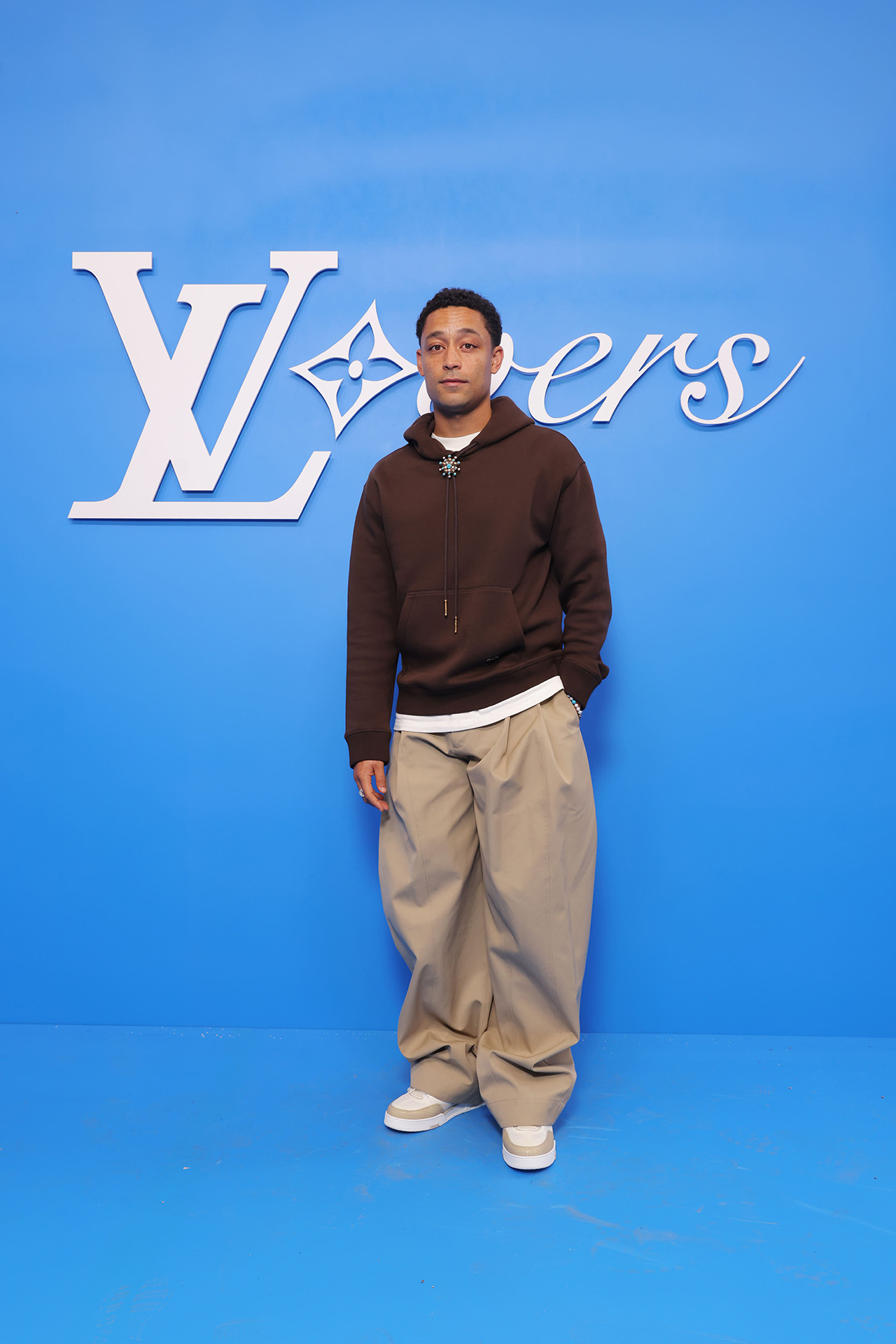 今回 Louis Vuitton が発表したコレクションでは、地球をズームアウトした姿を想像し、色彩、構造、表面装飾においてマクロなヴィジョンを表現。淡くモノトーンかのようなカラーパレットも複雑な色が絡み合い、これは遠くから見ると同系色に見えるが近づくとはっきりと違いが生まれる肌のニュアンスを再現。また、最高級のシルクから紡ぎ出されたセカンドスキンのウェアや、皮膚の触感を再現したアクセサリーなど、いたるところに肌から着想を得たアイデアが反映されている。さらにショーの終盤には、サッカーボールのパターンをほどこしたルックが登場。人類という広い視点からスポーツ文化にズームインし、人々が織りなす営みのすべてを掬い上げるようだ。人種、その土地に根付く芸術へのオマージュを捧げ、まさに世界を「旅」するかのような Louis Vuitton 2025年春夏メンズコレクションのショーとなった。