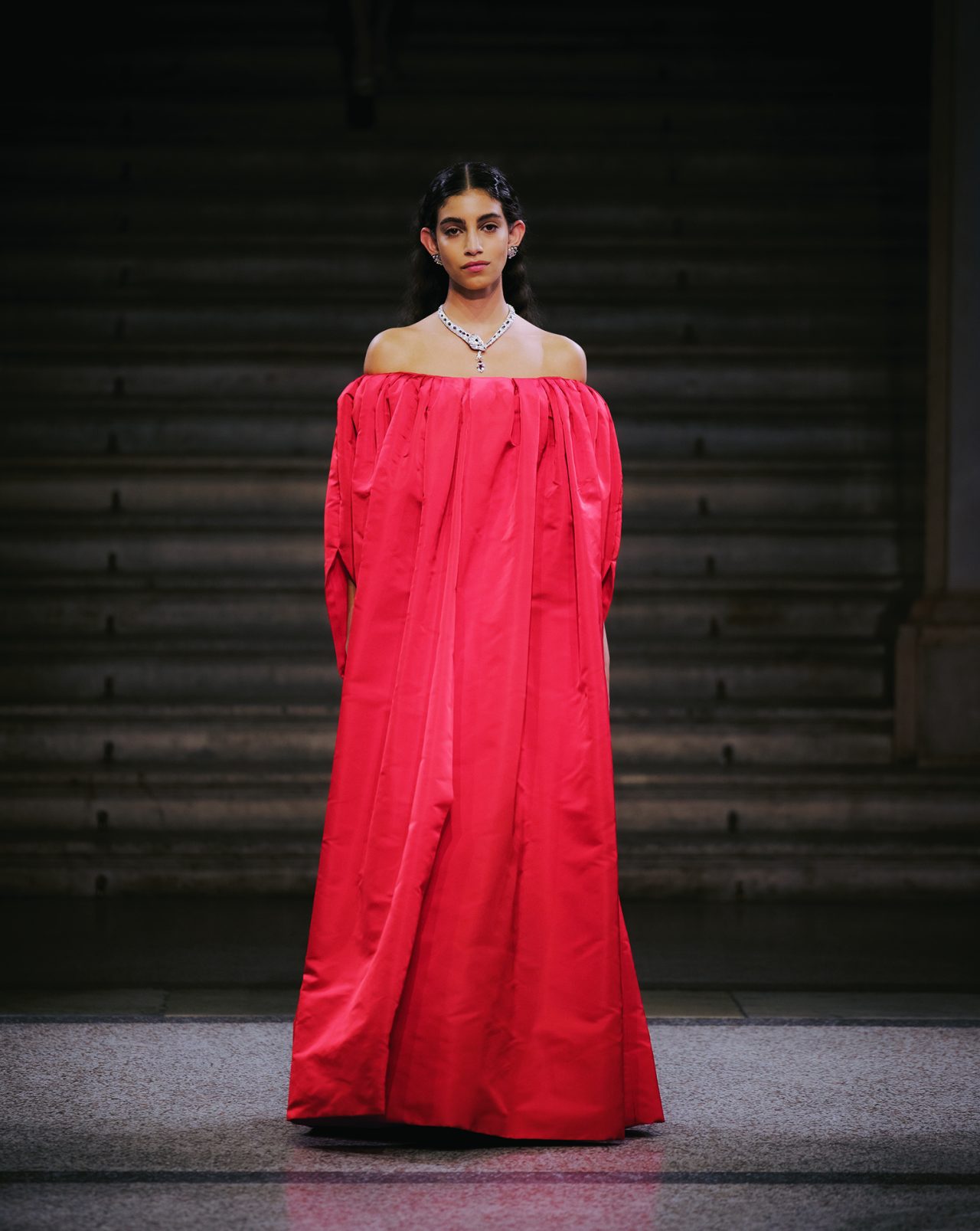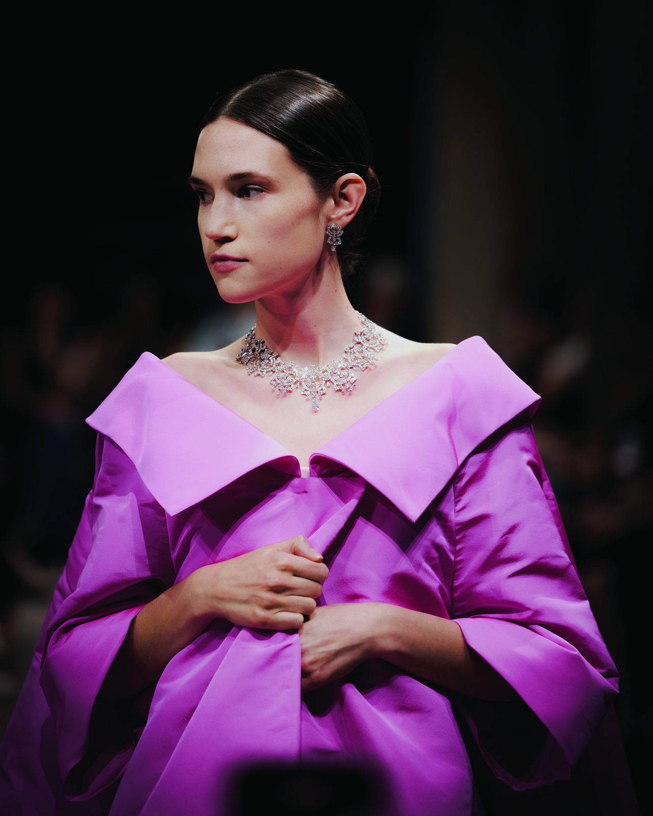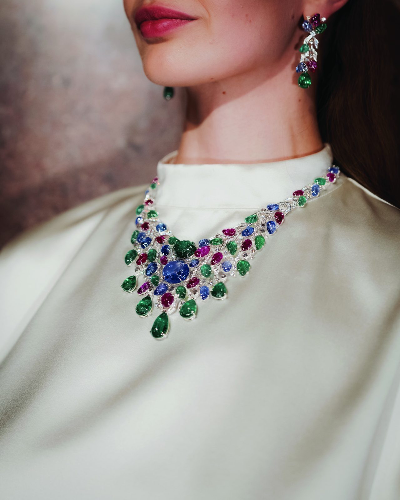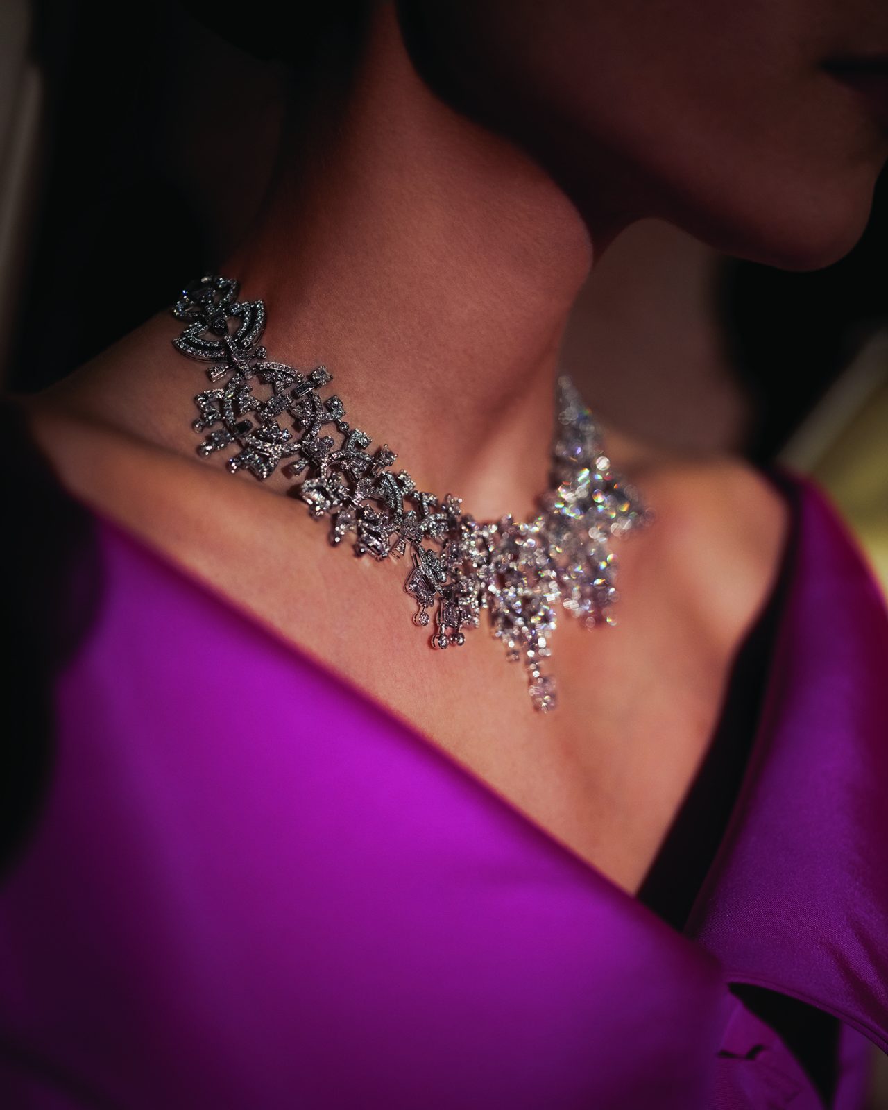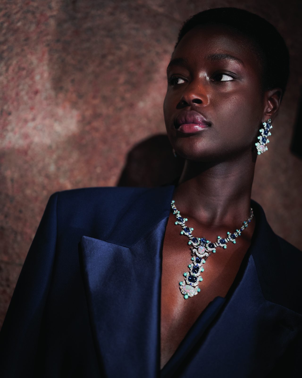 「MOCHELYS (モシュリス)」はネックレスの中にカメの意匠が巧みに取り込まれており、連結部分を取り外してブローチにすると頭部や足などの全体像が姿を現す仕様だ。2匹のスネークが首回りを飾る「AMPHISTA (アンフィスタ)」はダイアモンドの鱗の上にエメラルドがきらめき、アクアマリンで水辺を演出した「CELUSTUN (セレスタン)」の中央にはくちばしにブラックラッカーとピンクゴールドをあしらったフラミンゴが佇む。幾何学模様が目を引く「ALAE (アラエ)」は、首の後ろでスカラベが羽を休めるデザインとなっている。