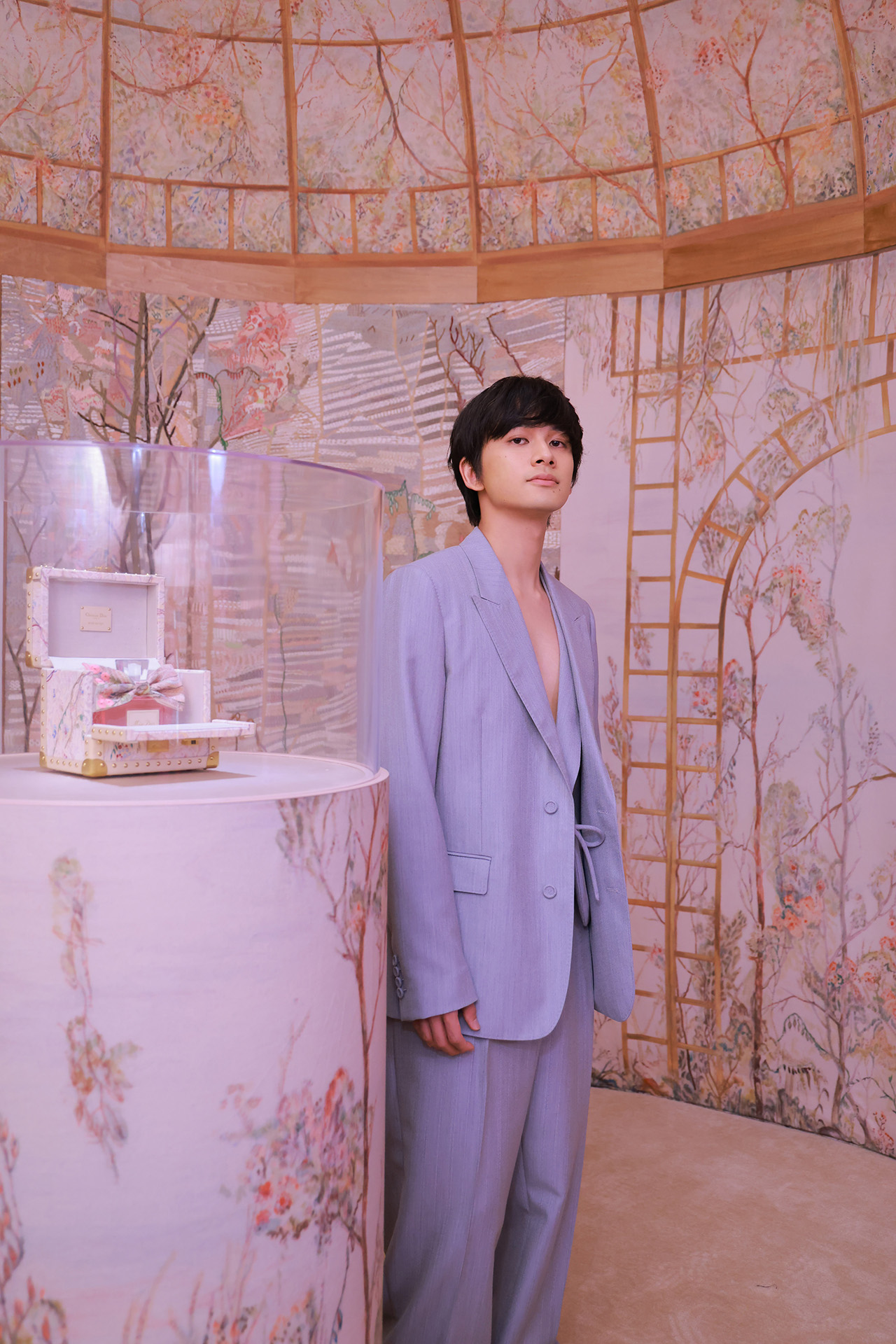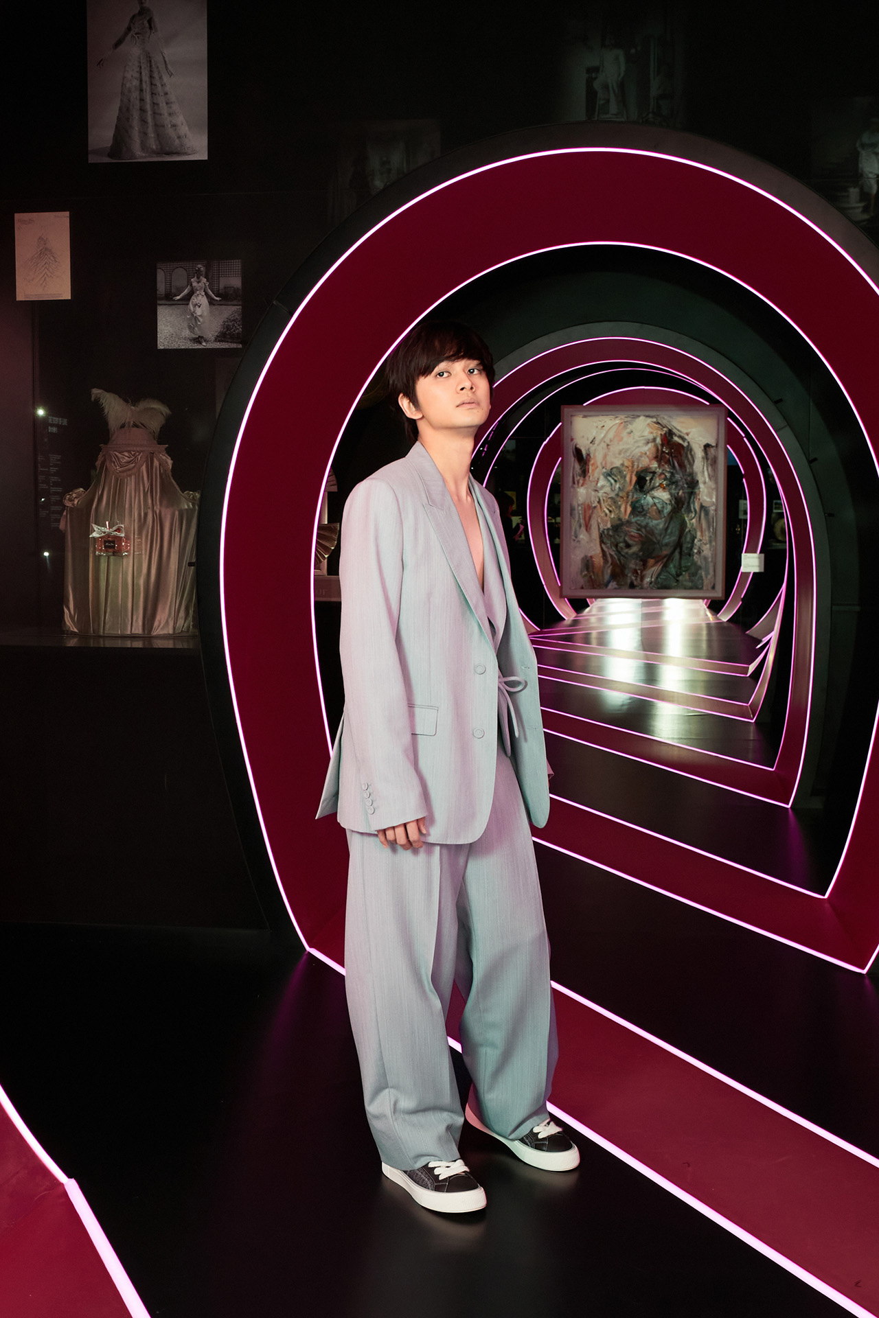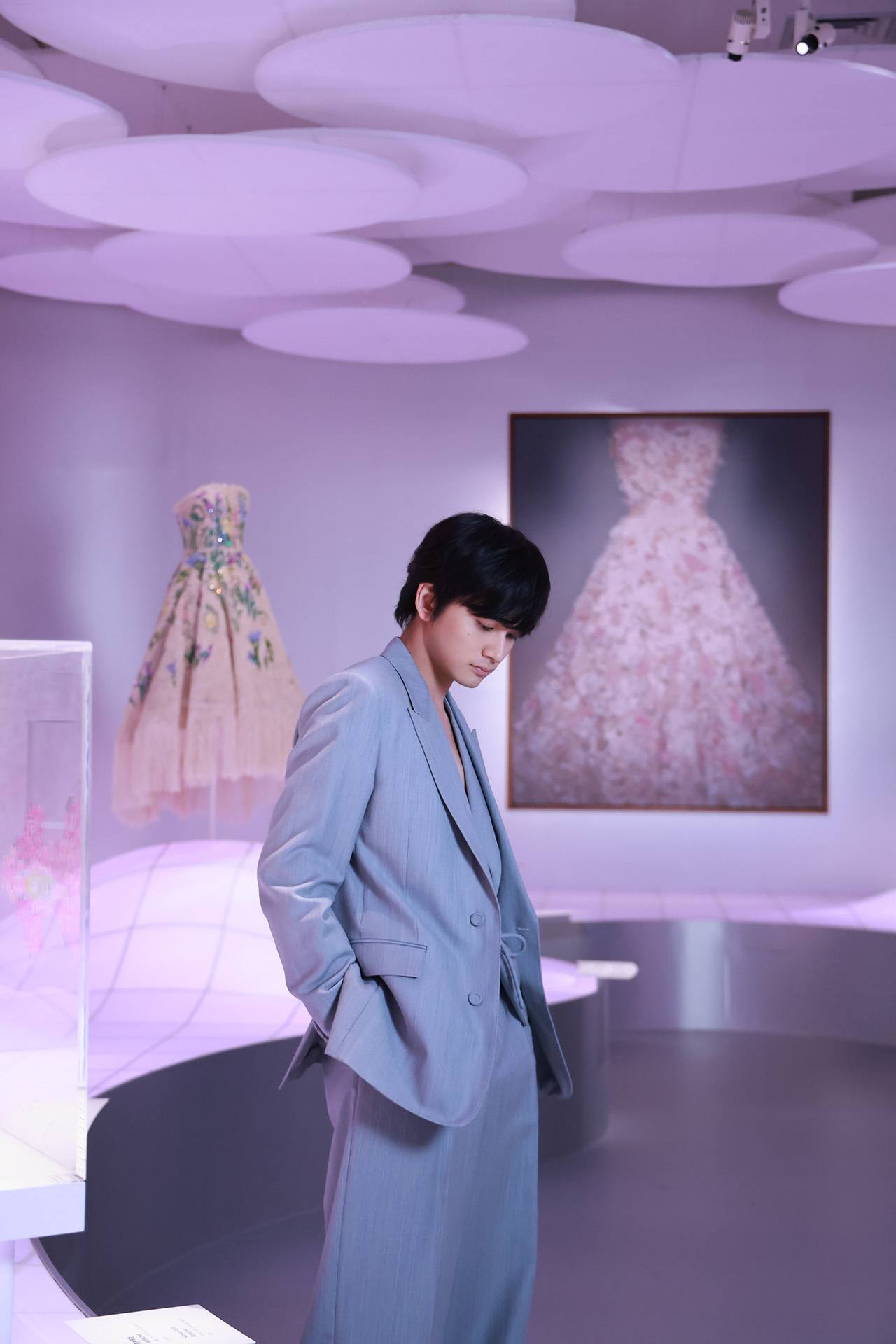 ジャケットとパンツのスタイリッシュなコーディネートにスニーカーを合わせてカジュアルさをプラスした装いで展覧会を訪れた北村匠海。メゾンのパフューム クリエイション ディレクター、Francis Kurkdjian (フランシス・クルジャン) による「ミス ディオール パルファン」を象徴する花々の香りに包まれながら展示を楽しんだ。
