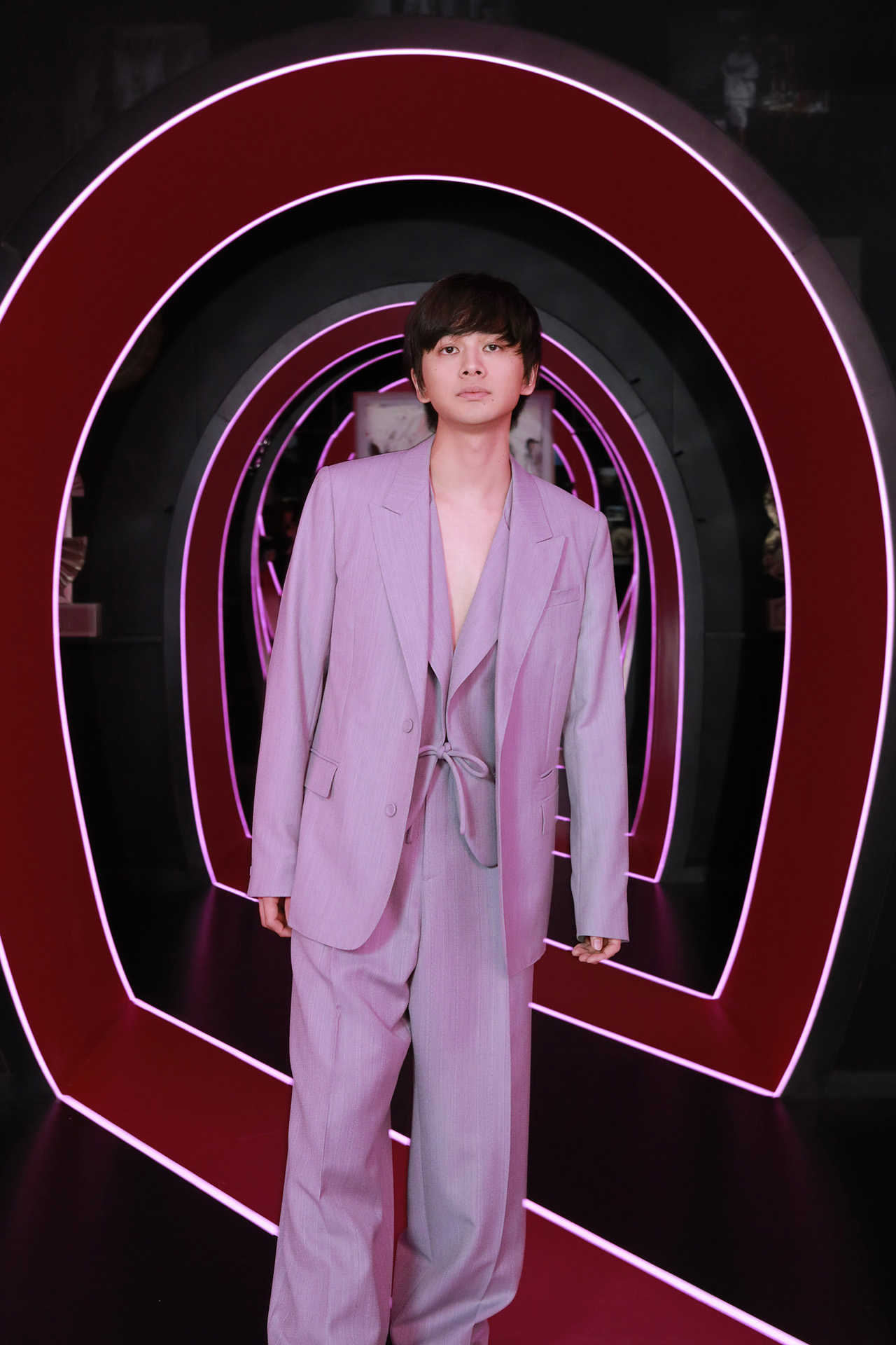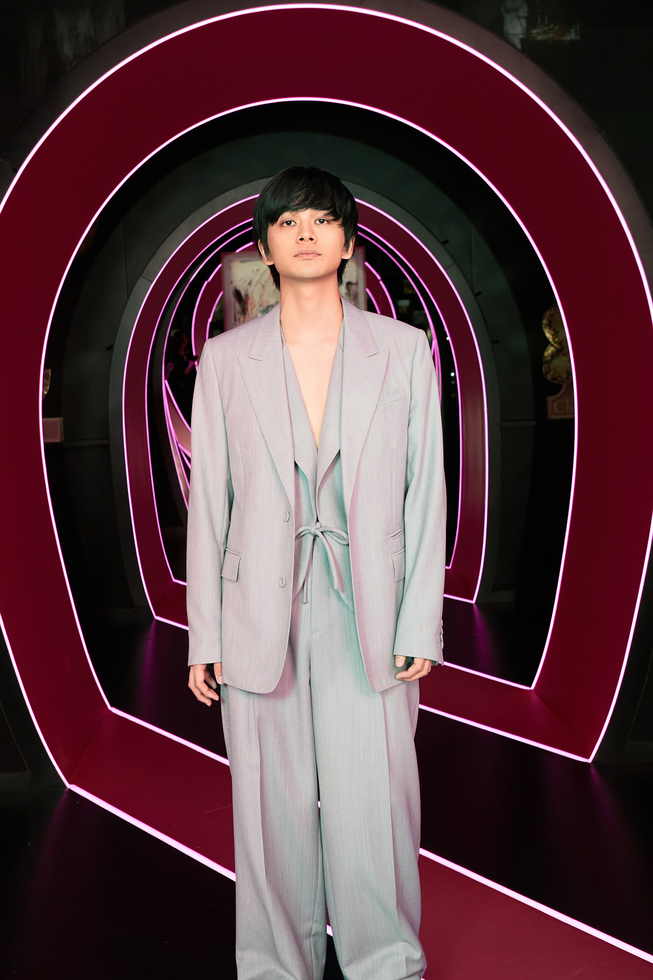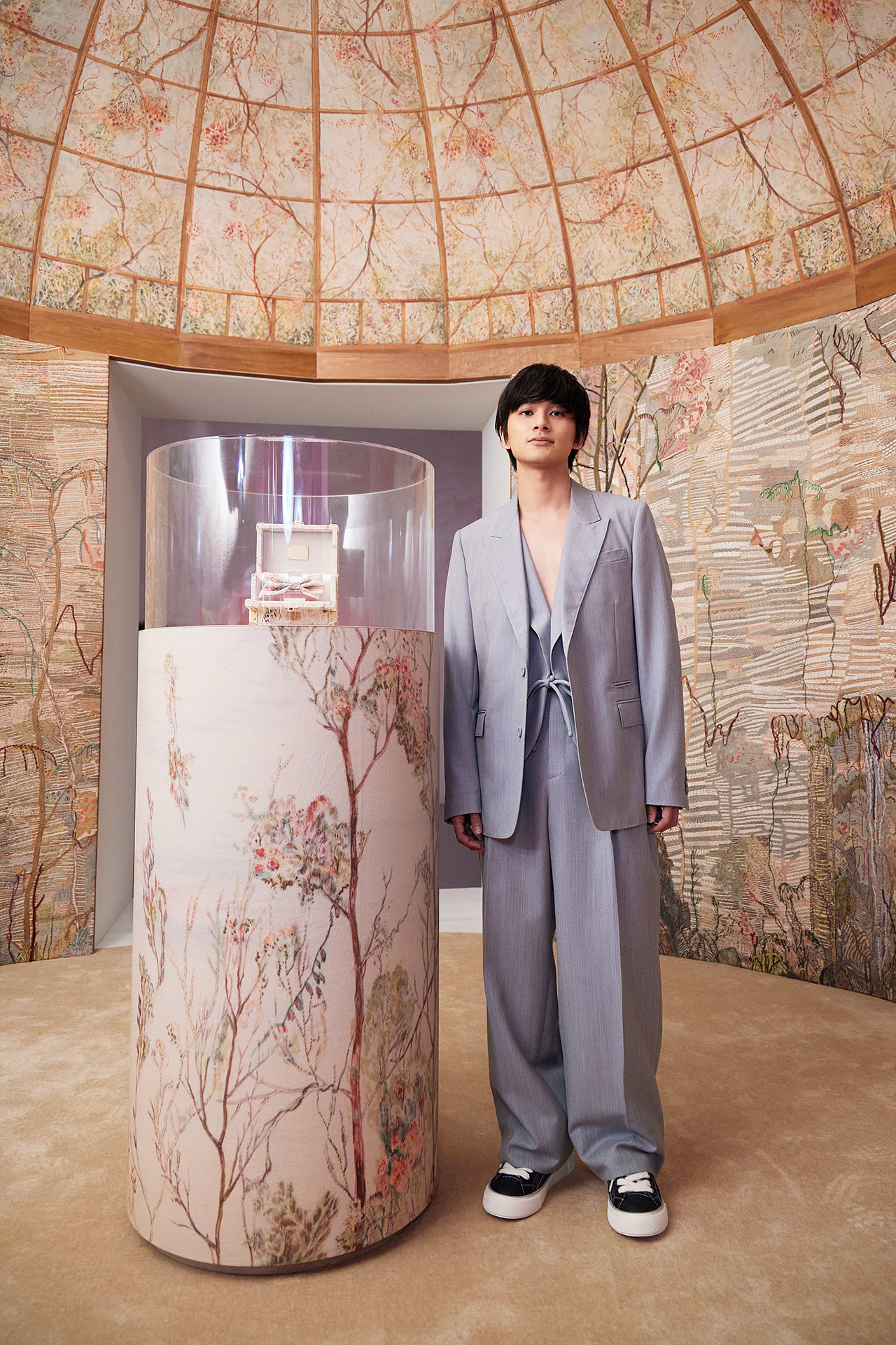 ジャケットとパンツのスタイリッシュなコーディネートにスニーカーを合わせてカジュアルさをプラスした装いで展覧会を訪れた北村匠海。メゾンのパフューム クリエイション ディレクター、Francis Kurkdjian (フランシス・クルジャン) による「ミス ディオール パルファン」を象徴する花々の香りに包まれながら展示を楽しんだ。