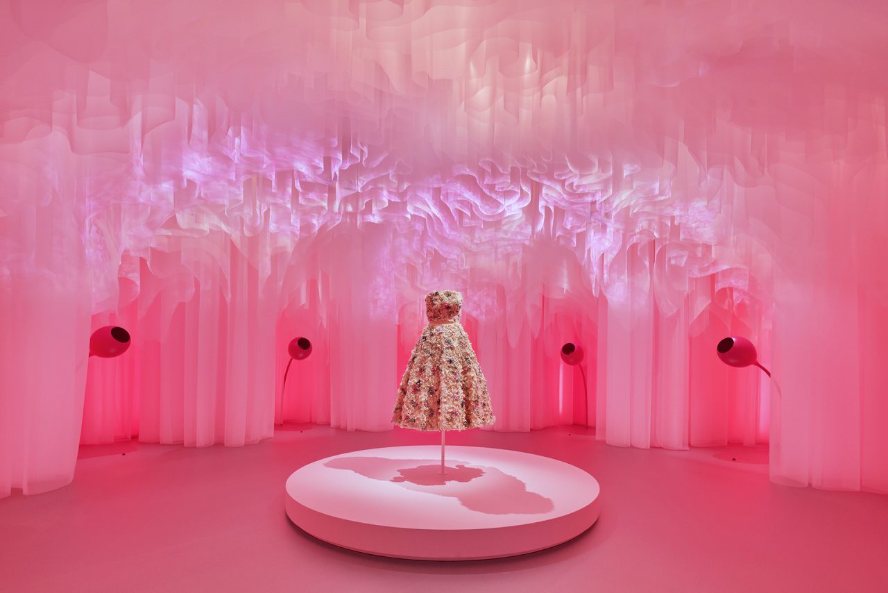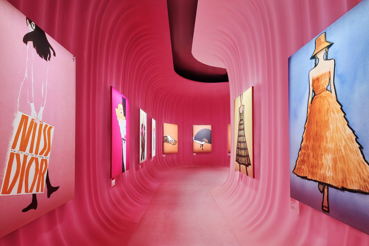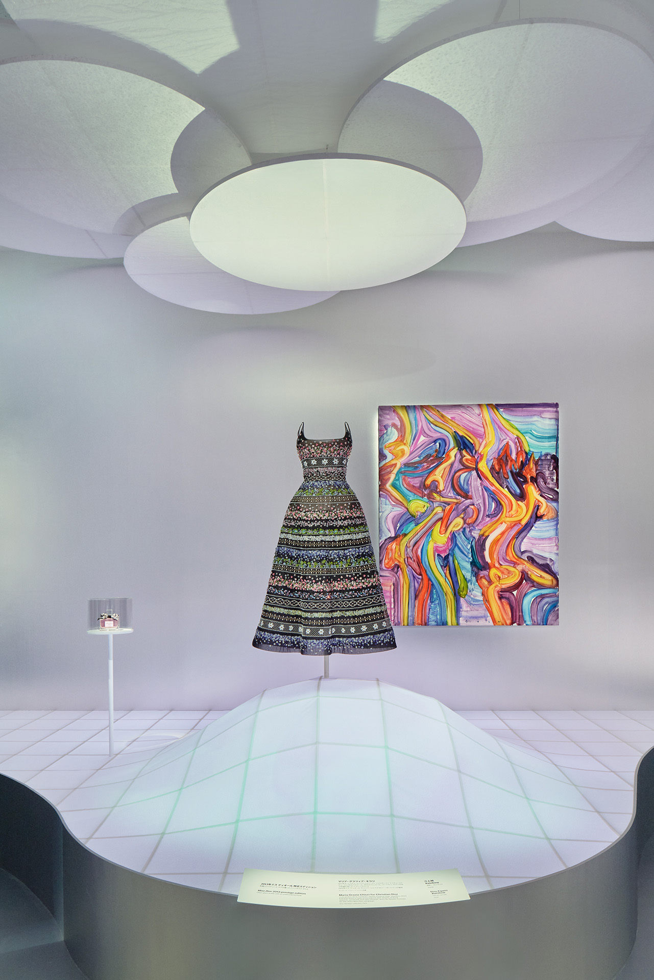 「ミス ディオール」の歴史を体感できる本展では、建築家の重松象平が空間デザインを手掛けた。ここでは、メゾンで受け継がれるクチュール ドレスやアーカイブ コレクションなどが一堂に会する。さらに、Rene Gruau (ルネ・グリュオー)や Mats Gustafson (マッツ・グスタフソン) によるドローイングや水彩画とともに、国際的に活躍するアーティストの Eva Jospin (エヴァ・ジョスパン) や Sabine Marcelis (サビーヌ・マルセリス)、井田幸昌、荒神明香、江上越などの特別な作品も展示している。