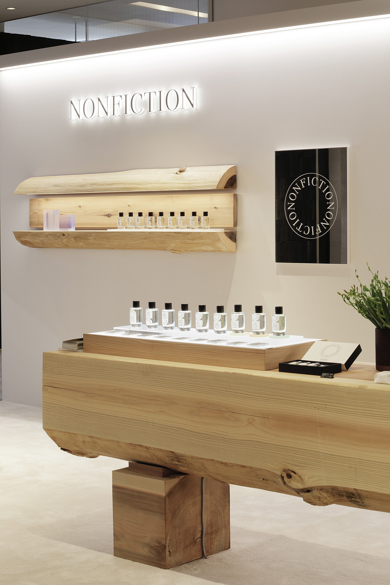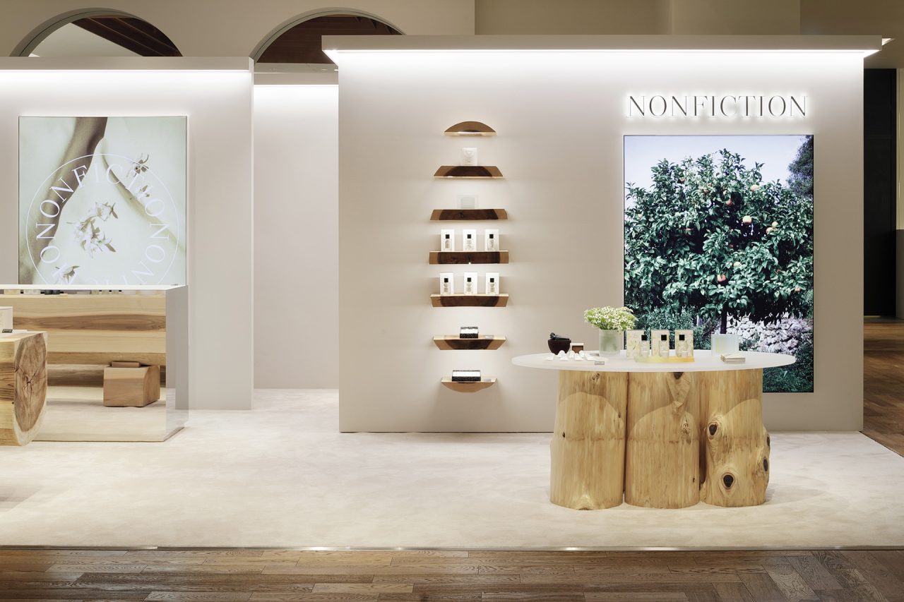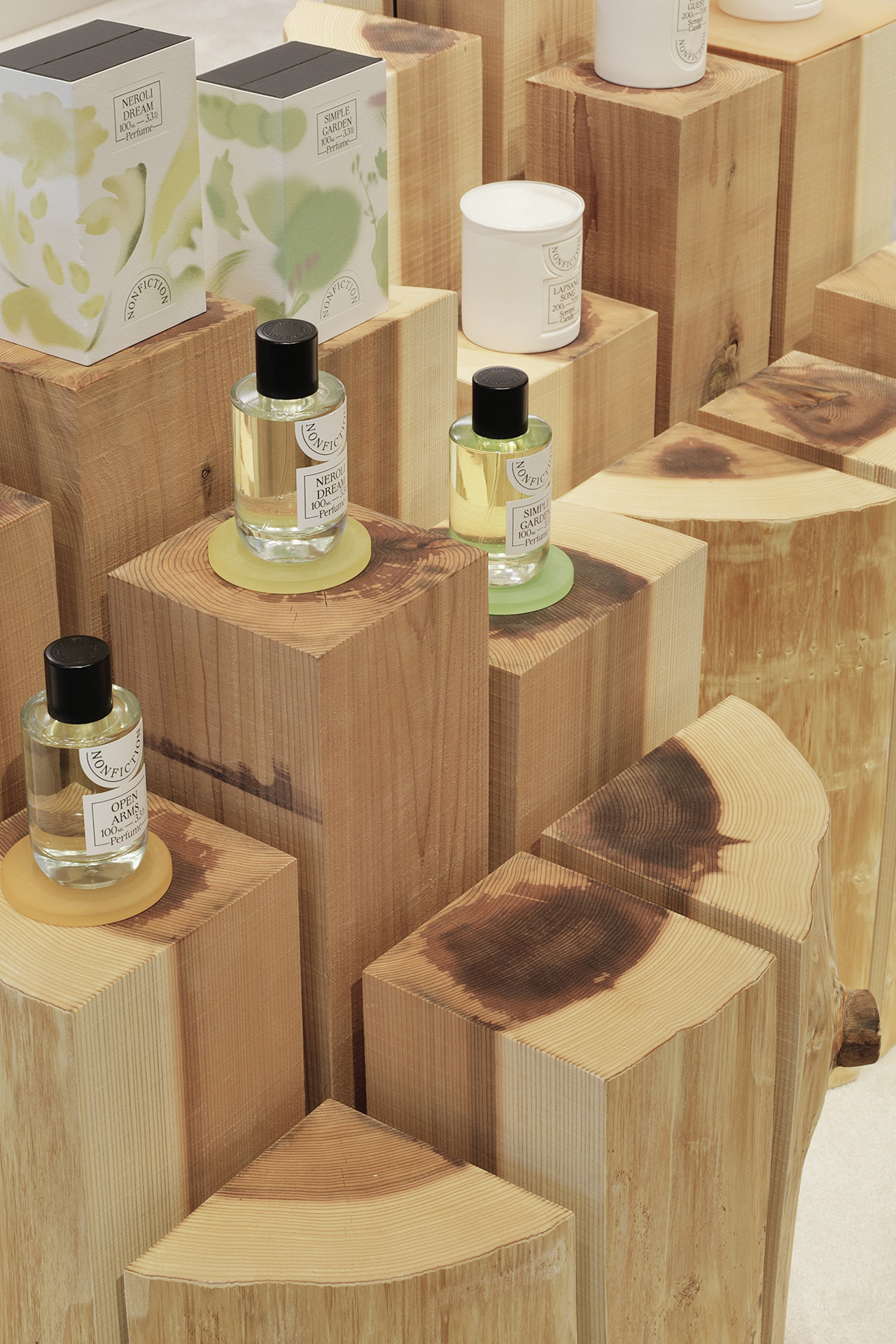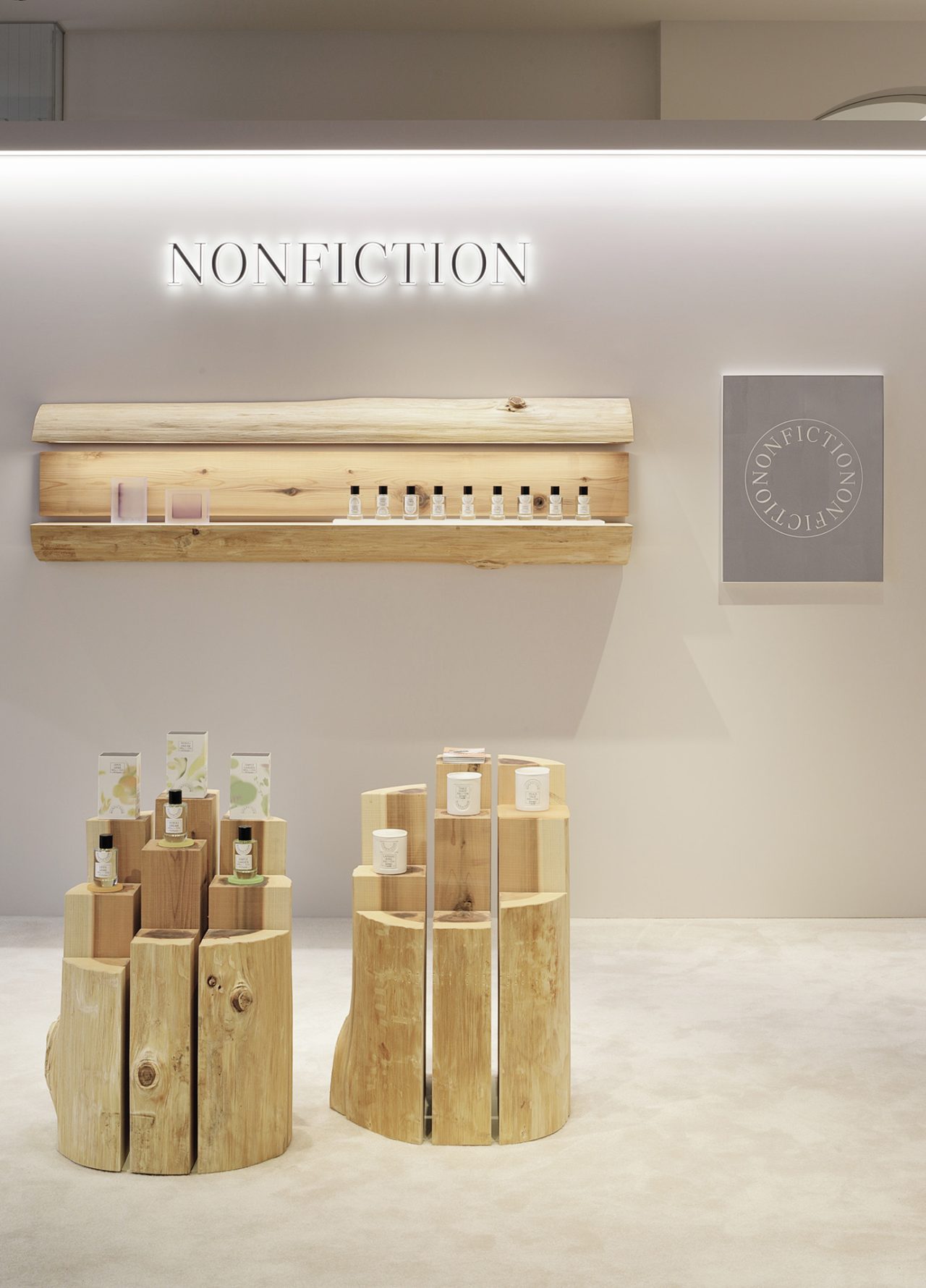 7月6日(土)より京都 BAL にて開催されるのは、クリエイティブ・ディレクターの Cha Heayoung (チャ・ヘヨン) が設立したライフスタイルビューティーブランド NONFICTION のポップアップ。一歩足を踏み入れると、日常の瞬間の静かな美しさと内なる時間の流れを探求するブランドエッセンスを感じられる空間が広がる。そこに配置されているのは、「一本の木から無駄なく什器に」をコンセプトに掲げ、林業事業者と協力して本ポップアップのために制作したインテリア。伝統的な木工技術を現代的に再解釈し、木の根から枝に至るまで木のあらゆる部分を活用して価値観の共有、実用性、美しさが調和して絡み合う思慮深いプロセスを大切にする NONFICTION を表現している。