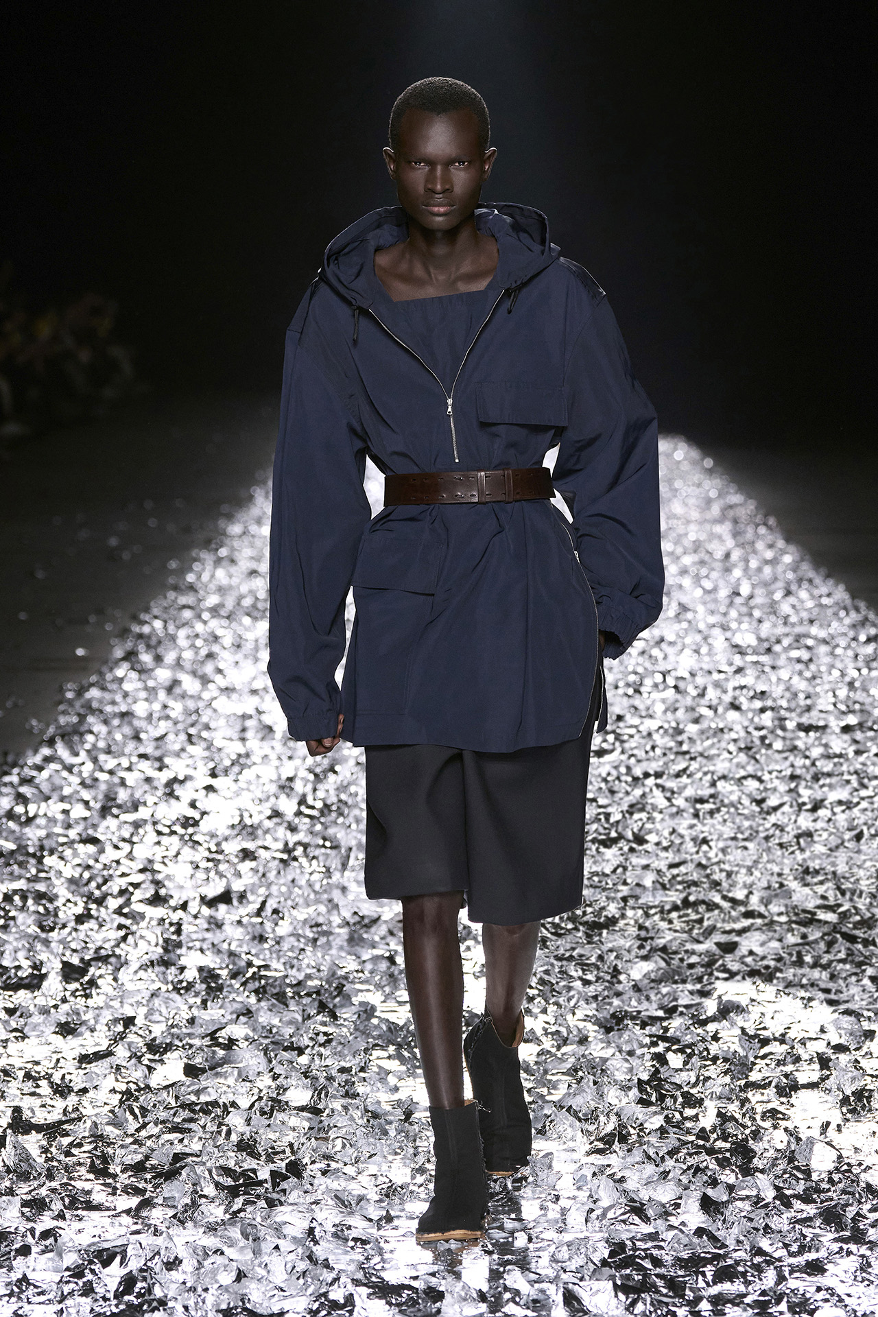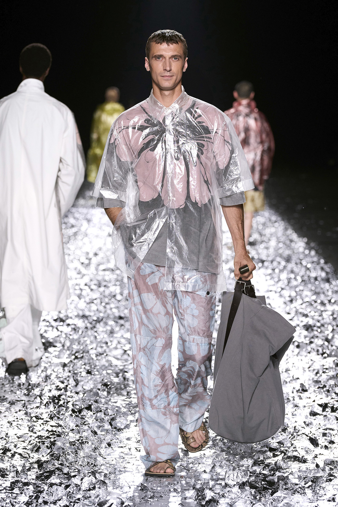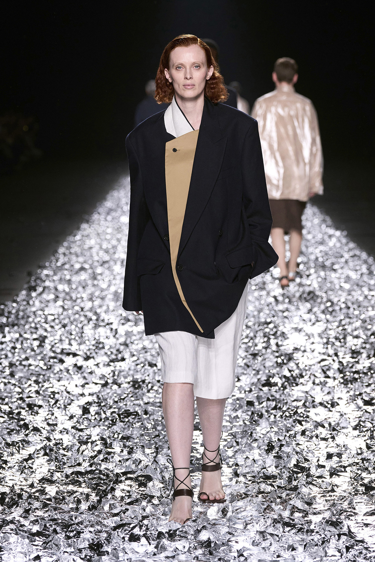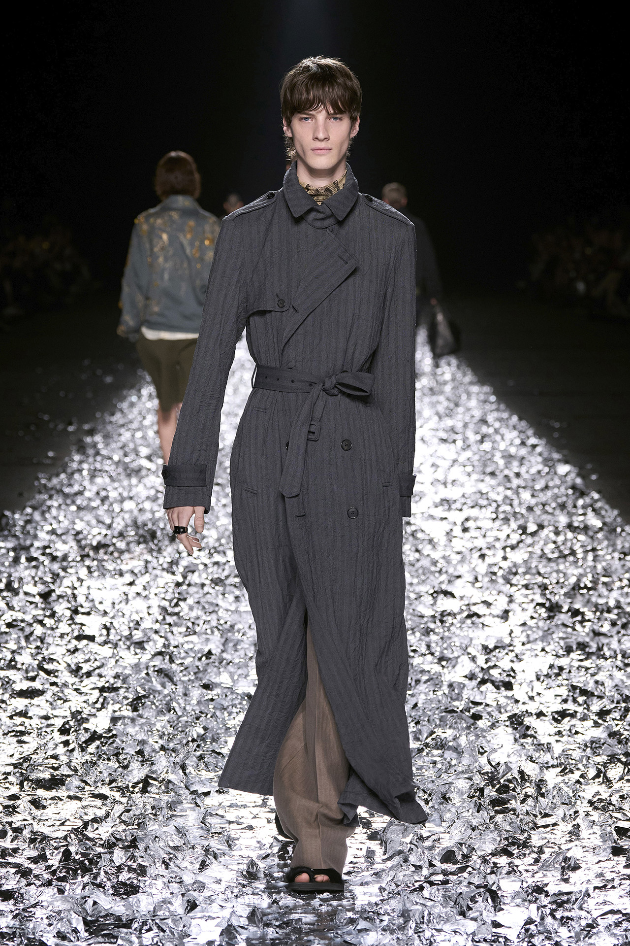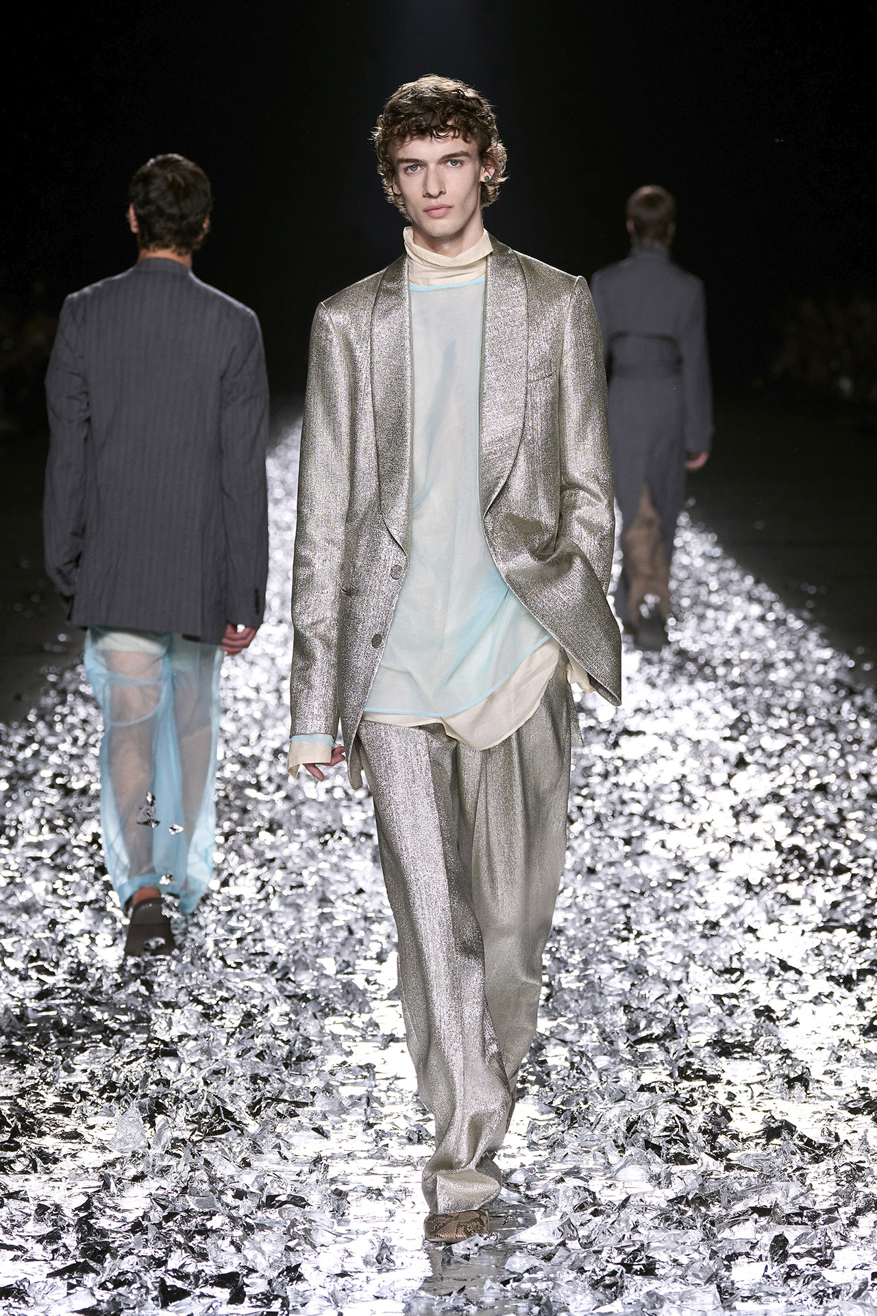 Dries Van Noten は、新たな試みとして日本の伝統的なマーブリング技法「墨流し」を採用。花火を彷彿とさせるグラフィカルなモチーフはひとつひとつ異なる表情を浮かべ、まるで身体感覚に身を委ねるようなしなやかさと表現力を発揮する。またショーにおいて目を引いたのは、メンズコレクションでウィメンズモデルを起用したこと。デザイナーは「誰もが望むものを着られることが幸せな世界だと思う。」と語り、モデル陣の中には1991年の初ショーでオープニングを飾ったモデルも顔を揃え、ブランドの軌跡と絆が胸を打つ。会場では David Bowie (デヴィッド・ボウイ) の音楽が流れ、モデルが歩くたびにランウェイに敷かれた銀箔が舞い上がる。ショーの最後に Dries Van Noten 本人が挨拶をし、ステージから立ち去ろうとすると大きなミラーボールが出現。38年間という歴史に賛辞を送るとともに、これからの Dries Van Noten への期待にも胸が膨らむ。