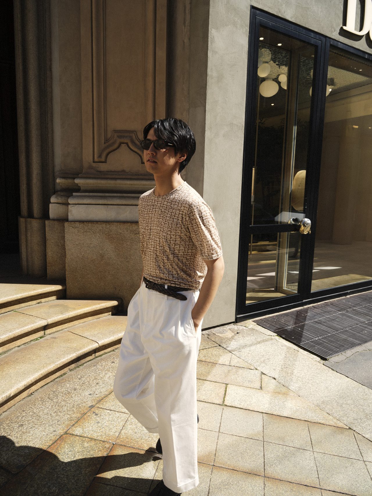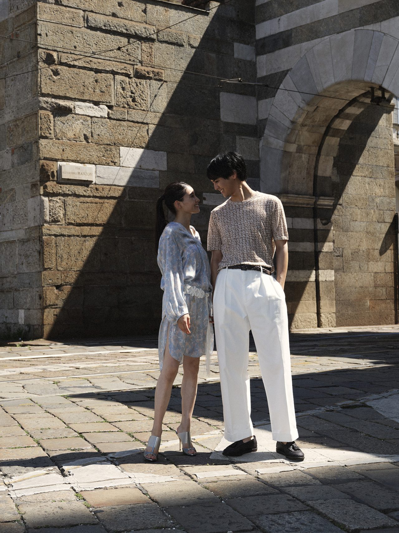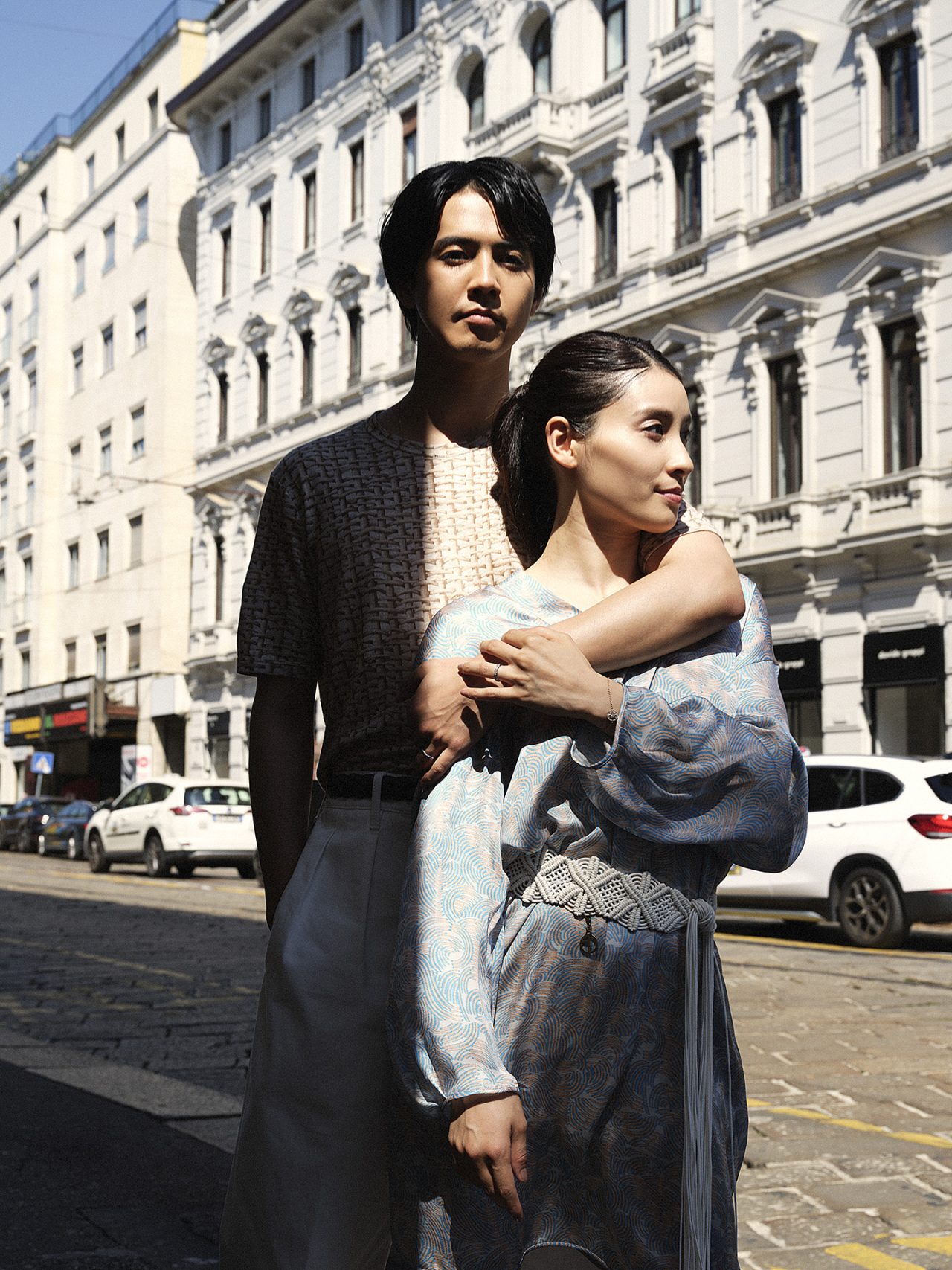 GIORGIO ARMANI の2025年春夏メンズコレクションショーは、創業者とも親交が深い日本人建築家・安藤忠雄が設計したミラノの多目的空間「Armani/Teatro (アルマーニ/テアトロ)」で開催された。フロントローを飾る顔ぶれの中でもひときわ注目を集めたのが、ミラノコレクション初参加となる片寄涼太・土屋太鳳夫妻である。片寄は2024年春夏コレクションのセットアップを着用し、地中海リゾートからイメージされたアースカラーがシルクレーヨンの質感と相まって柔らかな印象。一方土屋は同コレクションからタキシードにインスパイアされた光沢のあるルレックス素材のドレスをチョイスし、華やかかつ上品な魅力を放った。