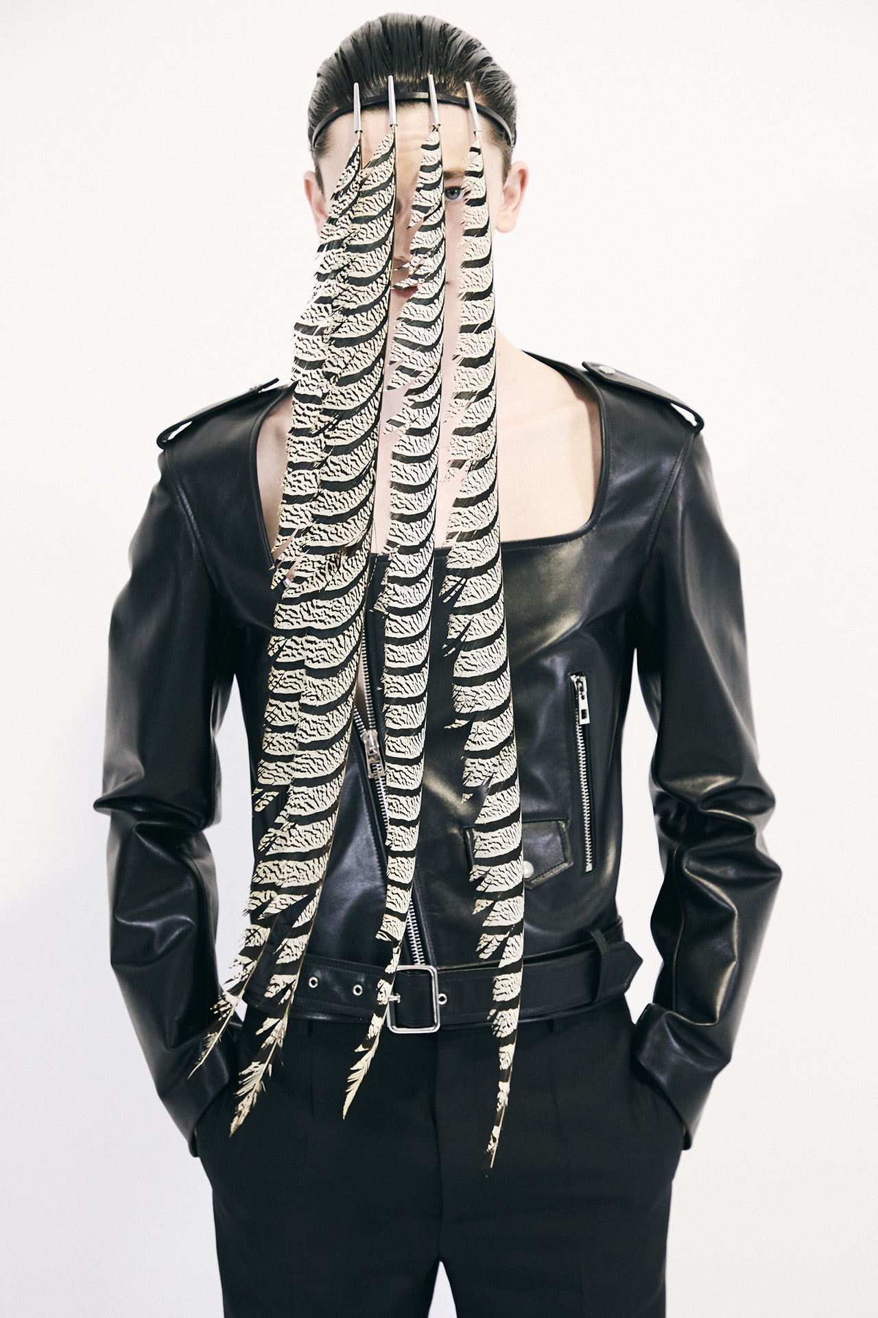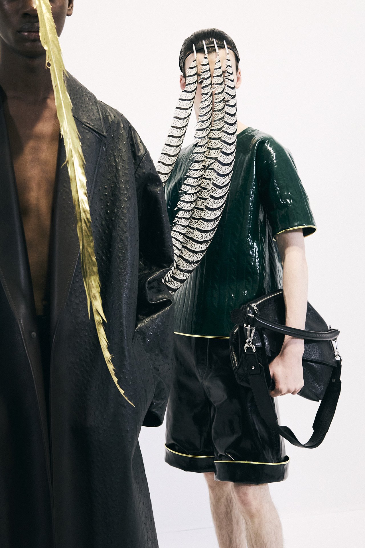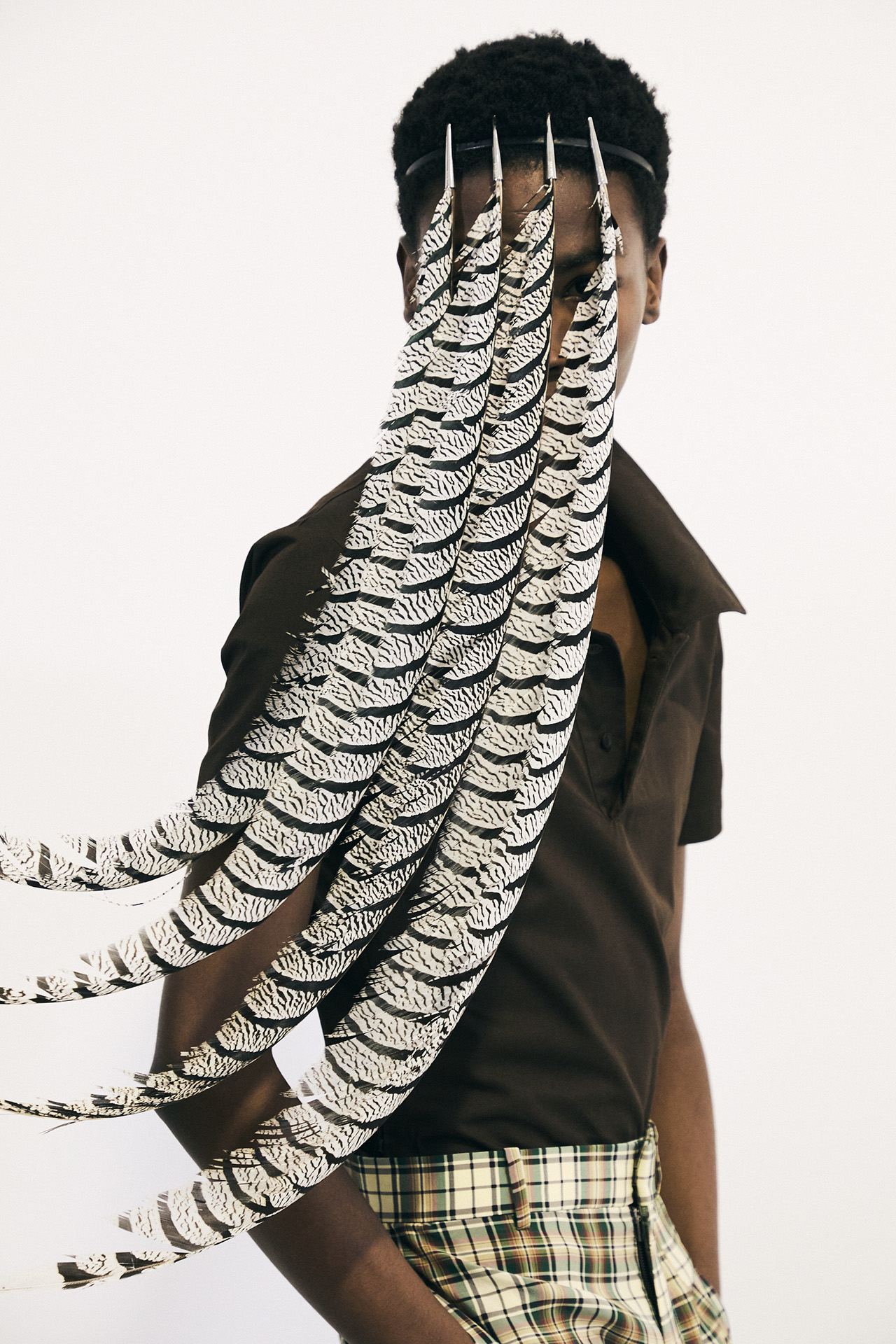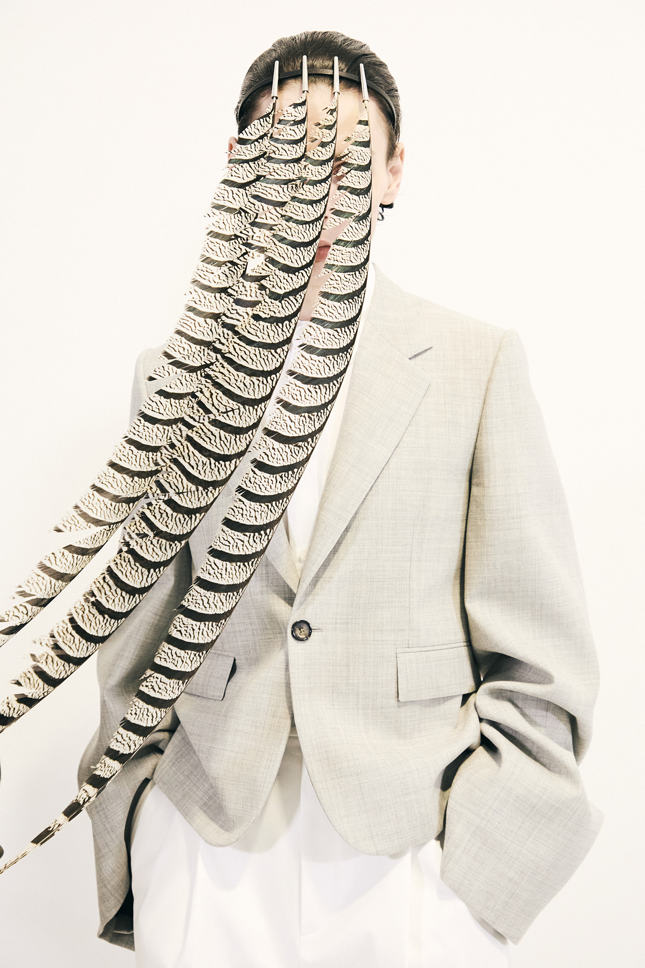 顔の中央から胸に向かって垂れ下がるようにあしらわれた長いフェザーは、Scarpa や Mackintosh の作品における、上方へと向かう垂直性を逆転させたかのよう。ディアスキンで作られたパズルバッグはつややかな仕上げで、新たなアティチュードを表現している。