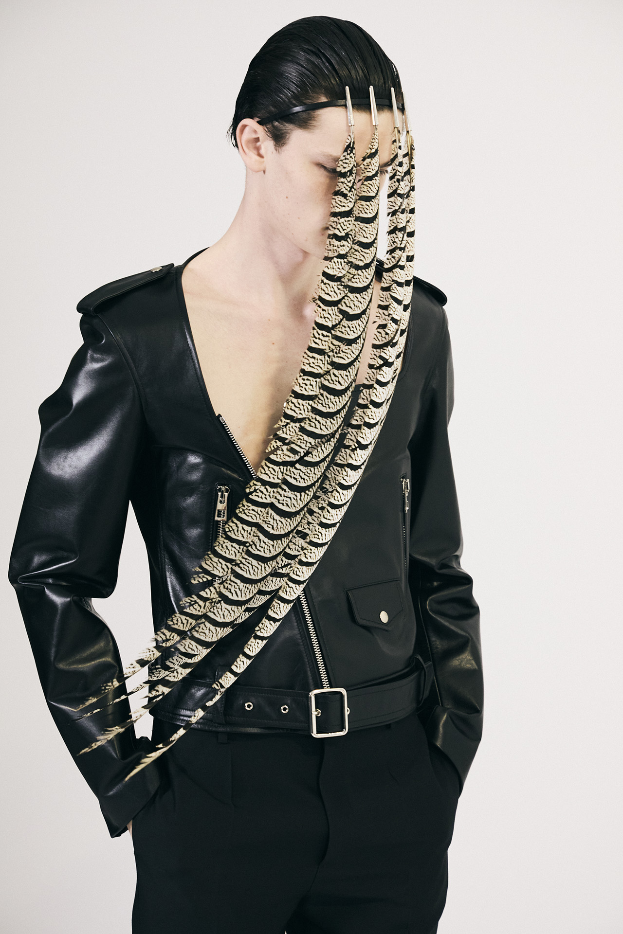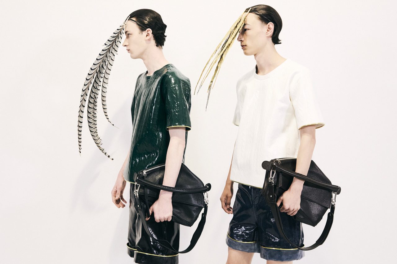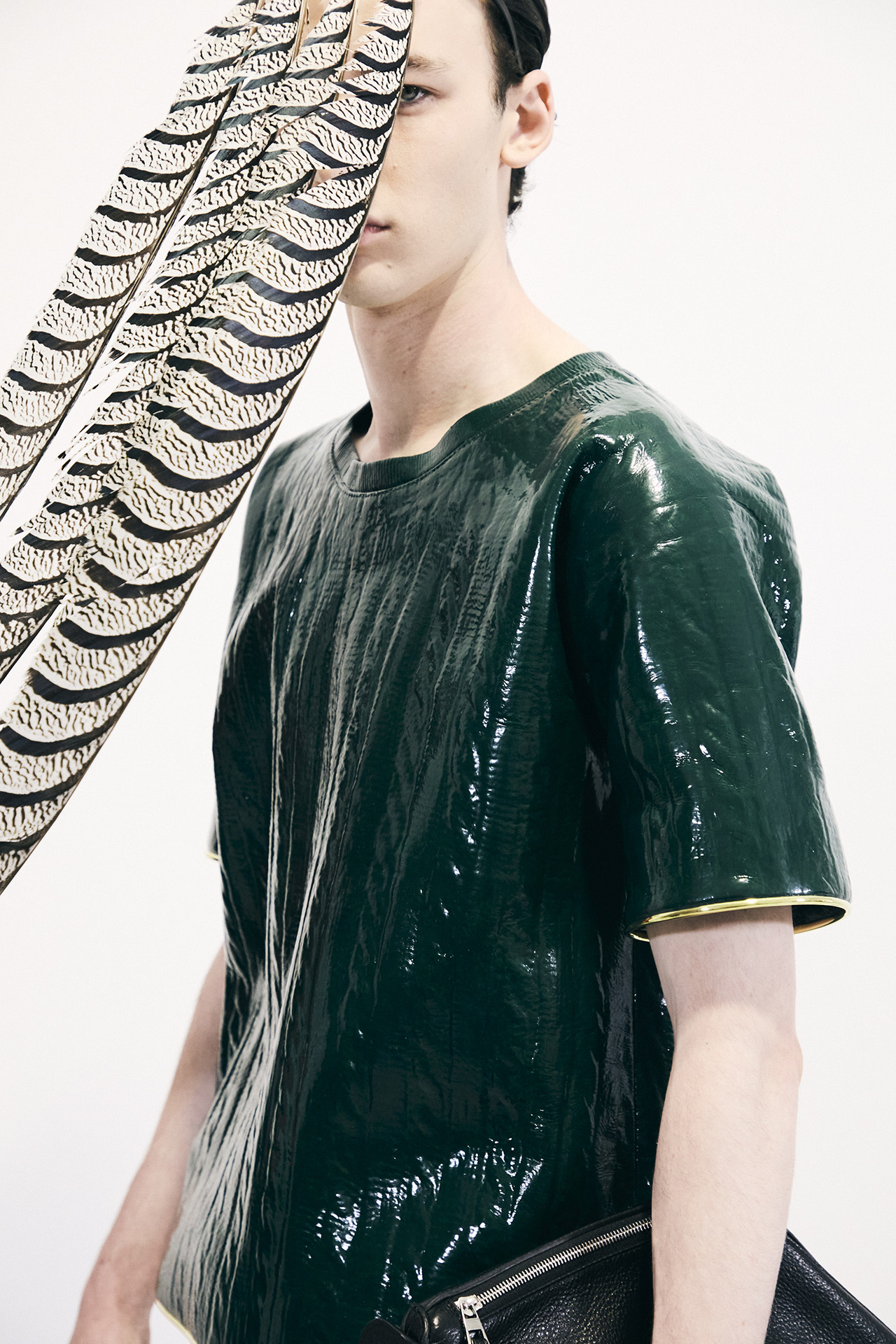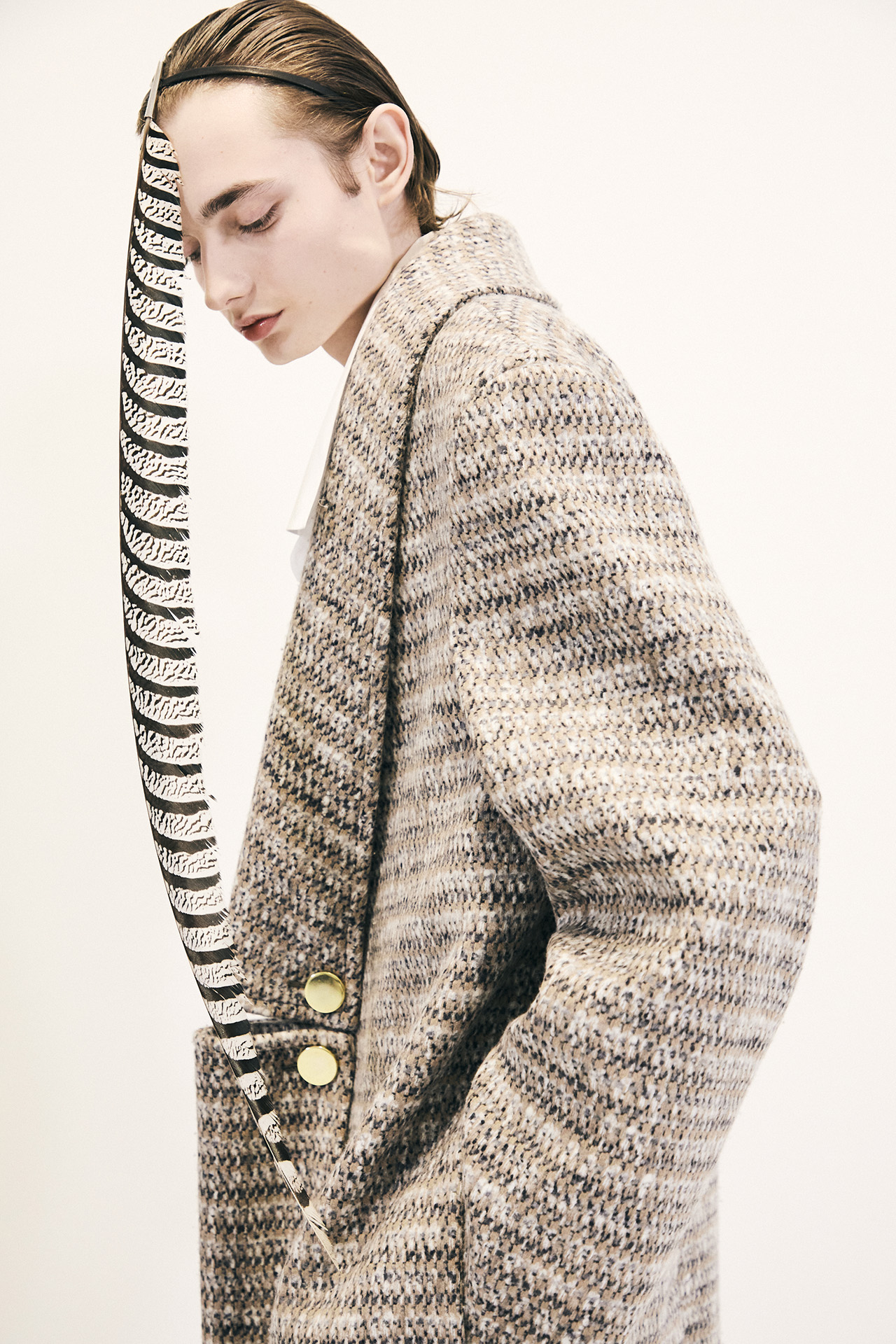 顔の中央から胸に向かって垂れ下がるようにあしらわれた長いフェザーは、Scarpa や Mackintosh の作品における、上方へと向かう垂直性を逆転させたかのよう。ディアスキンで作られたパズルバッグはつややかな仕上げで、新たなアティチュードを表現している。