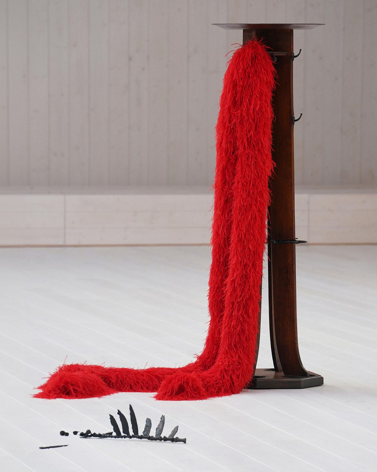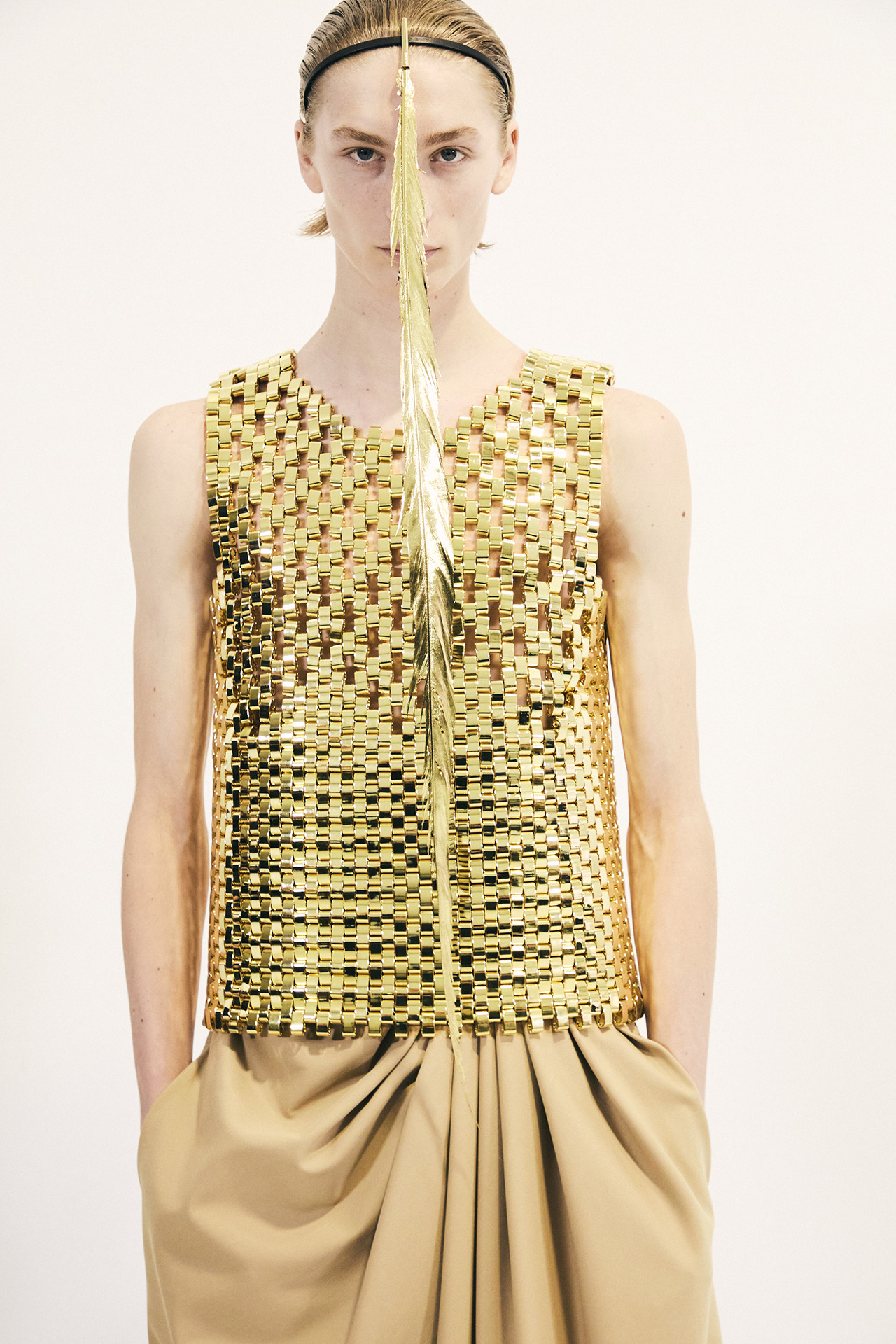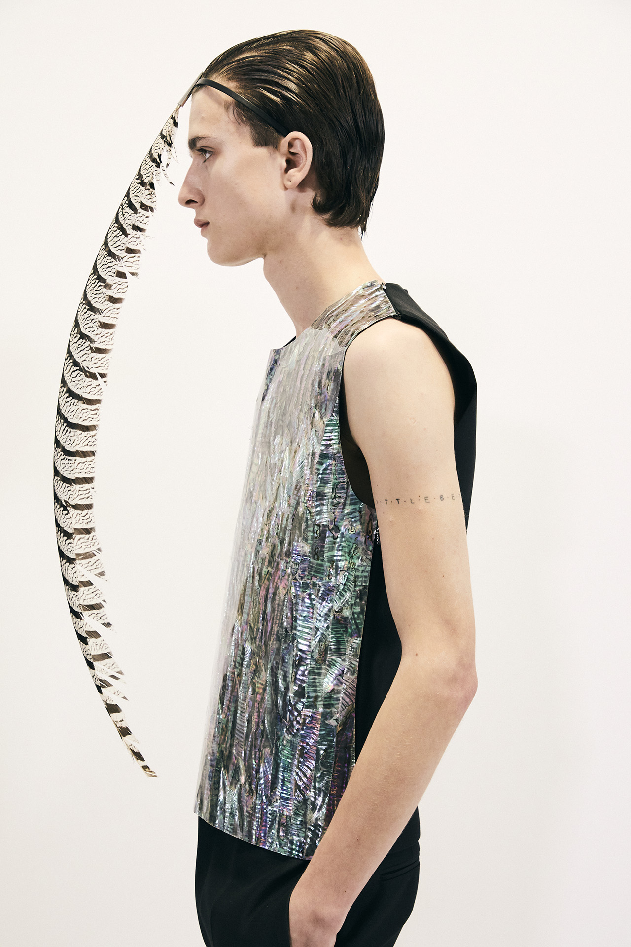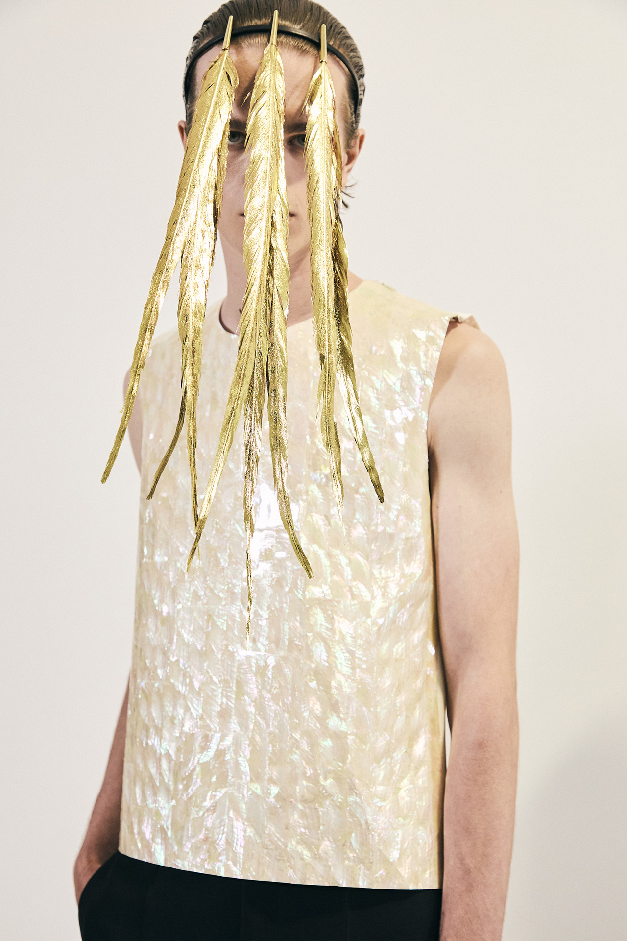 顔の中央から胸に向かって垂れ下がるようにあしらわれた長いフェザーは、Scarpa や Mackintosh の作品における、上方へと向かう垂直性を逆転させたかのよう。ディアスキンで作られたパズルバッグはつややかな仕上げで、新たなアティチュードを表現している。