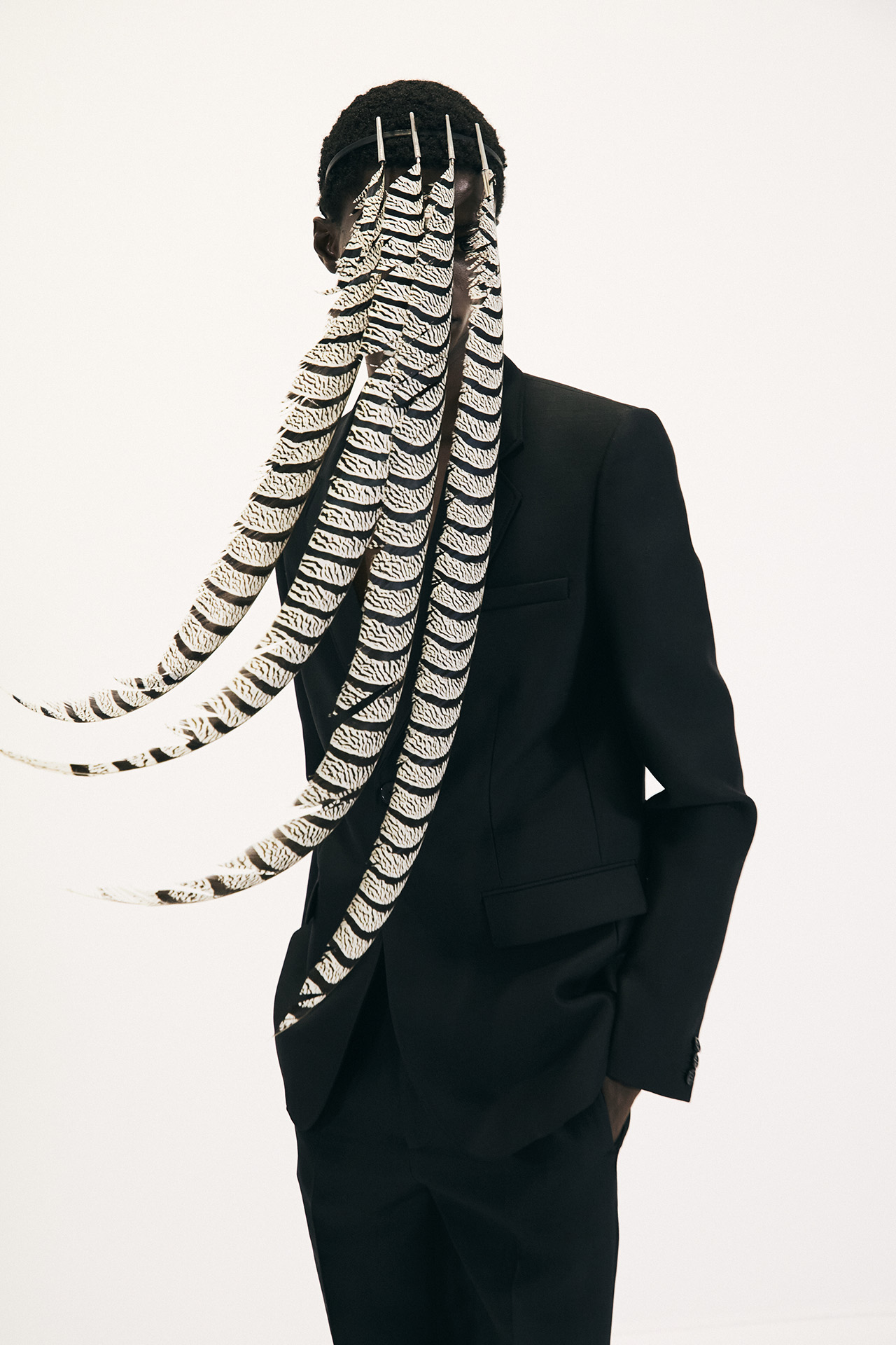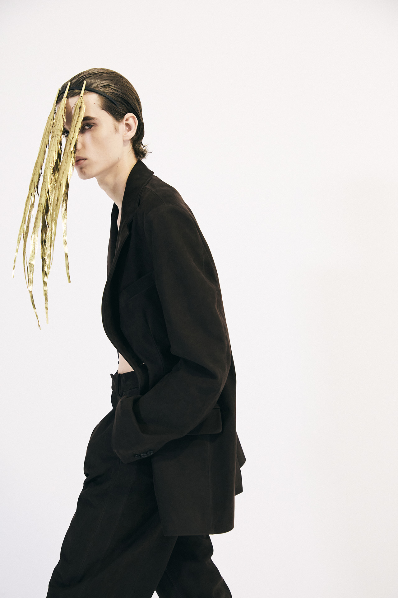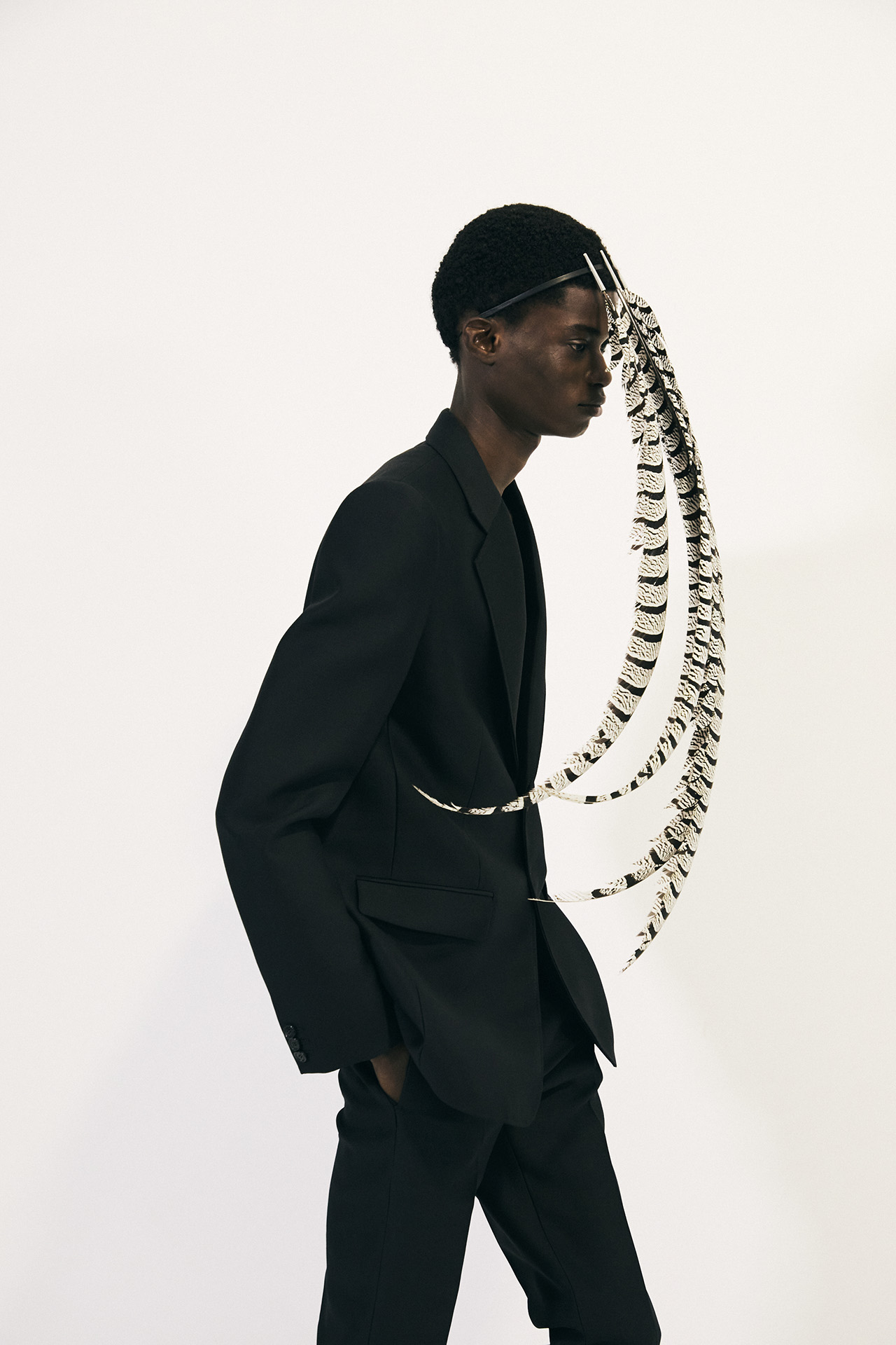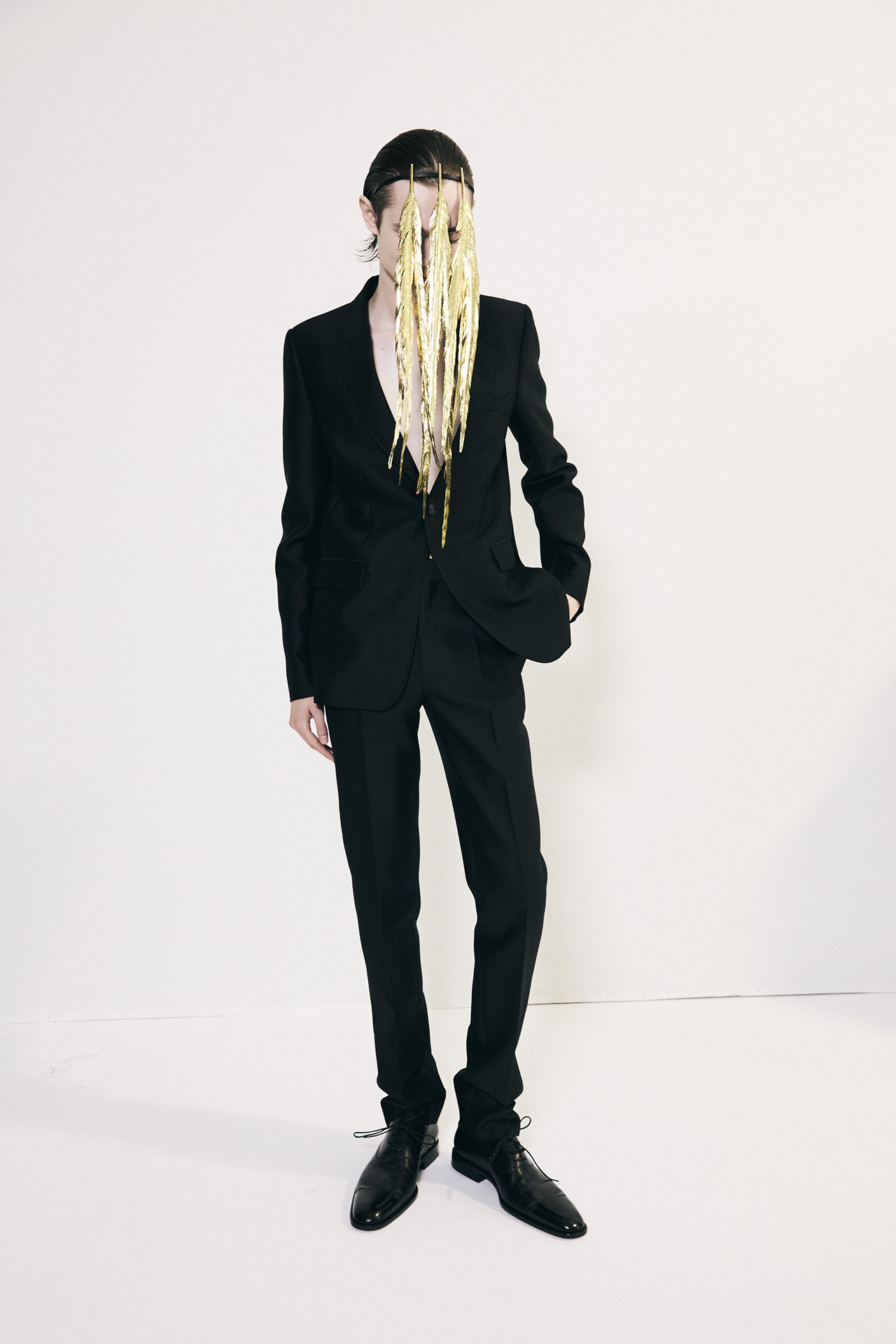 広大なショースペースと、そこに散りばめられた個人的なオブジェクト。ミクロとマクロの絶えまない相殺は、削減と精度の追求を積み重ねることで生まれたコレクションにも表れている。繰り返し登場するブラックのテーラードスーツはスリムでありながら、そのテクスチャーはボリュームに反応してスポンジのように動く。組み合わせているのは伸長したオックスフォードシューズのみだ。