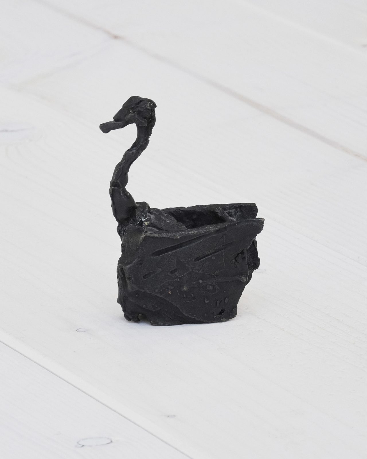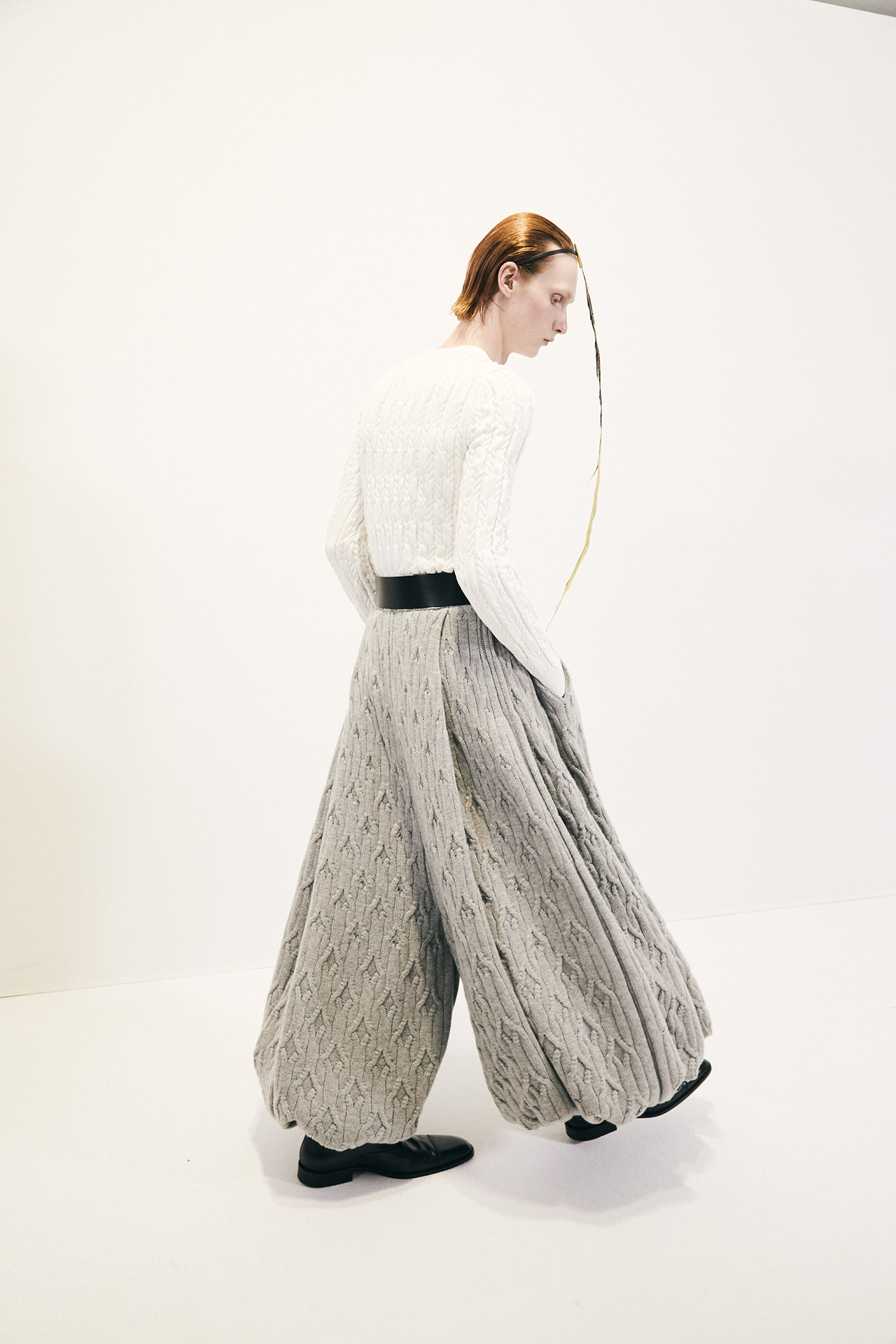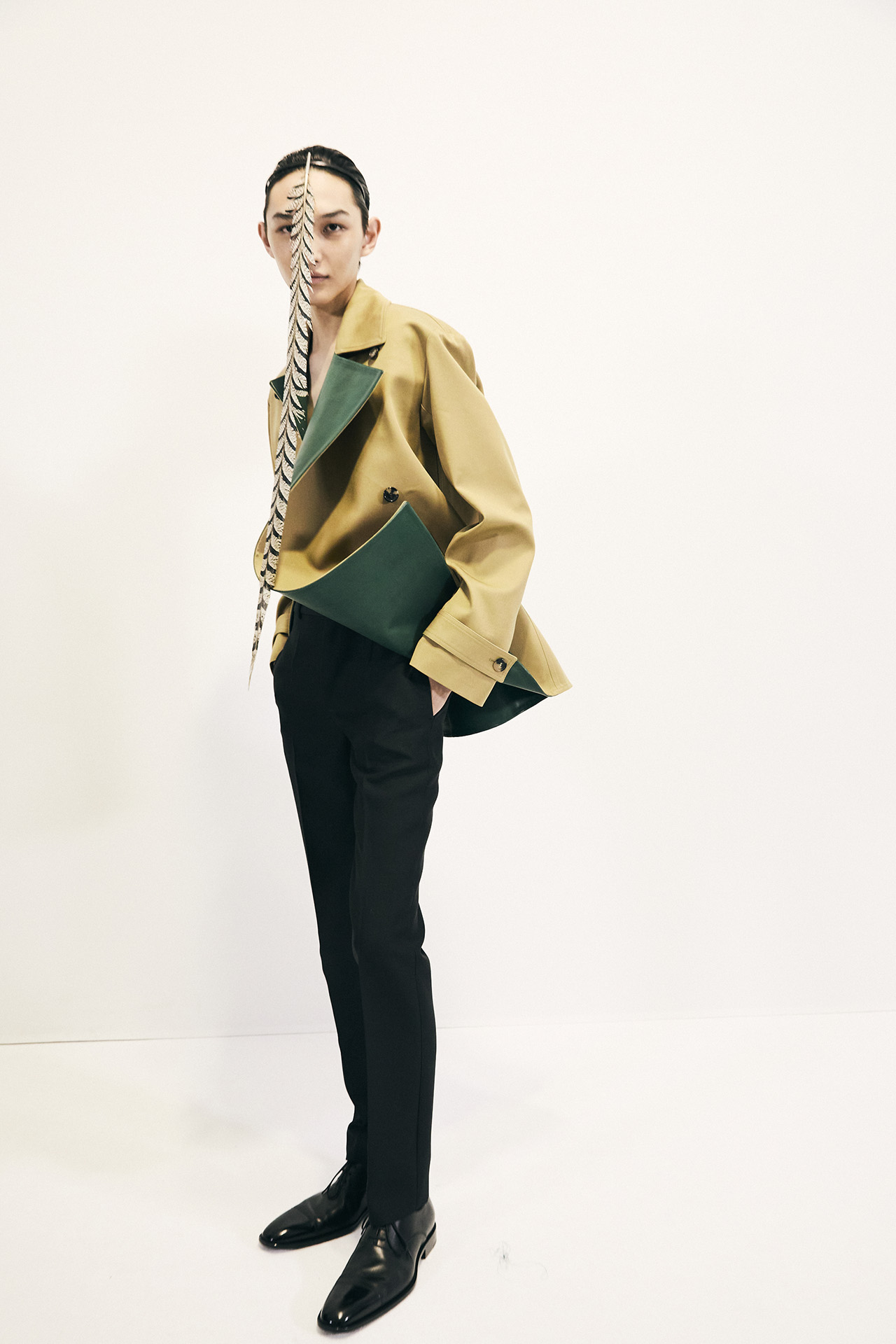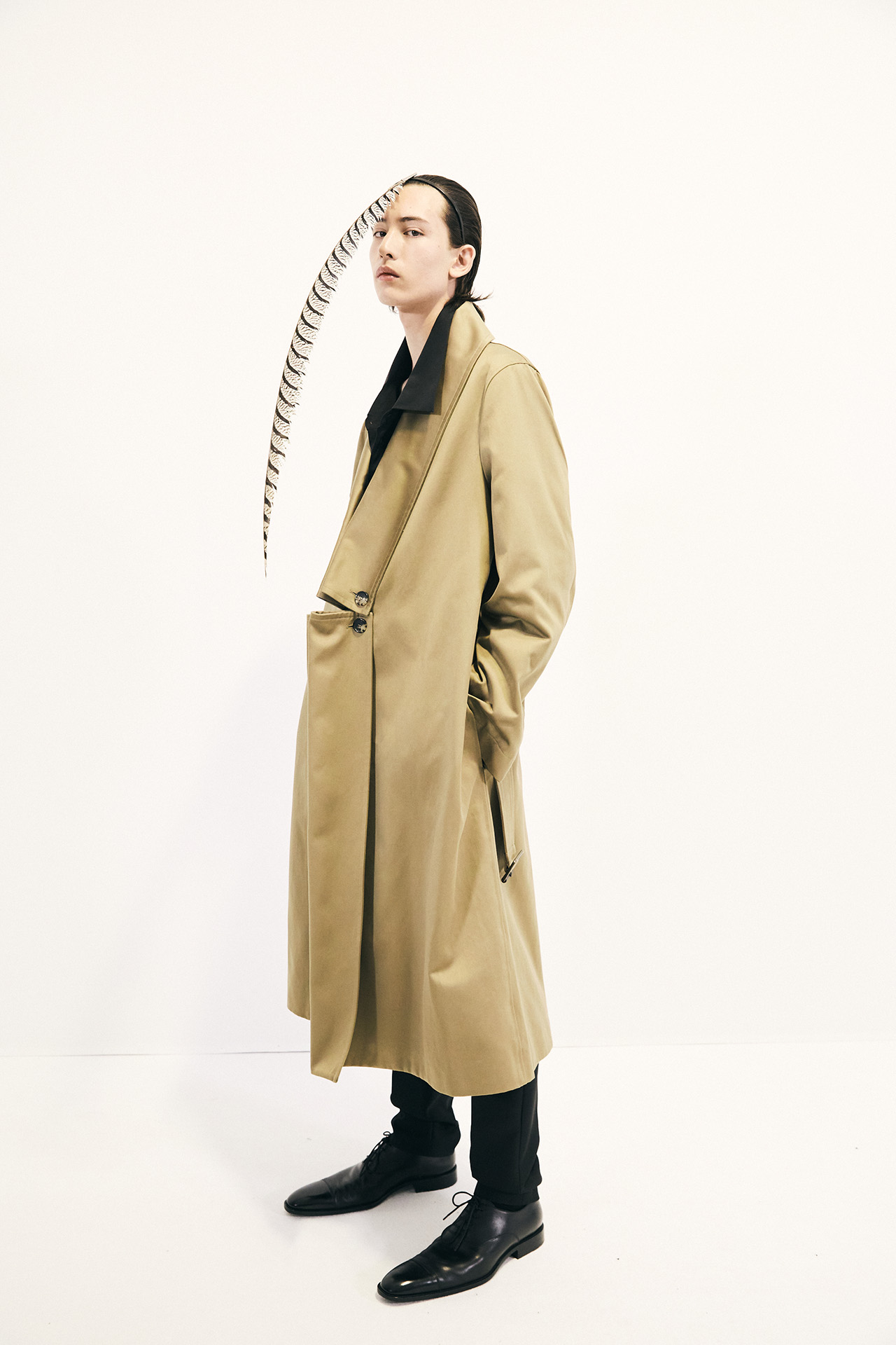 広大なショースペースと、そこに散りばめられた個人的なオブジェクト。ミクロとマクロの絶えまない相殺は、削減と精度の追求を積み重ねることで生まれたコレクションにも表れている。繰り返し登場するブラックのテーラードスーツはスリムでありながら、そのテクスチャーはボリュームに反応してスポンジのように動く。組み合わせているのは伸長したオックスフォードシューズのみだ。