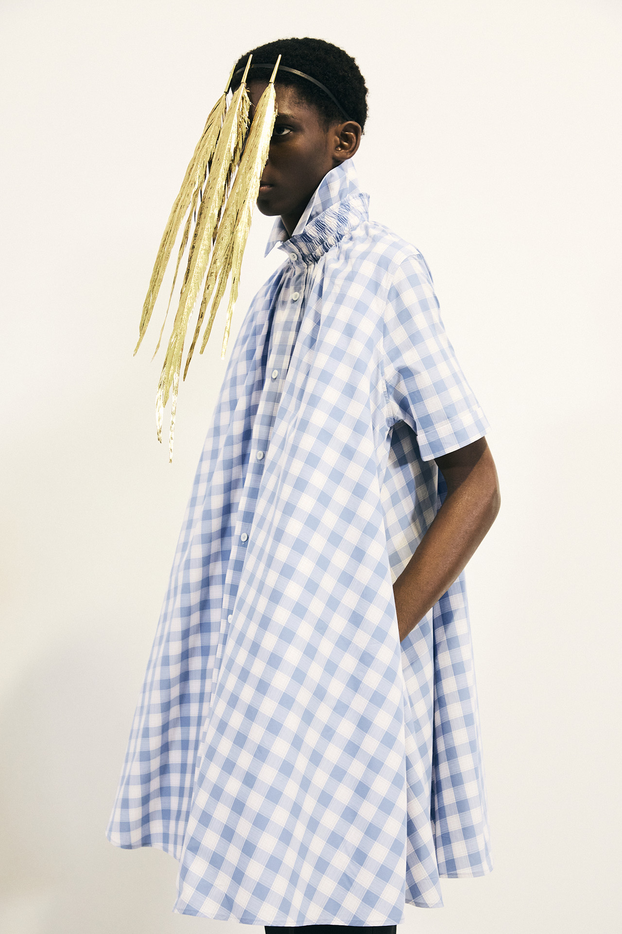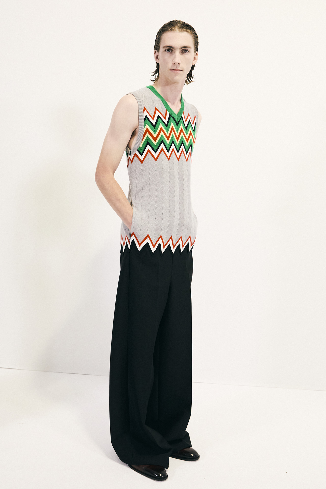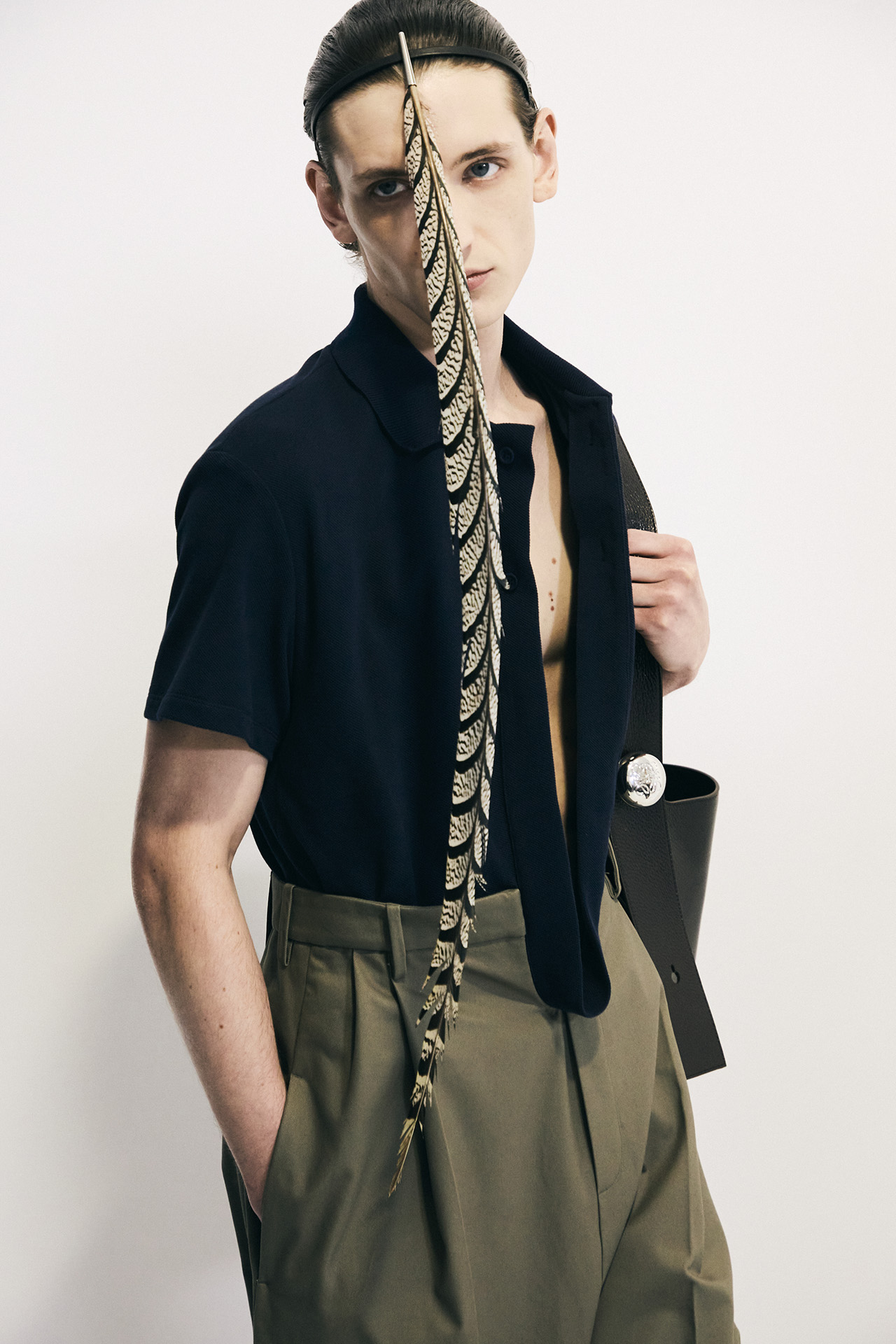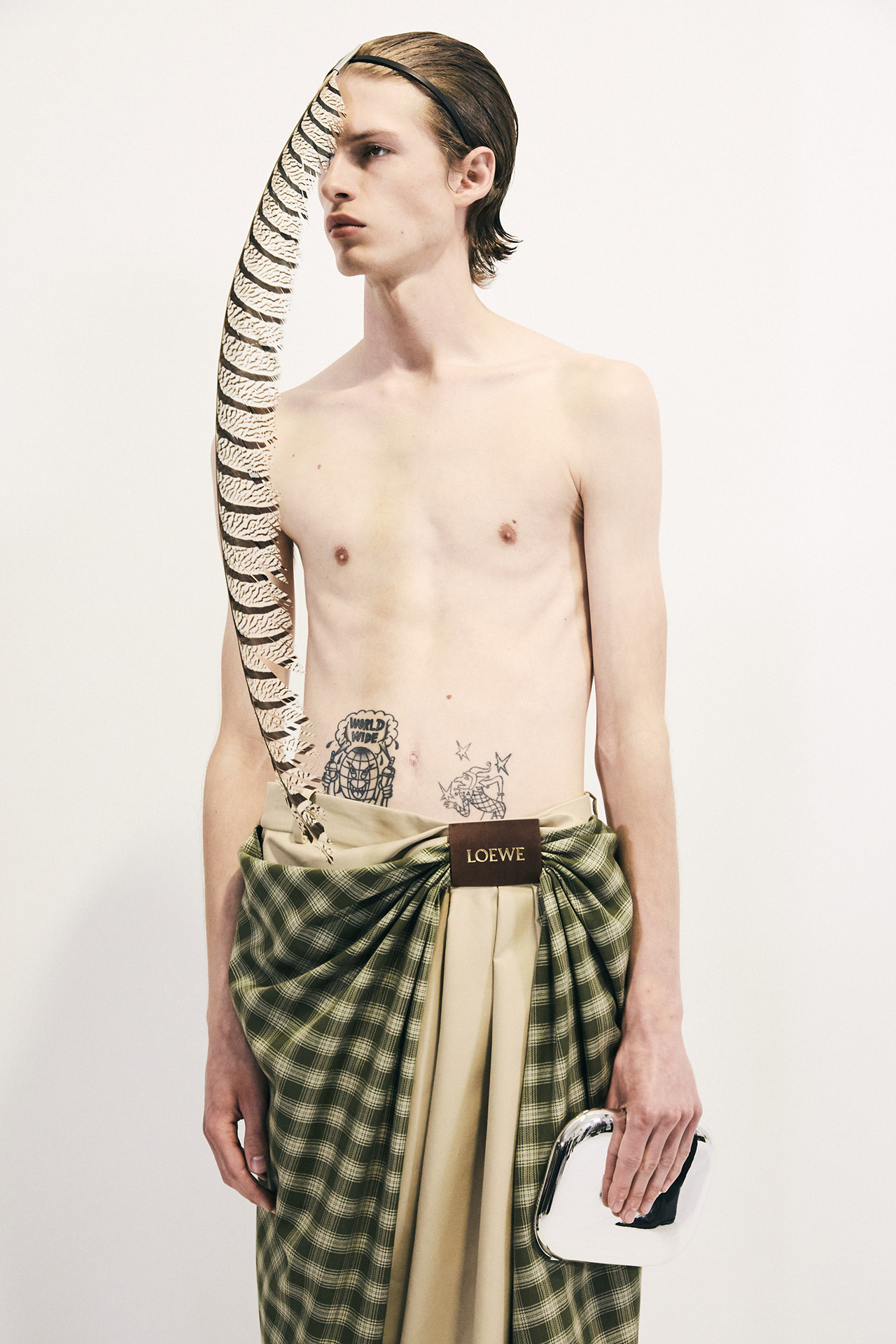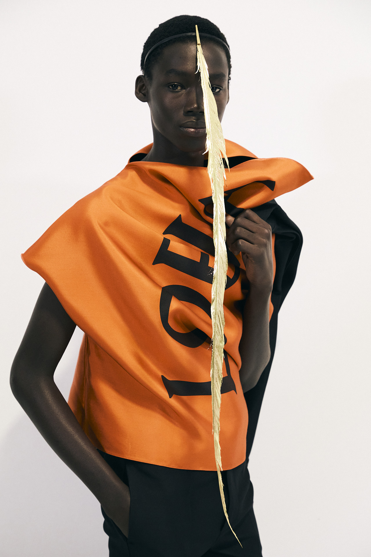 LOEWE の春夏メンズウェアコレクションがお披露目されたのは、木材で作られたショースペースである。会場全体に配置されたアートワークの数々は一見無作為に選び出されたように思えるが、実はアメリカの作家 Susan Sontag (スーザン・ソンタグ) が提唱した「芸術の官能美学」に呼応している。1966年のエッセイ『反解釈』(1966) の中で彼女は、作品に意味を押し付けようとする現代批評の傾向に反対し、代わりにアートオブジェクトの神秘と、鑑賞者がそれぞれの仕方で関わることのできるような美しさを信じた。
