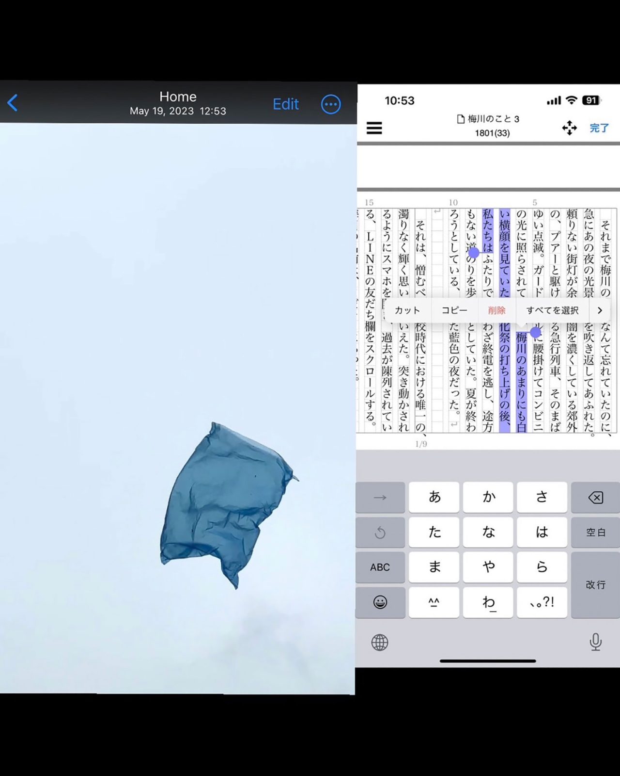 本展は、エッセイスト・俳優の内田紅甘と髙田将伍の二人によるもの。内田が2023年に flotsam books で開催した展示「私からの眺め」では自身の内面にフォーカスしていたが、今回は、一度しか会ったことのなかった髙田とお互いの写真を並び合わせることによって同じ世界を捉えていながら、交わることのない二人の視線や、他者との関係性といった世界観を提示する。髙田は今までに即興的、反射的に撮ってきた記憶の断片とでもいうべき写真の一部を内田との展示に合わせて展示。