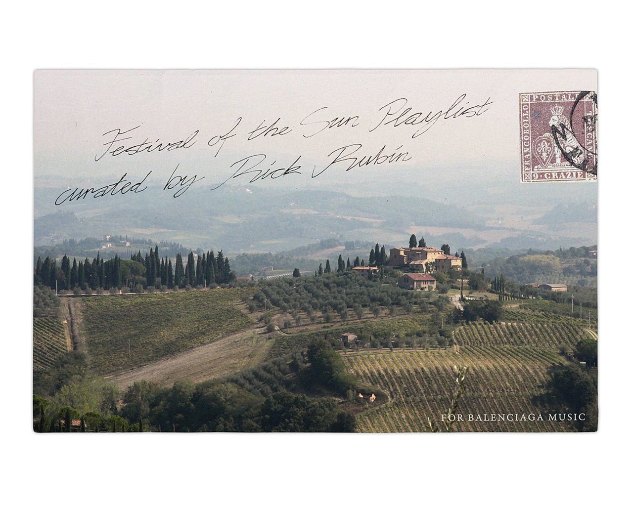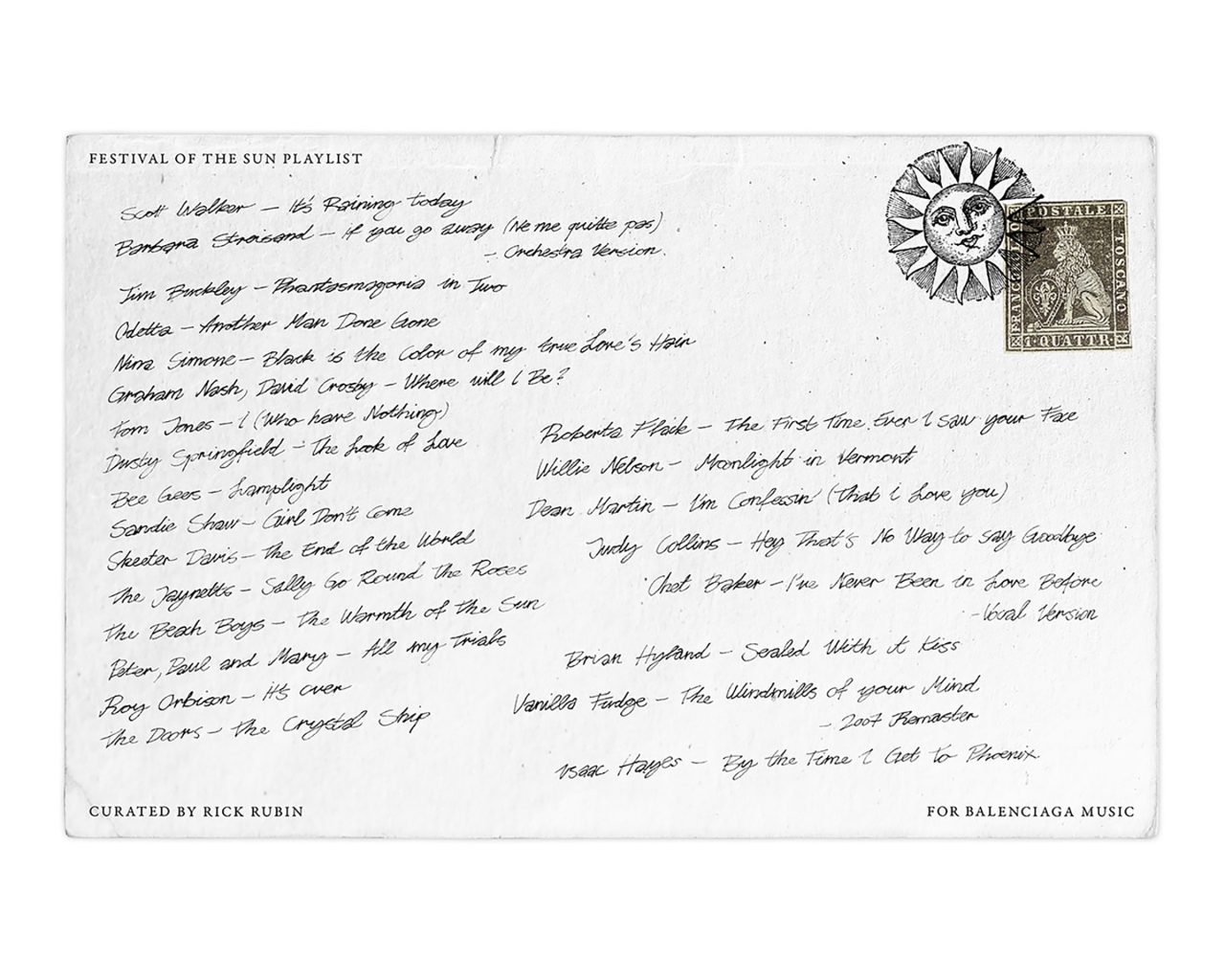 彼が選別した24曲のプレイリストは、トスカーナ州のカーゾレ・デルザにて夏至に合わせて開催されるイベント The Festival of the Sun (ザ・フェスティバル・オブ・ザ・サン) を祝すものだ。終わりと始まりの感情を呼び起こすこのプレイリストは、複数のストリーミングプラットフォームにリンクする Balenciaga の専用ページからアクセスできる。