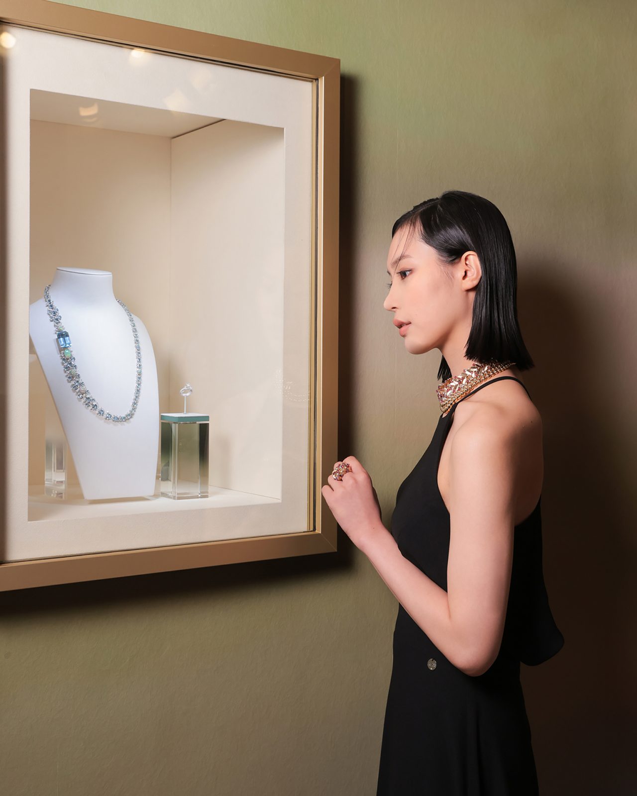 しなやかな曲線やダイナミックな動きを感じさせるグラフィカルなデザインからインスパイアされた MOVEMENT エリア、ストーンが持つ輝きを最大限に引き出すクリエイションを表現する LIGHT エリアなど、会場内は5つの各エリアに分けられている。COLORS エリアでは、明治記念館の「金鶏の間」の壁紙の色調を反映したウォールに、 厳選された上品なストーンや革新的なコンビネーションなど、カラーが際立つクリエイションを展示。