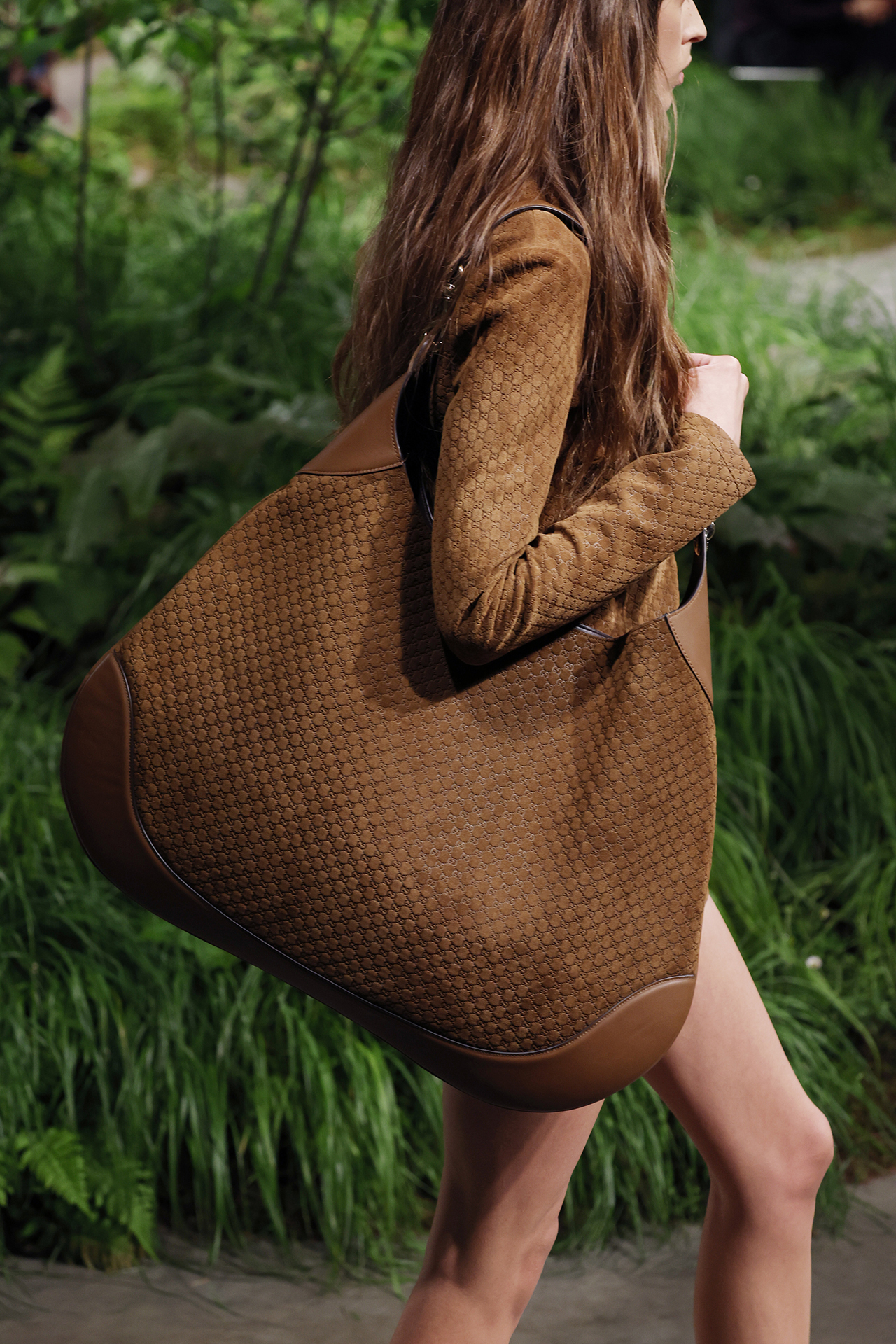 モデルが着用している2024年秋冬ウィメンズコレクションは、対比する要素が調和する情景を描き出したもの。質感豊かなウールのコートには繊細なエンブロイダリーを施したスリップドレスが組み合わされ、力強さとセンシュアルな雰囲気が出会った。ソフトでナチュラルなカラーとクリーンなカットでシルエットを際立たせたルックには、思いがけない色彩がアクセントを与えている。キャンペーンの主役になるのは、新作の「グッチ B」バッグ。ゆったりとしたオーバーサイズのシルエットと、2つのスナップフック ハードウェアを備えたミディアムレングスのショルダーストラップが特徴だ。1950年代半ばに GUCCI の職人のノートに初めて登場したもので、それに続くアーカイブの美学を宿している。