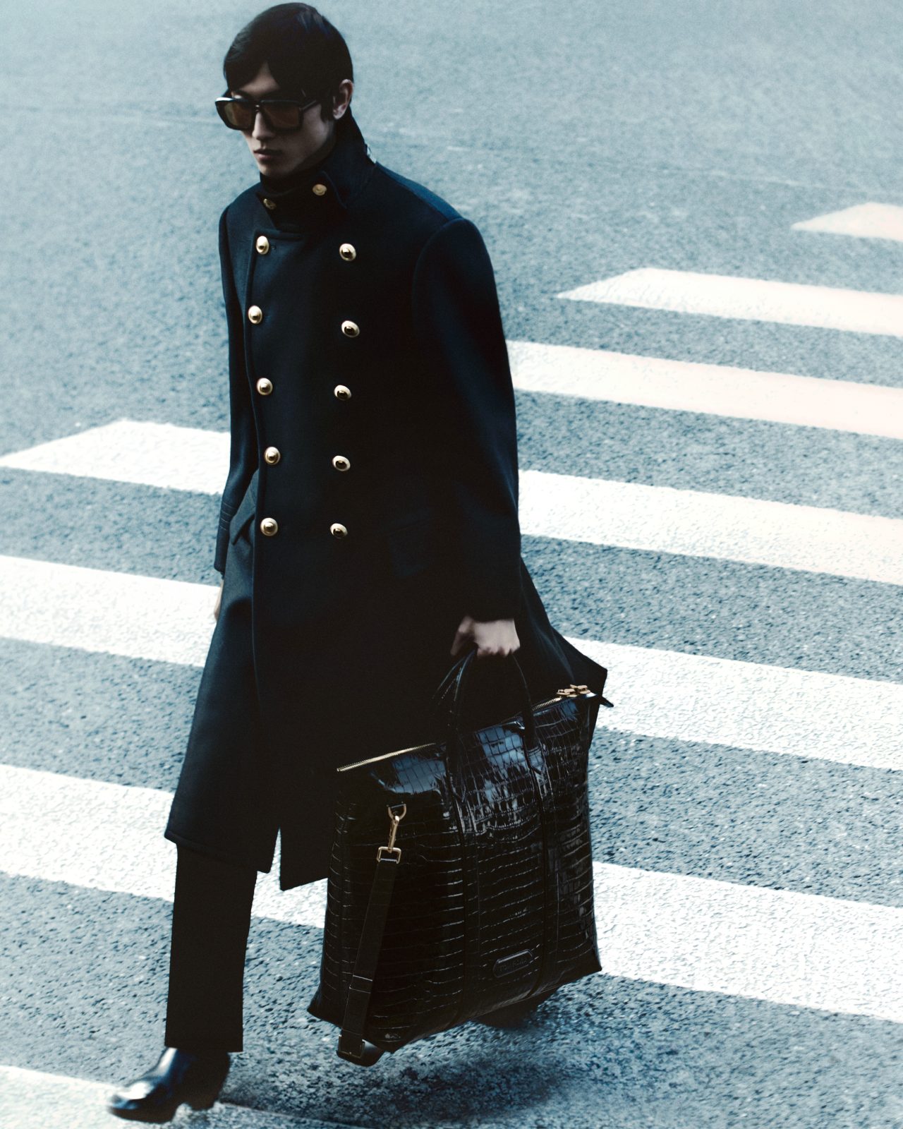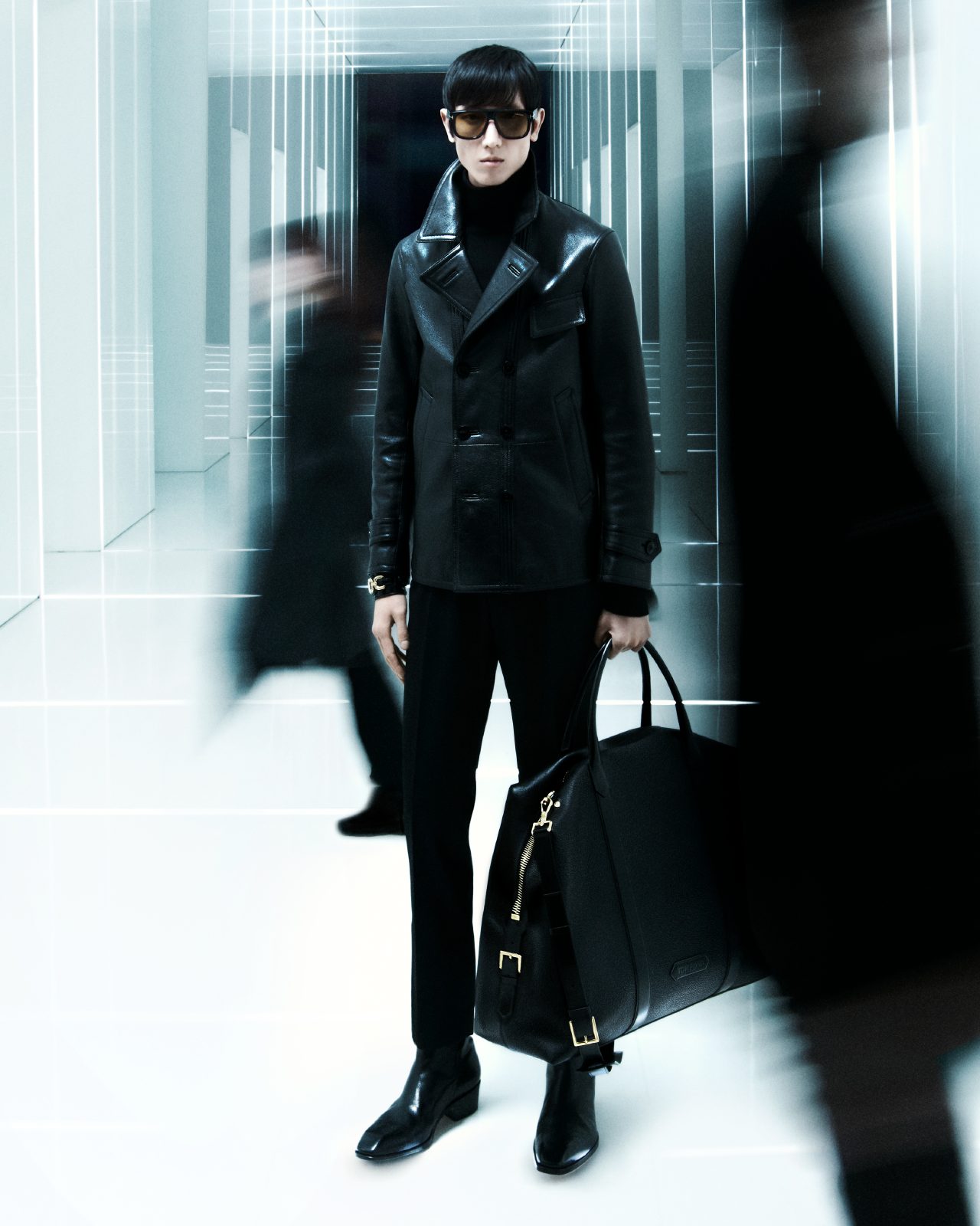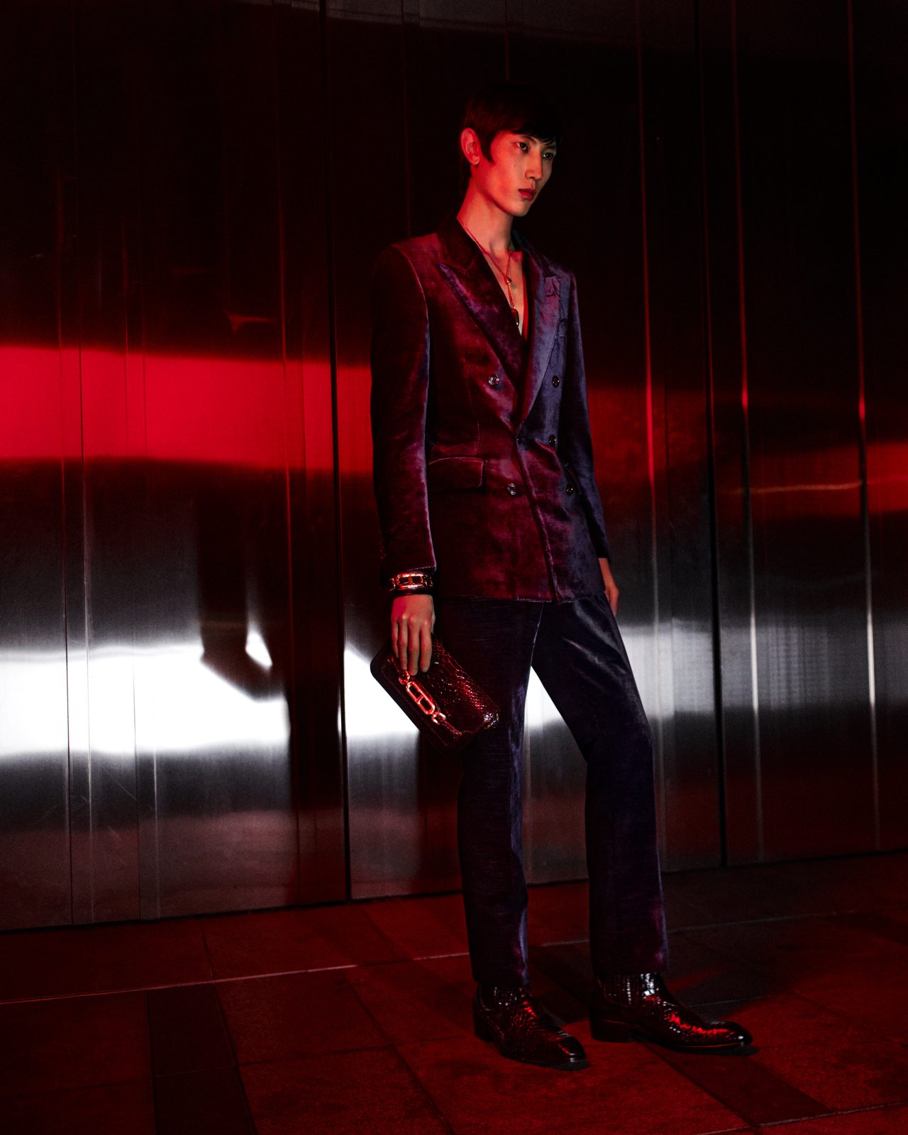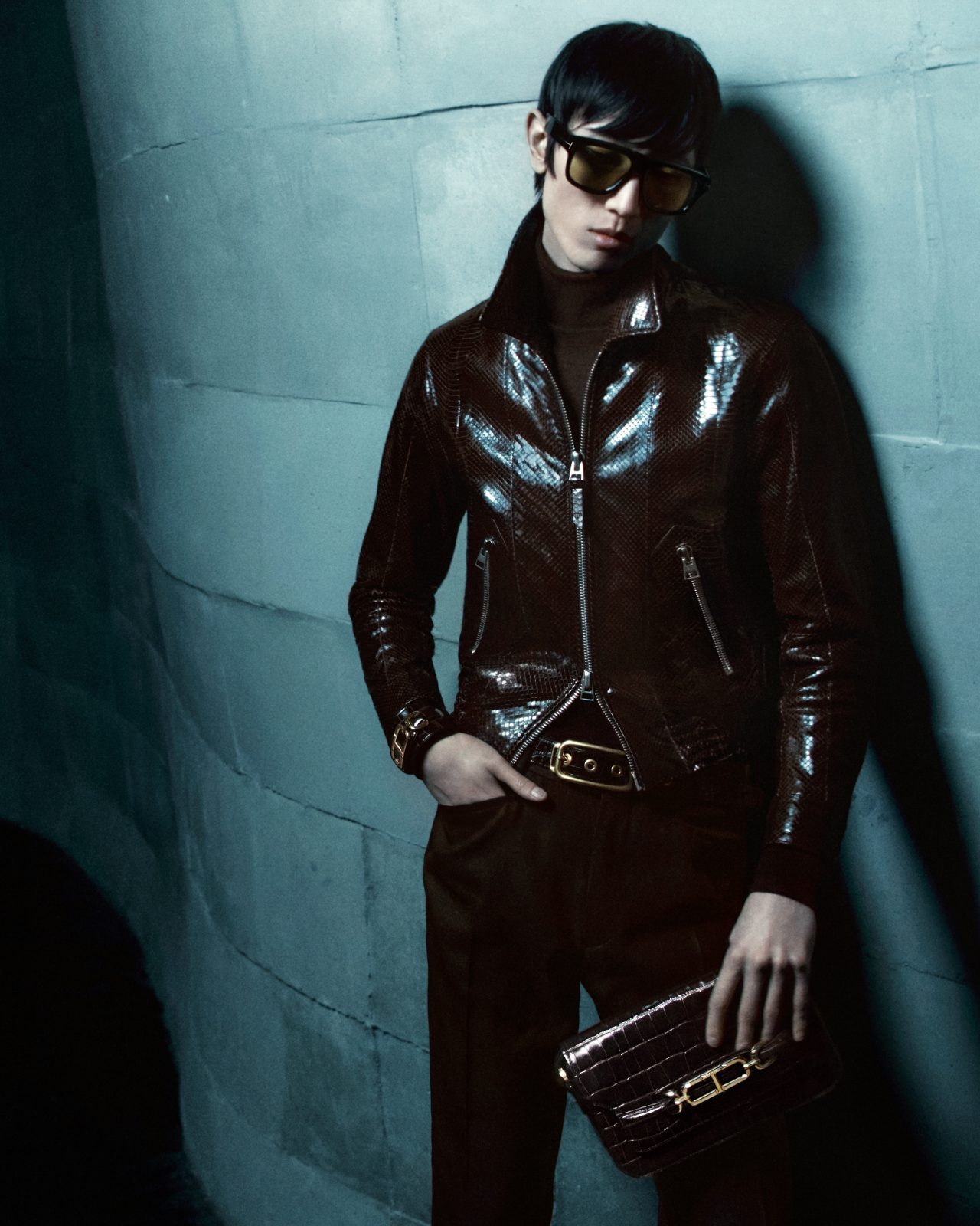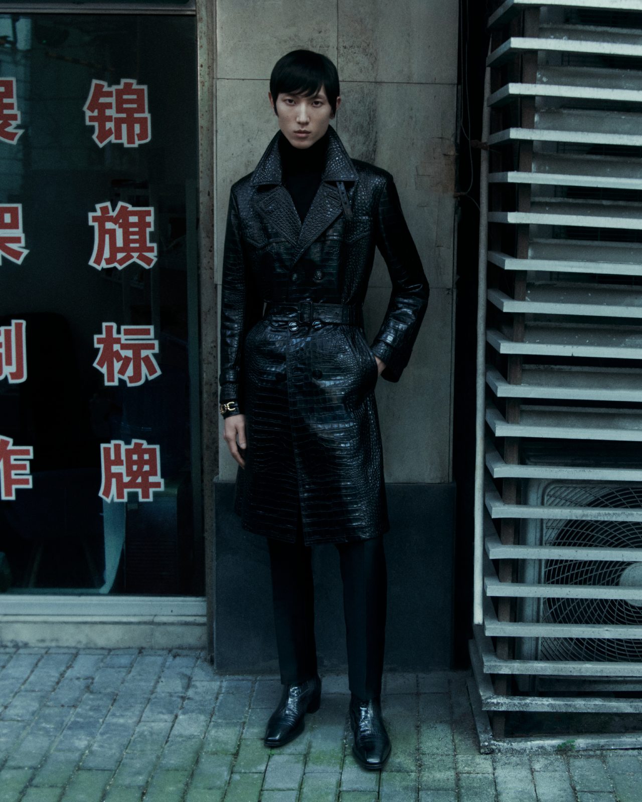 3人目の登場人物である Meng Yuqi のワードローブは、細身の革のコートやジャケット、手触りが柔らかく、長めのシガレットパンツ。洗練されたシャープさを醸し出す着こなしにビッグバッグをあわせ、上海の街を歩く彼の姿はまさに映画の主人公。