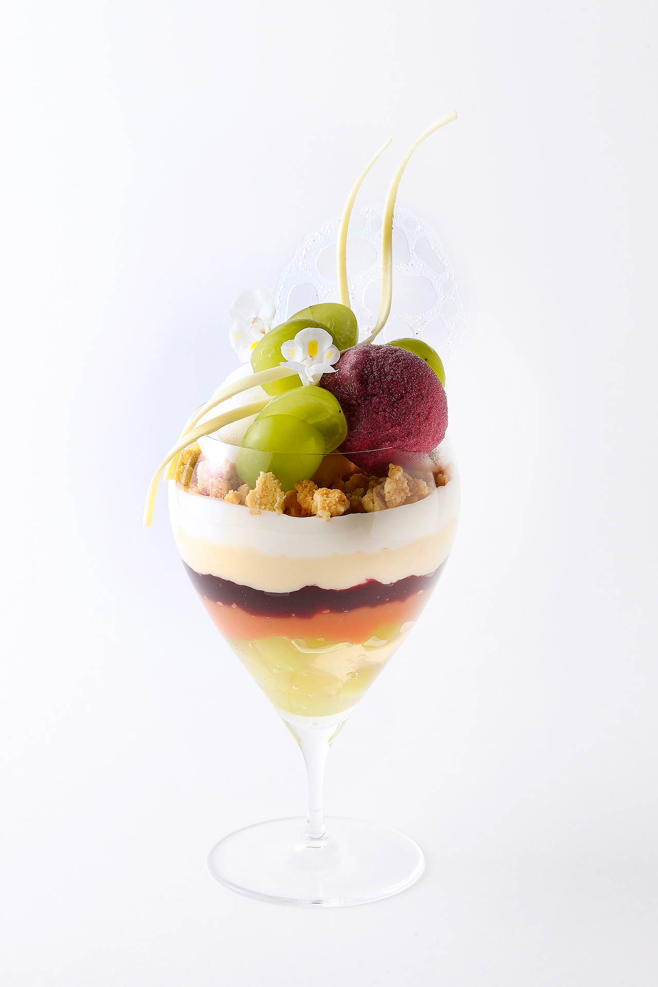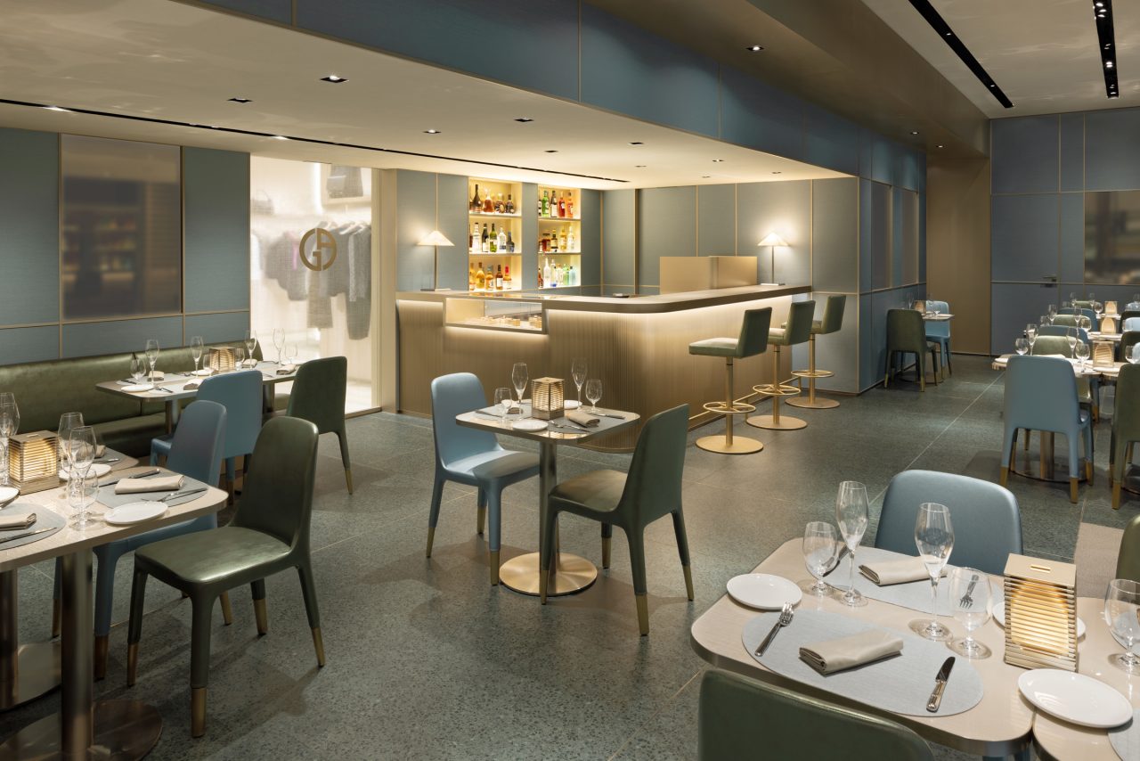 1階に併設されるカフェは、カンヌ、ドバイ、ドーハに次いで世界4店舗目。34席を有する店内には、家具ブランド ARMANI / CASA (アルマーニ/カーザ) のインテリアを配置し、緑を基調とした落ち着きのある空間に。メニューは月替わりのパフェやアフタヌーンティーのほか、幅広い客層に対応できるよう豊富に用意。また、ARMANI / DOLCI (アルマーニ/ドルチ) のスイーツも用意されており、お土産用に購入することもできる。