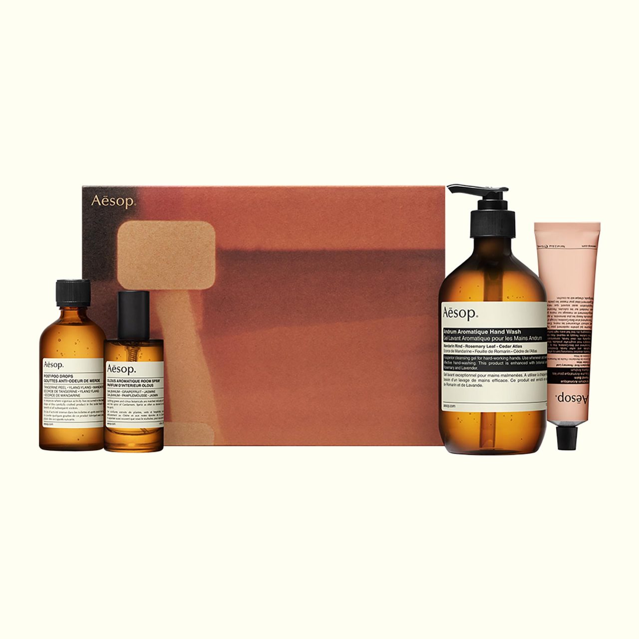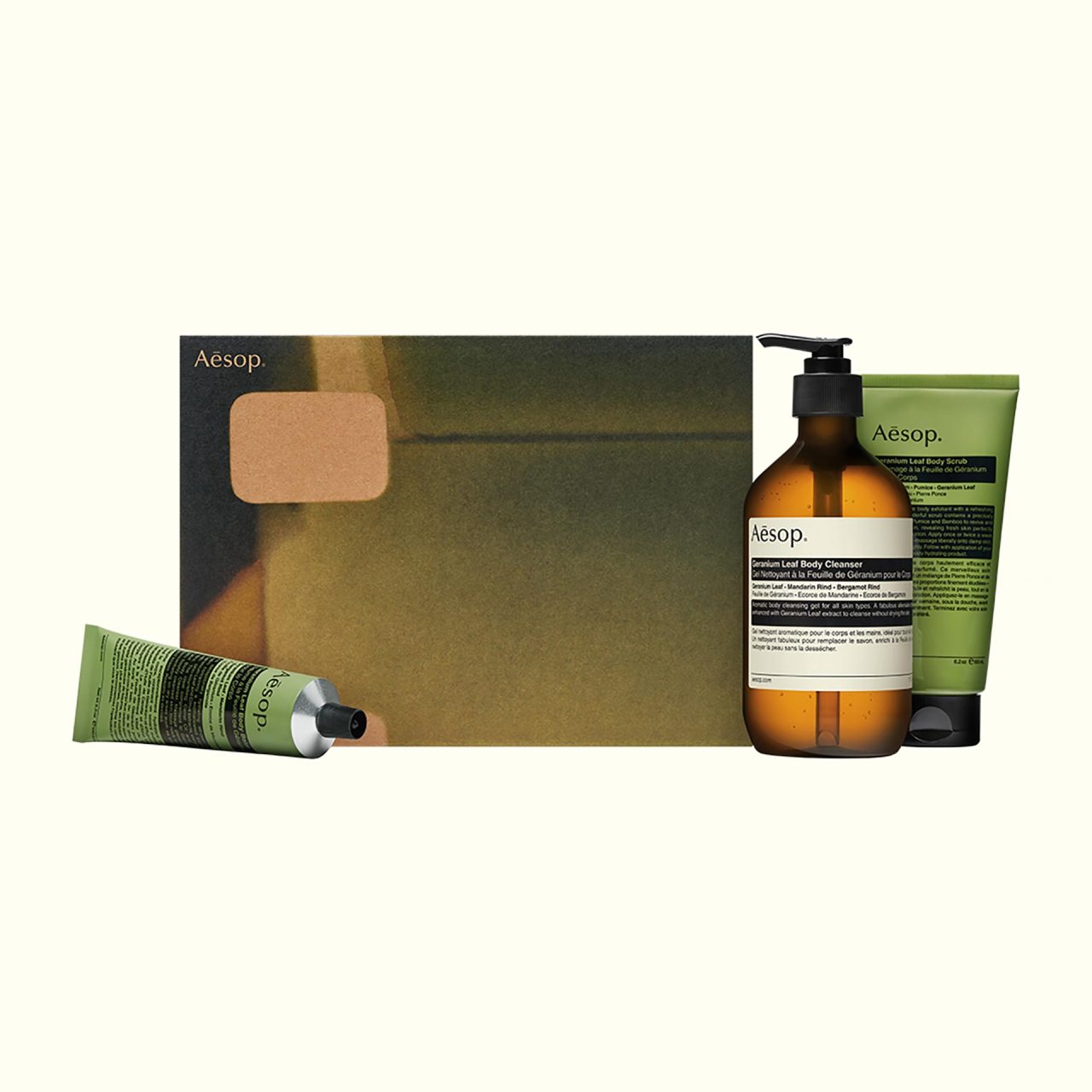 「スクリーン1」はロングセラーアイテムの4点セット。ハンドウォッシュや、ハンドクリームなどの人気商品のほか、シダーとカルダモンが香る「オロウス アロマティック ルームスプレー」や持ち歩けるトイレ用芳香剤「ポスト プー ドロップス」で構成される。「スクリーン2」はグリーンとシトラスが香るゼラニウムシリーズが主役。ボディクレンザー、ボディースクラブ、ボディバームがセットになり、全身の洗浄、角質除去、そして保湿までの行程がすべてかなう。「スクリーン3」はギフトの定番「ゼラニウム ボディクレンザー」と「アンドラム アロマティック ハンドウォッシュ」に、新作の「エレオス アロマティック ハンドバーム」が加わったボックス。シアーバターとオイルを含んだハンドバームは保湿力が高く、乾燥する季節にピッタリだ。