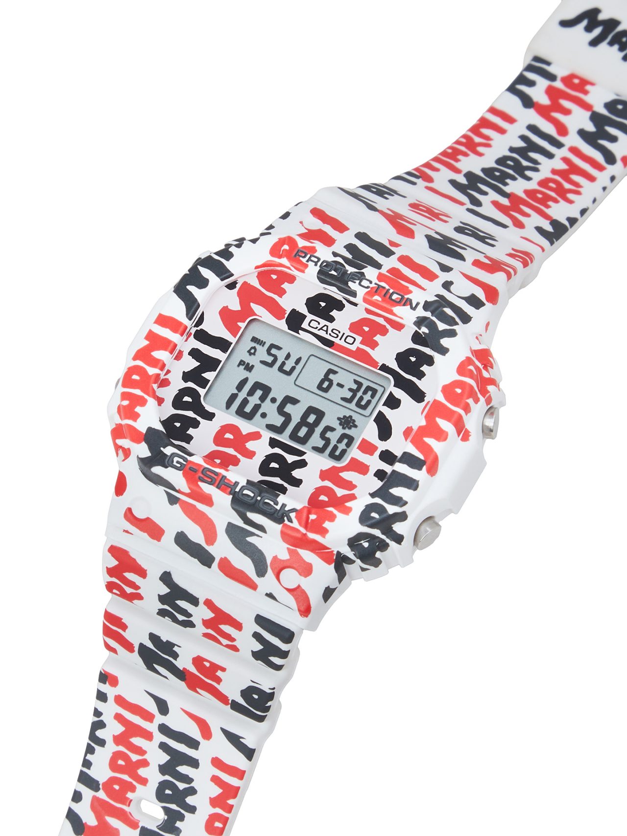 MARNI (マルニ) と G-SHOCK (ジーショック) による「GMD-S5610MA-7ER」モデルの腕時計が登場。G-SHOCK を象徴するシルエットをベースに作り上げた腕時計は、白、黒、赤を使用したハンドペイントロゴが特徴的だ。また、グラフィックモチーフになっているシグニチャーロゴは、ケースやベゼル、ストラップ、パッケージにも採用している。