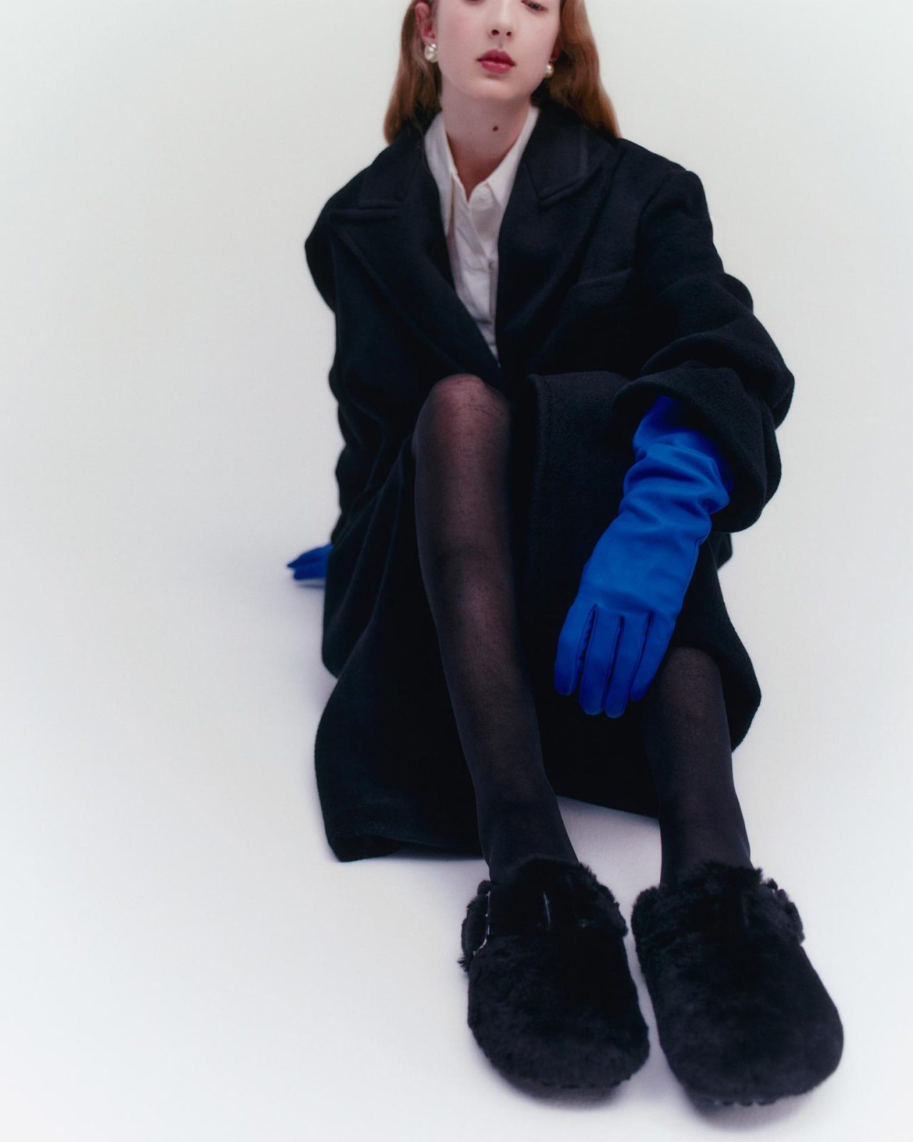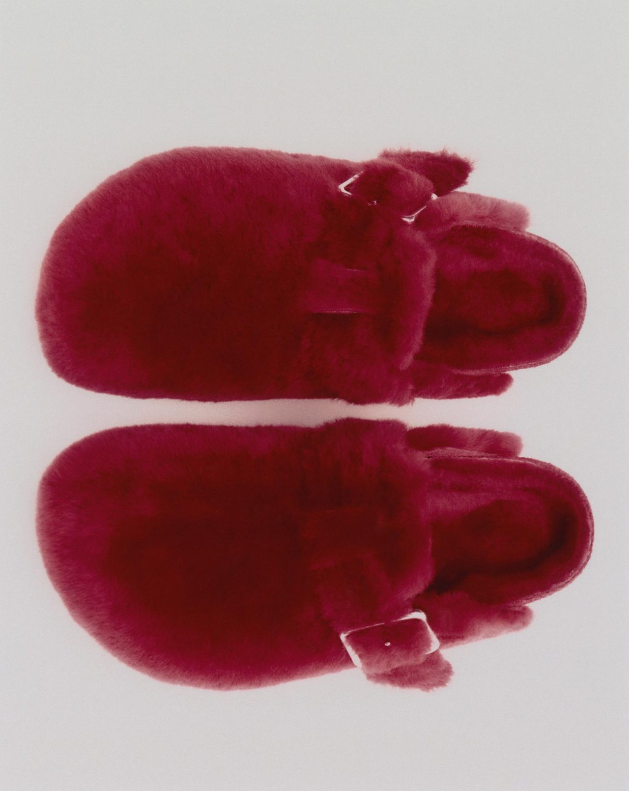 定番アイテムである ARIZONA と BOSTON は、ソフトなシアリング素材でモダンにアップデート。どちらのアイテムも、ブランドの象徴であるコルク ラテックス製のフットベッドを使用し、シアリングと同系色のスエードで仕立ててワントーンに統一した。さらに、フォレストグリーン、クリムゾンレッド、ブラックといったホリデーらしい華やかなカラーに、ゴールドとシルバーの大ぶりなバックルをあしらって、アクセントを加えている。