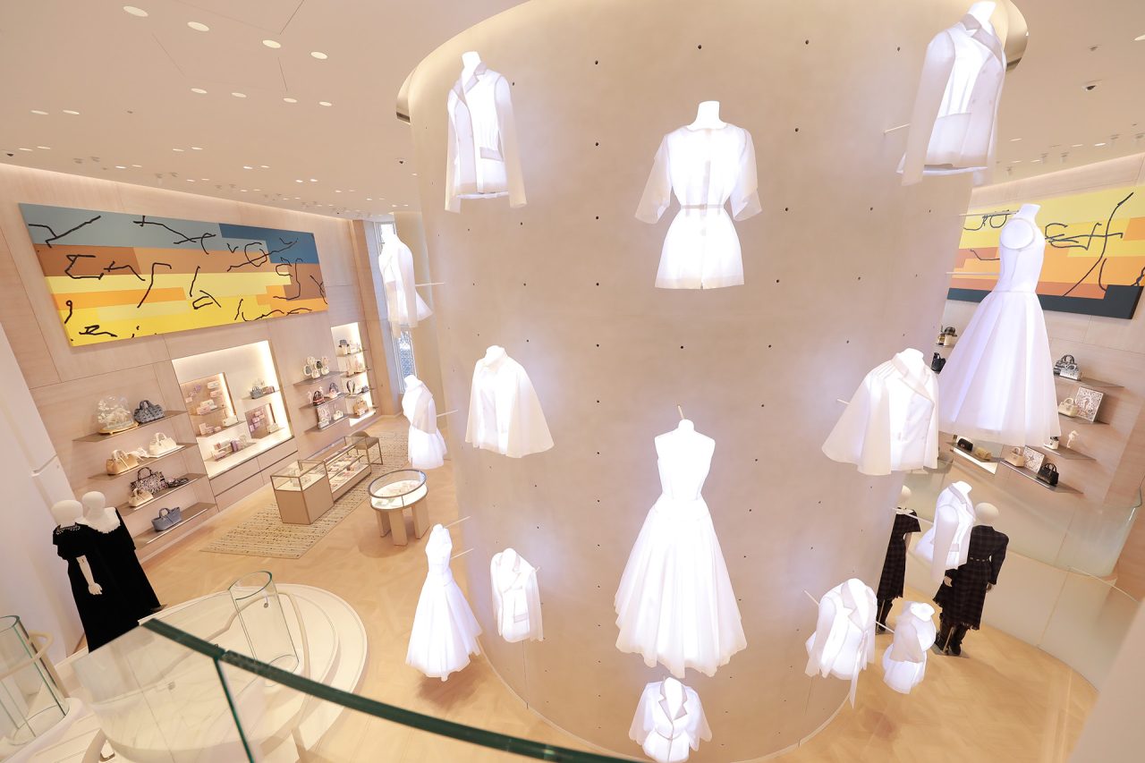 新ブティックに足を踏み入れると、そこに広がるのは白とベージュを基調とした上品な空間。店内には、ウィメンズ クリエイティブ ディレクターの Maria Grazia Chiuri (マリア・グラツィア・キウリ) がスコットランドの伝統と神話にオマージュを捧げてデザインした2025年クルーズ コレクションと、メンズ クリエイティブ ディレクターの Kim Jones (キム・ジョーンズ) によってデザインされた「ディオール アイコンズ」カプセルコレクションをはじめとするメンズ コレクションを展開する。また、オープンを記念して、イタリアの現代アーティスト Pietro Ruffo (ピエトロ・ルッフォ) がデザインした「ディオール スター」モチーフのセーターとバッグ「レディ D-ジョイ」もお目見えした。