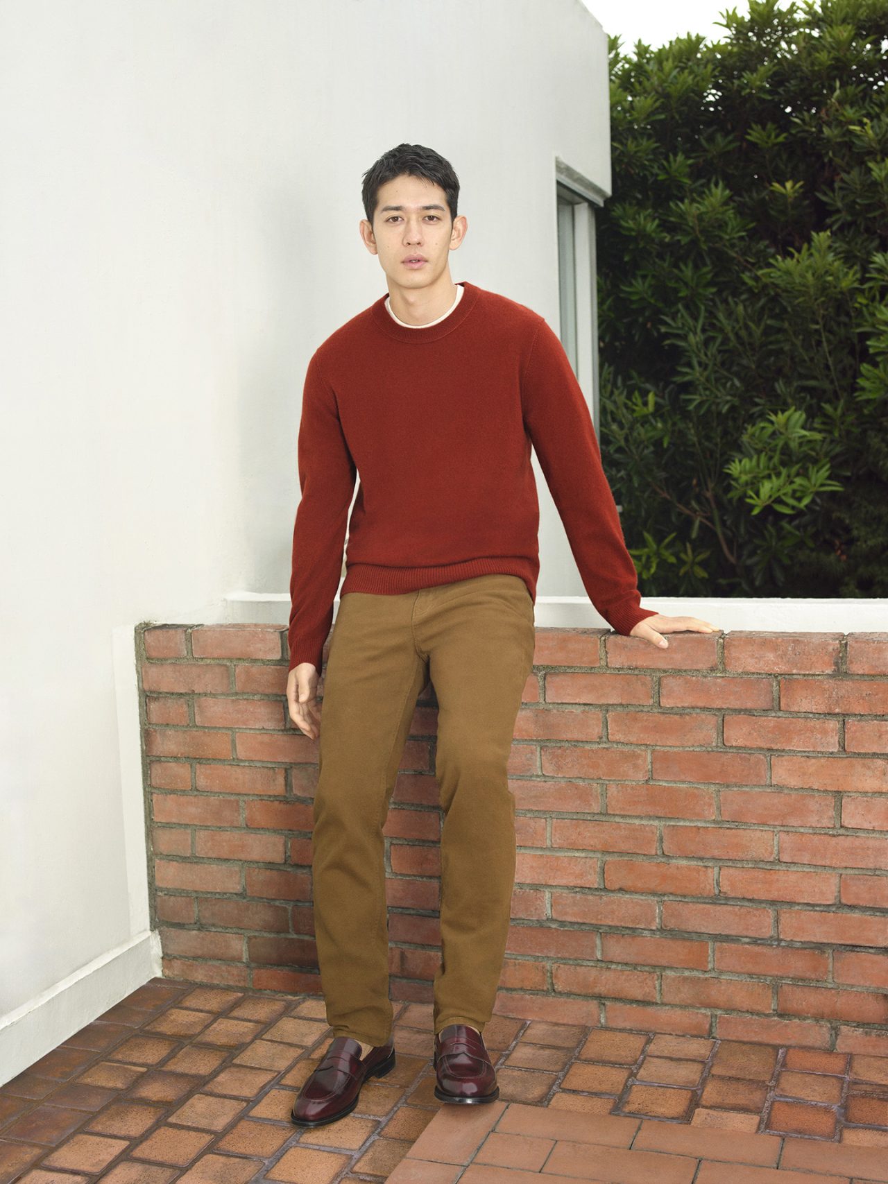 秋冬のタイムレスエッセンシャルダルシンプルなクルーネックのカシミヤニットが印象的。カシミヤ クルーネックセーター ¥24,000、スリム ブラッシュド トラベラーパンツ ¥13,500、オーセンティック ス ーピマ T シャツ ¥5,000