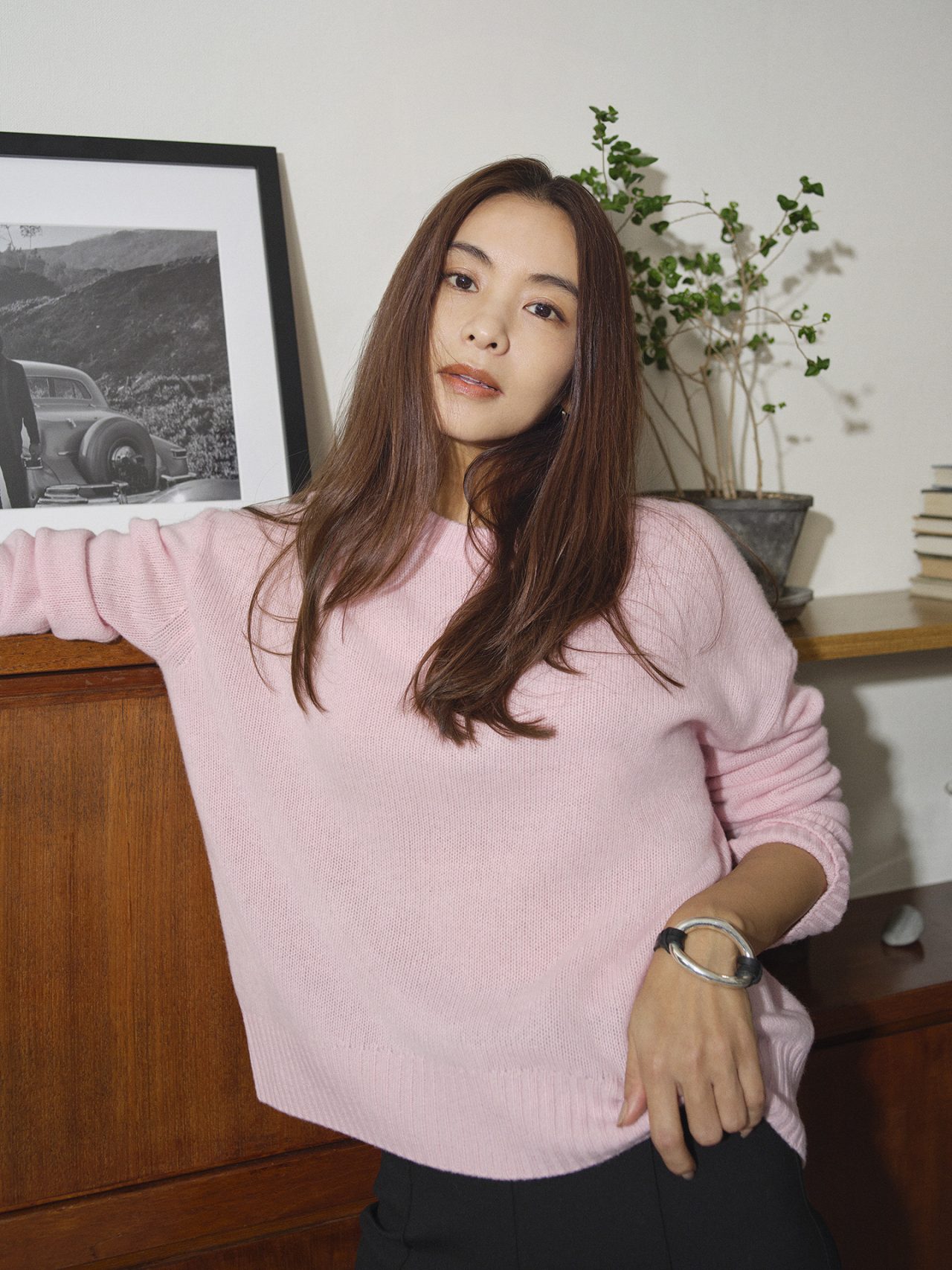 ピンクのカシミヤニットとブラックパンツの洗練されたスタイリング。オーバーサイズ ミッドウェイト カシミヤ クルーネックセーター ¥24,000、ストレート エブリウェア ポンチパンツ ¥14,000、ブレスレッ ト ¥14,000