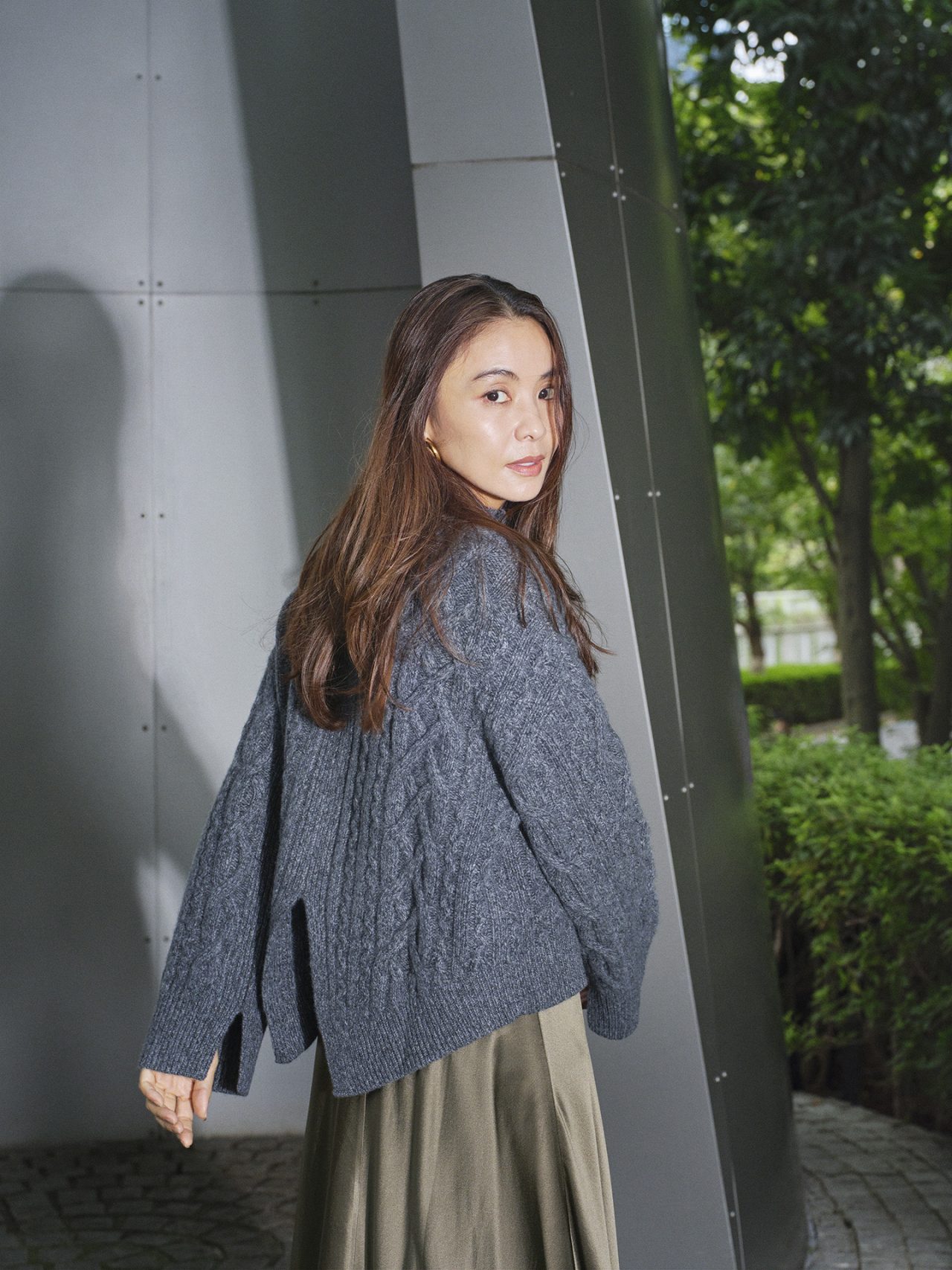 バックのスリットが小粋なアクセントを添える、グレーのカシミヤケーブルニットとシルクのスカートを合わせたドラマティックなスタイル。カシミヤ ケーブル スプリットファネルネック セーター ¥48,000、バイアスカット シルク ロングミディスカート ¥40,000